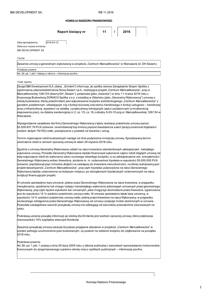 BBI DEVELOPMENT SA RB 11 2016 KOMISJA NADZORU FINANSOWEGO Raport bieżący nr Data sporządzenia: 11 / 2016 2016-03-12 Skróc ona nazwa emitenta BBI DEVELOPMENT SA Temat Zawarcie umowy z generalnym wykonawcą w projekcie „Centrum Marszałkowska” w Warszawie (d. DH Sezam). Podstawa prawna Art. 56 ust. 1 pkt 1 Ustawy o oferc ie - informac je poufne Treść raportu: Zarząd BBI Development S.A. (dalej: ,,Emitent”) informuje, że spółka celowa Zarządzanie Sezam Spółka z ograniczoną odpowiedzialnością Nowy Sezam sp.k., realizująca projekt „Centrum Marszałkowska”, przy ul. Marszałkowskiej 126/134 (dawny DH „Sezam”), podpisała (jako „Inwestor”) w dniu 11 marca 2016 roku z Korporacją Budowlaną DORACO Spółka z o.o. z siedzibą w Gdańsku (jako „Generalny Wykonawcą”) umowę o roboty budowlane, której przedmiotem jest wybudowanie budynku wielofunkcyjnego „Centrum Marszałkowska” z garażem podziemnym, składającym się z funkcji biurowej oraz domu handlowego o funkcji usługowo – handlowej wraz z infrastrukturą, wjazdami na działkę, z przebudową istniejących części podziemnych (z możliwością etapowania prac), na działce ewidencyjnej nr 2, cz. 1/3, cz. 16 z obrębu 5-03-10 przy ul. Marszałkowskiej 126/134 w Warszawie. Wynagrodzenie ryczałtowe dla firmy Generalnego Wykonawcy z tytułu realizacji przedmiotu umowy wynosi 83.526.837,79 PLN (słownie: osiemdziesiąt trzy miliony pięćset dwadzieścia sześć tysięcy osiemset trzydzieści siedem złotych 79/100) netto, powiększone o podatek od towarów i usług. Termin rozpoczęcia robót budowlanych nastąpi od dnia podpisania niniejszej umowy. Spodziewany termin ukończenia robót w ramach opisanej umowy to dzień 26 stycznia 2018 roku. Zgodnie z umową Generalny Wykonawca udzieli na rzecz Inwestora standardowych zabezpieczeń należytego wykonania umowy. Ponadto Generalny Wykonawca będzie finansował wykonanie części robót objętych umową od daty rozpoczęcia robót do wykonania stanu surowego otwartego budynku, a na zabezpieczenie ww. wierzytelności Generalnego Wykonawcy wobec Inwestora, zostanie m. in. ustanowiona hipoteka w wysokości 55.000.000 PLN (słownie: pięćdziesiąt pięć milionów złotych) na należącej do Inwestora nieruchomości, na której realizowany jest projekt deweloperski „Centrum Marszałkowska”, przy czym hipoteka ustanowiona na rzecz Generalnego Wykonawcy będzie ustanowiona na kolejnym miejscu, po obciążeniach hipotecznych ustanowionych na rzecz instytucji finansujących projekt. W umowie zastrzeżono kary umowne, płatne przez Generalnego Wykonawcę na rzecz Inwestora, w przypadku niewykonania, opóźnienia lub innego rodzaju nienależytego wykonania zobowiązań umownych przez generalnego Wykonawcę, przy czym łączna wysokość kar umownych, jakie mogą być dochodzone przez Inwestora, ograniczona jest do wysokości 15 % wartości przedmiotu umowy netto. W umowie zastrzeżono także karę umowną, w wysokości 10 % wartości przedmiotu umowy netto, płatną przez Inwestora na rzecz Wykonawcy, w przypadku skutecznego odstąpienia przez Generalnego Wykonawcę od umowy z przyczyn ściśle określonych w umowie. Pozostałe szczegółowe warunki powyższej umowy nie odbiegają od warunków powszechnie stosowanych na rynku. Podstawą uznania powyżej informacji za istotną dla Emitenta jest wartość opisanej umowy, która przekracza równowartość 10% kapitałów własnych Emitenta. Zawarcie powyższej umowy oznacza kluczowe pozytywne zdarzenie w projekcie „Centrum Marszałkowska” w postaci pełnego uruchomienia prac budowlanych, co pozwoli na oddanie budynku do użytkowania na początku 2018 roku. Podstawa prawna: Art. 56 ust. 1 pkt. 1 ustawy z dnia 29 lipca 2005 roku o ofercie publicznej i warunkach wprowadzania instrumentów finansowych do zorganizowanego systemu obrotu oraz o spółkach publicznych – informacja poufna. Komisja Nadzoru Finansowego 1 BBI DEVELOPMENT SA RB 11 2016 BBI Development SA (pełna nazwa emitenta) BBI DEVELOPMENT SA Budownic two (bud) (skróc ona nazwa emitenta) 02-566 (sektor wg. klasyfikac ji GPW w W-wie) Warszawa (kod poc ztowy) (miejscowość) Puławska 2 (ulica) (numer) (22) 204 00 40 (22) 204 00 41 (telefon) (fax) [email protected] www.bbidevelopment.pl (e-mail) (www) 526-10-22-256 010956222 (NIP) (REGON) PODPISY OSÓB REPREZENTUJĄCYCH SPÓŁKĘ Data Imię i Nazwisko Stanowisko/Funkc ja Podpis 2016-03-12 Mic hał Skotnic ki Prezes Zarządu Mic hał Skotnic ki 2016-03-12 Piotr Litwiński Członek Zarządu Piotr Litwiński Komisja Nadzoru Finansowego 2