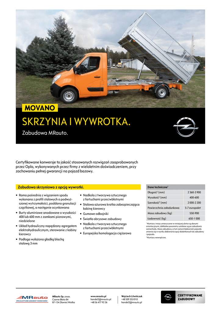 MOVANO SKRZYNIA I WYWROTKA. Zabudowa MRauto. Certyfikowane konwersje to jakość stosowanych rozwiązań zaaprobowanych przez Opla, wykonywanych przez firmy z wieloletnim doświadczeniem, przy zachowaniu pełnej gwarancji na pojazd bazowy. Zabudowa skrzyniowa z opcją wywrotki. • Rama pośrednia z wiązaniem spodu wykonana z profili stalowych o podwyższonej wytrzymałości, poddana granulacji cząstkowej, a następnie ocynkowana • Burty aluminiowe anodowane o wysokości 400 lub 600 mm z zamkami pionowymi, niedzielone • Układ hydrauliczny napędzany agregatem elektrohydraulicznym, sterowanie z kabiny kierowcy • Podłoga wyłożona gładką blachą stalową 3 mm MRauto Sp. z o.o. Czarne Błoto 84 87-134 Zławieś Wielka Dane techniczne1 • Nadkola z tworzywa sztucznego z fartuchami przeciwbłotnymi • Stalowa ażurowa kratka zabezpieczająca kabinę kierowcy • Gumowe odbojniki • Światła obrysowe zabudowy • Nadkola z tworzywa sztucznego z fartuchami przeciwbłotnymi • Europejska homologacja ciężarowa www.mrauto.pl [email protected] +48 56 477 92 36 Wojciech Litwińczuk +48 509 353 010 [email protected] Długość2 (mm) 2 360-3 900 Wysokość2 (mm) 400-600 Szerokość2 (mm) 2 000-2 200 Powierzchnia załadunkowa Masa zabudowy (kg) Ładowność (kg) 5-7 europalet 550-900 650-1 000 Wymiary i masy umieszczone w niniejszej ulotce są danymi orientacyjnymi, dokładne parametry ustalane są po zabudowie samochodu. Masa zabudowy, a tym samym ładowność pojazdu zmienia się w wyniku dobierania opcji dodatkowych do zabudowy i pojazdu. 2 Wymiary wewnętrzne. 1 ZABUDOWA TYPU SKRZYNIA / WYWROTKA Jakość • Precyzja wykonania • Dbałość o szczegóły • Trwałe elementy mechaniczne Wytrzymała konstrukcja • Odporna na korozję • Niska masa zabudowy • Większa ładowność Szczegóły • Nadkola z tworzywa sztucznego • Wzmocniona stalowa podłoga • Gumowe odbojniki WYWROTKA • Układ elektrohydrauliczny napędzany agregatem o maksymalnym wychyleniu 45 stopni • Wyładowanie na trzy strony (boki i tył) • Kratka stalowa ażurowa osłaniająca kabinę kierowcy • Panel zdalnego sterowania skrzynią wyładowczą na sprężynowym przewodzie w kabinie • Wyłącznik zasilania siłownika wywrotki • Tylna burta i opcjonalnie boczne burty wyposażone w zawiasy górne i dolne WYPOSAŻENIE DODATKOWE • • • • • • Wytrzymała plandeka wzmacniana listwami aluminiowymi, kolor do wyboru • Stalowy pałąk chroniący kabinę z tyłu • Osłony świateł tylnych • Hak holowniczy • Nadstawki burt wykonane z siatki stalowej ocynkowanej Skrzynka narzędziowa, zakabinowa lub boczna Osłony boczne przeciwnajazdowe (antyrowerowe) Samozamykacz burty tylnej i bocznych Belka oświetleniowa Żuraw HDS WYBIERZ ODPOWIEDNIĄ WERSJĘ OPLA MOVANO POD ZABUDOWĘ Podwozie z pojedynczą kabiną WERSJE H1 3 256 mm Długość i wysokość Podwozie L2 H1 FWD/RWD1 L3 H1 FWD/RWD1 L4 H1 RWD2 Dostępna również z podwójnymi tylnymi kołami (DRW) 2 Dostępna tylko z tylnymi podwójnymi kołami (DRW). L – długość nadwozia: 1 = krótka, 2 = średnia, 3 = długa, 4 = przedłużona H – wysokość nadwozia: 1 = standardowa. Napęd 4x4 tylko z napędem na tylną oś RWD. 1 SILNIKI L2 5 643 mm L3 6 293 mm L4 6 843 mm FWD Napęd na przednią oś 2.3 CDTI 110 KM S/S* * RWD Napęd na tylną oś 2.3 CDTI 125 KM BiTurbo BiTurbo 2.3 CDTI 136 KM S/S* 2.3 CDTI 163 KM S/S* S/S – Start/Stop 4x4 ESP® Start/Stop BiTurbo Napęd na wszystkie koła Wspomaganie kierowcy System oszczędzania paliwa Silniki podwójnie doładowane 2 lata/ 40 tys. km Bluetooth® USB Przeglądy Łączność