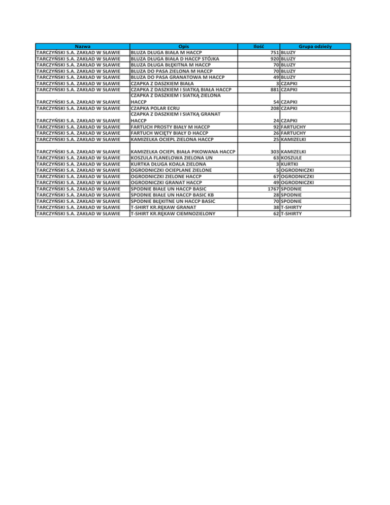 Nazwa TARCZYŃSKI S.A. ZAKŁAD W SŁAWIE TARCZYŃSKI S.A. ZAKŁAD W SŁAWIE TARCZYŃSKI S.A. ZAKŁAD W SŁAWIE TARCZYŃSKI S.A. ZAKŁAD W SŁAWIE TARCZYŃSKI S.A. ZAKŁAD W SŁAWIE TARCZYŃSKI S.A. ZAKŁAD W SŁAWIE TARCZYŃSKI S.A. ZAKŁAD W SŁAWIE TARCZYŃSKI S.A. ZAKŁAD W SŁAWIE TARCZYŃSKI S.A. ZAKŁAD W SŁAWIE TARCZYŃSKI S.A. ZAKŁAD W SŁAWIE TARCZYŃSKI S.A. ZAKŁAD W SŁAWIE Opis BLUZA DŁUGA BIAŁA M HACCP BLUZA DŁUGA BIAŁA D HACCP STÓJKA BLUZA DŁUGA BŁĘKITNA M HACCP BLUZA DO PASA ZIELONA M HACCP BLUZA DO PASA GRANATOWA M HACCP CZAPKA Z DASZKIEM BIAŁA CZAPKA Z DASZKIEM I SIATKĄ BIAŁA HACCP CZAPKA Z DASZKIEM I SIATKĄ ZIELONA HACCP CZAPKA POLAR ECRU CZAPKA Z DASZKIEM I SIATKĄ GRANAT HACCP FARTUCH PROSTY BIAŁY M HACCP FARTUCH WCIĘTY BIAŁY D HACCP KAMIZELKA OCIEPL ZIELONA HACCP TARCZYŃSKI S.A. ZAKŁAD W SŁAWIE TARCZYŃSKI S.A. ZAKŁAD W SŁAWIE TARCZYŃSKI S.A. ZAKŁAD W SŁAWIE TARCZYŃSKI S.A. ZAKŁAD W SŁAWIE TARCZYŃSKI S.A. ZAKŁAD W SŁAWIE TARCZYŃSKI S.A. ZAKŁAD W SŁAWIE TARCZYŃSKI S.A. ZAKŁAD W SŁAWIE TARCZYŃSKI S.A. ZAKŁAD W SŁAWIE TARCZYŃSKI S.A. ZAKŁAD W SŁAWIE TARCZYŃSKI S.A. ZAKŁAD W SŁAWIE TARCZYŃSKI S.A. ZAKŁAD W SŁAWIE KAMIZELKA OCIEPL BIAŁA PIKOWANA HACCP KOSZULA FLANELOWA ZIELONA UN KURTKA DŁUGA KOALA ZIELONA OGRODNICZKI OCIEPLANE ZIELONE OGRODNICZKI ZIELONE HACCP OGRODNICZKI GRANAT HACCP SPODNIE BIAŁE UN HACCP BASIC SPODNIE BIAŁE UN HACCP BASIC KB SPODNIE BŁĘKITNE UN HACCP BASIC T-SHIRT KR.RĘKAW GRANAT T-SHIRT KR.RĘKAW CIEMNOZIELONY TARCZYŃSKI S.A. ZAKŁAD W SŁAWIE TARCZYŃSKI S.A. ZAKŁAD W SŁAWIE Ilość Grupa odzieży 751 920 70 70 49 3 881 BLUZY BLUZY BLUZY BLUZY BLUZY CZAPKI CZAPKI 54 CZAPKI 208 CZAPKI 24 92 26 25 303 63 3 5 67 49 1767 28 70 38 62 CZAPKI FARTUCHY FARTUCHY KAMIZELKI KAMIZELKI KOSZULE KURTKI OGRODNICZKI OGRODNICZKI OGRODNICZKI SPODNIE SPODNIE SPODNIE T-SHIRTY T-SHIRTY