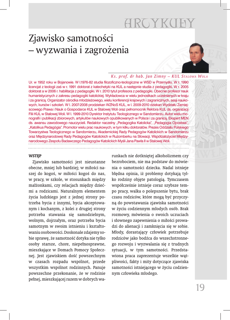 ARTYKUŁY Zjawisko samotności – wyzwania i zagrożenia K s. prof. dr hab. Jan Zimny – K UL S t a l o wa W o l a Ur. w 1952 roku w Bojanowie. W l.1976-82 studia filozoficzno-teologiczne w WSD w Przemyślu. W r. 1990 licencjat z teologii zaś w r. 1991 doktorat z katechetyki na KUL a następnie studia z pedagogiki. W r. 2005 doktorat a w 2006 r. habilitacja z pedagogiki. W r. 2010 tytuł profesora z pedagogiki. Obecnie profesor nauk humanistycznych z zakresu pedagogiki katolickiej. Wykładowca w wielu jednostkach uczelnianych w kraju i za granicą. Organizator ośrodka młodzieżowego, wielu konferencji krajowych i zagranicznych, sesji naukowych, kursów i szkoleń. W l. 2007-2008 prodziekan WZNoS KUL, w l. 2009-2010 dziekan Wydziału Zamiejscowego Prawa i Nauk o Gospodarce KUL w Stalowej Woli oraz pełnomocnik Rektora KUL ds. organizacji Filii KUL w Stalowej Woli. W l. 1999-2010 Dyrektor Instytutu Teologicznego w Sandomierzu. Autor wielu monografii i publikacji zbiorowych, artykułów naukowych opublikowanych w Polsce i za granicą. Ekspert MEN ds. awansu zawodowego nauczycieli. Redaktor naczelny „Pedagogika Katolicka”, „Pedagogia Ojcostwa”, „Katolikus Pedagógia”. Promotor wielu prac naukowych, w tym kilku doktoratów. Prezes Oddziału Polskiego Towarzystwa Teologicznego w Sandomierzu, Akademickiej Rady Pedagogów Katolickich w Sandomierzu oraz Międzynarodowej Rady Pedagogów Katolickich w Rużomberku na Słowacji. Współzałożyciel Międzynarodowego Zespołu Badawczego Pedagogów Katolickich Myśli Jana Pawła II w Stalowej Woli. Wstęp Zjawisko samotności jest nieustanne obecne, mniej lub bardziej; w miłości naszej do kogoś, w miłości kogoś do nas, w pracy, w szkole, w stosunkach między małżonkami, czy relacjach między dziećmi a rodzicami. Naturalnym elementem życia ludzkiego jest z jednej strony potrzeba bycia z innymi, bycia akceptowanym i kochanym, z kolei z drugiej strony potrzeba stawania się samodzielnym, wolnym, dojrzałym, oraz potrzeba bycia samotnym w swoim istnieniu i kształtowaniu osobowości. Doskonale zdajemy sobie sprawę, że samotność dotyka nie tylko osoby starsze, chore, niepełnosprawne, mieszkające w Domach Pomocy Społecznej. Jest zjawiskiem dość powszechnym w czasach rozpadu wspólnot, przede wszystkim wspólnot rodzinnych. Panuje powszechne przekonanie, że w rodzinie pełnej, mieszkającej razem w dobrych wa- runkach nie dotkniętej alkoholizmem czy bezrobociem, nie ma podstaw do mówienia o samotności dziecka. Nadal istnieje błędna opinia, iż problemy dotykają tylko rodziny objęte patologią. Tymczasem współcześnie istnieje coraz szybsze tempo pracy, walka o polepszenie bytu, brak czasu rodziców, które mogą być przyczyną do powstawania zjawiska samotności w życiu codziennym młodych osób. Brak rozmowy, mówienia o swoich uczuciach i słownego zapewnienia o miłości prowadzi do alienacji i zamknięcia się w sobie. Młody, dorastający człowiek potrzebuje rodziców jako bodźca do wszechstronnego rozwoju i wyzwalania się z trudnych sytuacji, w tym samotności. Przedstawiona praca zaprezentuje wszelkie wątpliwości, fakty i mity dotyczące zjawiska samotności istniejącego w życiu codziennym człowieka młodego. 19 ARTICLES 20 1. Ku jakiej samotności człowieka? Samotność człowieka należy do zjawisk ludzkiej egzystencji. Człowieka w całym jego życiu spotykają różne sytuacje, chwile dobre i złe. Tuż obok takich uczuć jak miłość, wolność, zadowolenie towarzyszy ludziom również uczucie samotności. Zjawisko to jest trudno zdefiniować, ponieważ cechuje je niewyrażalność i wieloznaczność. Nie ma jednej definicji, która opisywałaby to zjawisko. Jest ono trudno określić, zwłaszcza w sferze osób młodych. W dzisiejszym świecie jest niezmiernie ważne to, aby dostrzec drugiego człowieka w życiu codziennym. Człowieka, który zmaga się z wieloma trudnymi sprawami i zaskakującymi zmianami. Niezmiernie ważną rzeczą jest zauważenie dzieci i młodzieży, którzy mogą czuć się samotni w rodzinie. Samotność wśród najbliższych jest coraz bardziej zauważanym problemem w dzisiejszych czasach. Istotnym aspektem obserwacji jest postrzeganie samotności jako zjawiska o wymiarze pozytywnym i negatywnym. Dla jednej grupy osób, samotność może być bolesnym uczuciem, które towarzyszy na co dzień, odbierając sens życia. Natomiast dla innych ludzi zjawisko to może oznaczać powód do rozwijania swoich talentów i umiejętności oraz wykorzystanie ciszy jaka im towarzyszy do kontemplowania nad swoim życiem i modlitwie. Objawy zjawiska samotności wobec warstw problemów współczesności dotykają w coraz większym stopniu wartości rodziny. Z kolei problemy samotności młodzieży można odnaleźć w osłabionych więziach rodzinnych oraz w sytuacjach kryzysowych rodziny. Samotność to niewyobrażalnie złożone zjawisko, bardzo trudne do jedno1 znacznego zdefiniowania. Samotność jest nieustannie obecna w życiu każdego człowieka, w pracy, w szkole, w małżeństwie, w stosunkach między dziećmi a rodzicami. Naturalnym elementem ludzkiej egzystencji jest z jednej strony potrzeba bycia z innymi ludźmi i życia pośród nich, bycia kochanym, rozumianym natomiast z drugiej strony potrzeba stawania się samodzielnym, odpowiedzialnym, wolnym, oraz potrzeba bycia samotnym w swoim zaistniałym życiu i kształtowania jedynej w swoim rodzaju osobowości. Samotność może być postrzegana jako problem w skali społecznej, który dotyczy ludzi i człowieka jako jednostki tworzącej społeczeństwo. Istnieje różne pochodzenie, oblicza, charakter i poziom ludzkiego osamotnienia. Określenie pojęć związanych z samotnością jest nie jest prostym zadaniem, ponieważ trudno je zdefiniować w kontekście naukowym1. Literatura naukowa nie posiada jednoznacznego wyjaśnienia definicji hasła samotności. Jest to związane z tym, że zjawisko to jest bardzo złożone, nieu