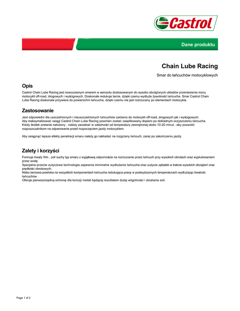 Dane produktu Chain Lube Racing Smar do łańcuchów motocyklowych Opis Castrol Chain Lube Racing jest nowoczesnym smarem w aerozolu dostosowanym do wysoko obciążonych układów przeniesienia mocy motocykli off-road, drogowych i wyścigowych. Doskonale redukuje tarcie, dzięki czemu wydłuża żywotność łańcucha. Smar Castrol Chain Lube Racing doskonale przywiera do powierzchni łańcucha, dzięki czemu nie jest rozrzucany po elementach motocykla. Zastosowanie Jest odpowiedni dla uszczelnionych i nieuszczelnionych łańcuchów zarówno do motocykli off-road, drogowych jak i wyścigowych. Aby maksymalizować osiągi Castrol Chain Lube Racing powinien zostać zaaplikowany dopiero po dokładnym oczyszczeniu łańcucha. Kiedy środek zostanie nałożony , należy zaczekać w zależności od temperatury zewnętrznej około 10-20 minut , aby pozwolić rozpuszczalnikom na odparowanie przed rozpoczęciem jazdy motocyklem. Aby osiągnąć lepsze efekty penetracji smaru należy go nakładać na rozgrzany łańcuch, zaraz po zakończeniu jazdy. Zalety i korzyści Formuje trwały film , pół suchy typ smaru z wyjątkową odpornościa na rozrzucanie przez łańcuch przy wysokich obrotach oraz wypłukiwaniem przez wodę. Specjalna przeciw zużyciowa technologia zapewnia minimalne wydłużanie łańcucha oraz zużycie zębatek w trakcie wysokich obciążeń oraz prędkości obrotowych. Nisko tarciowa powłoka na wszystkich komponentach łańcucha redukująca pracę w podwyższonych temperaturach wydłużając trwałość łańcuchów . Oferuje pierwszorzędną ochronę dla korozji metali będącej rezultatem dużej wilgotności i działania soli. Page 1 of 2 Typowa charakterystyka Nazwa Metoda Jednostka Wartość typowa Gęstość @ 20ºC ASTM D4052 Kg/dm³ 0.808 Temperatura zapłonu ASTM D92 ºC <0 Specyfikacje i dopuszczenia Chain Lube Racing is suitable for standard O-ring, X-ring and Z-ring type chains fitted on motorcycles from leading European and Japanese Manufacturers Przechowywanie i magazynowanie Wszelkie opakowania powinny być przechowywane w zadaszonych pomieszczeniach. Jeżeli opakowania przechowuje się na otwartej przestrzeni, gdzie mogą być narażone na opady atmosferyczne, należy je ustawić w pozycji poziomej, tak aby uniemożliwić dostęp wody oraz zapobiec zniszczeniu oznakowania opakowań. Produkty nie mogą być przechowywane w temperaturze wyższej niż 60°C, ani też narażone na działanie promieni słonecznych lub bardzo niskich temperatur. Chain Lube Racing 29 Apr 2015 Castrol, the Castrol logo and related marks are trademarks of Castrol Limited, used under licence. Prawne wylaczenie Karta produktu i informacje w niej zawarte sa aktualne w momencie jej tworzenie i wydruku. Jednakze , nie dajemy gwarancji ze prezentowane wyrazenia lub zasugerowane zwroty , sa dokladne, precyzyjne i kompletne. Dane zawarte sa oparte na testach wykonanych w warunkach laboratoryjnych i nalezy je traktowac jako wskazówke i ogólna informacje. Uzytkownikom radzimy upewnic sie ze korzystaja z najnowszej wersji karty danych. Uzytkownicy sa odpowiedzialni za bezpieczne uzycie produktu , zgodnie z zastosowaniem i odpowiednim doborem , stosujac sie do wszystkich odpowiednich regulacji i wymagan prawnych. Karta bezpieczenstwa produktu SDS jest dostepna dla wszystkich produktów i powinna byc wykorzystana dla odpowiedniego skladowania, bezpiecznego zastosowania, oraz usuwania , utylizacji produktu. BP , jej filie oraz podmioty wspólpracujace nie ponosza odpowiedzialnosci za jakiekolwiek szkody , zniszczenia i urazy bedace rezultatem nieodpowiedniego uzycia produktu , za jakiekolwiek awarie powstale w wyniku zastosowania niezgodnie z rekomendacja produktu oraz za zagrozenia wlasciwe dla natury i srodowiska . Wszystkie produkty , serwis , obsluga i informacje sa dostarczane zgodnie z standardowymi warunkami sprzedazy. Jesli wymagane sa dodatkowe informacje nalezy sie skontaktowac z lokalnym przedstawicielem sprzedazy. BP Europa SE, Oddzial w Polsce, Warszawa, ul.Chlodna 51, 00-867 Warszawa 0 22 582 65 00 www.castrol.pl Page 2 of 2