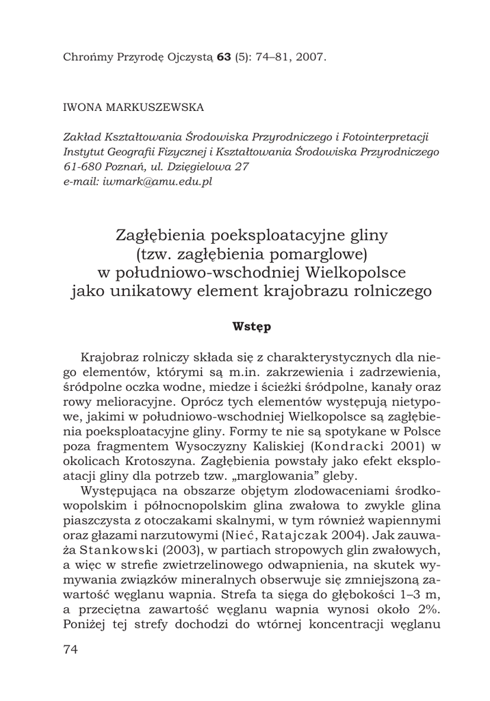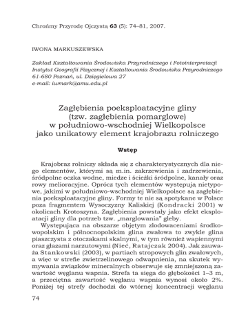 Chrońmy Przyrodę Ojczystą 63 (5): 74–81, 2007. IWONA MARKUSZEWSKA Zakład Kształtowania Środowiska Przyrodniczego i Fotointerpretacji Instytut Geografii Fizycznej i Kształtowania Środowiska Przyrodniczego 61-680 Poznań, ul. Dzięgielowa 27 e-mail: [email protected] Zagłębienia poeksploatacyjne gliny (tzw. zagłębienia pomarglowe) w południowo-wschodniej Wielkopolsce jako unikatowy element krajobrazu rolniczego Wstęp Krajobraz rolniczy składa się z charakterystycznych dla niego elementów, którymi są m.in. zakrzewienia i zadrzewienia, śródpolne oczka wodne, miedze i ścieżki śródpolne, kanały oraz rowy melioracyjne. Oprócz tych elementów występują nietypowe, jakimi w południowo-wschodniej Wielkopolsce są zagłębienia poeksploatacyjne gliny. Formy te nie są spotykane w Polsce poza fragmentem Wysoczyzny Kaliskiej (Kondracki 2001) w okolicach Krotoszyna. Zagłębienia powstały jako efekt eksploatacji gliny dla potrzeb tzw. „marglowania” gleby. Występująca na obszarze objętym zlodowaceniami środkowopolskim i północnopolskim glina zwałowa to zwykle glina piaszczysta z otoczakami skalnymi, w tym również wapiennymi oraz głazami narzutowymi (Nieć, Ratajczak 2004). Jak zauważa Stankowski (2003), w partiach stropowych glin zwałowych, a więc w strefie zwietrzelinowego odwapnienia, na skutek wymywania związków mineralnych obserwuje się zmniejszoną zawartość węglanu wapnia. Strefa ta sięga do głębokości 1–3 m, a przeciętna zawartość węglanu wapnia wynosi około 2%. Poniżej tej strefy dochodzi do wtórnej koncentracji węglanu 74 wapnia (do 14%), który występuje tam w postaci gruboziarnistych skupień – tzw. margla*. Obecnie najprostszym sposobem neutralizacji kwaśnego odczynu gleby jest wapnowanie. Wcześniej stosowano „marglowanie” polegające na tym, że wydobytą z głębokości 3–5 m glinę z zawartym w niej węglanem wapnia rozprowadzano na polach uprawnych. Zabiegi te przynoszą skuteczne oraz długotrwałe efekty, lecz choć znane od dawna, wykorzystywane są rzadko i na ogół na małym obszarze ze względu na duże nakłady pracy (Niegodzisz 1993). Marglowanie gleby w południowo-wschodniej Wielkopolsce było elementem technik uprawy roli stosowanych przez osadników niemieckich. O analogicznej powszechności marglowania gleb na terenie Niemiec świadczy obecność tego samego typu zagłębień na terenie Brandenburgii i Meklemburgii (Geinitz 1920, Gripp 1924, Woldstedt 1929). Celem badań przeprowadzonych w latach 1999–2005 na całym obszarze występowania „zagłębień pomarglowych” w Wielkopolsce było określenie wpływu tych antropogenicznych form poeksploatacyjnych gliny na kształtowanie krajobrazu rolniczego. Występowanie i charakterystyka zagłębień Pozyskiwanie gliny w celu marglowania gleby w południowo-wschodniej Wielkopolsce rozpoczęto w II połowie XIX w., natomiast zakończono w latach 50-tych XX w. W miejscach wybranego surowca powstały płytkie zagłębienia wypełnione często wodą, które od momentu powstania podlegały zmianom, na skutek oddziaływania czynników naturalnych oraz antropogenicznych. Z uwagi na bezpieczeństwo wykonywanych prac agrotechnicznych, spod uprawy wyłączano teren otaczający zagłębienia o szerokości ok. 1 m. Te pierścienie nieużytków stały się obszarem sukcesji wtórnej. *Należy wyjaśnić, że margiel to skała osadowa wapnista z dużą domieszką minerałów ilastych. Tą samą nazwą są również określane silnie zwapnione gliny zwałowe (Flis 1995). Z tego powodu gleby powstające na glinach zwałowych charakteryzuje niedosyt węglanu wapnia, czego konsekwencją jest zakwaszenie. 75 O intensywności prowadzonej eksploatacji świadczy bardzo duża liczba tych zagłębień. Przeprowadzona analiza kartograficzna wykazała, że pod koniec XIX w. na obszarze niespełna 100 tys. ha znajdowało się ok. 14 500 zagłębień, zaś 50 lat później naliczono ich ok. 8 000. Przeprowadzenie melioracji gruntów rolnych wpłynęło na obniżenie poziomu wody w zagłębieniach, co przyczyniło się do zasypania zagłębień i włączenia tych terenów do areału uprawnego. W latach 80-tych XX w. na obszarze znacznie mniejszym od pierwotnego (ok. 35 tys. ha) znajdowało się ok. 2 700 zagłębień, zaś obecnie ich liczbę szacuje się na 1 430. Około 50 lat temu maksymalna głębokość wyrobisk dochodziła do 4 m (Bartkowski 1949), natomiast obecnie nie przekracza 1,5 m, choć wiele obiektów nie posiada już formy wklęsłej, jakkolwiek zwykle towarzyszy im roślinność drzewiasta lub krzewiasta. Ponad 50 lat temu skrajne wartości powierzchni zagłębień wahały się w przedziale 140–6 400 m², zaś obecnie 3–1000 m², przy czym najliczniej reprezentowane są zagłębienia o powierzchni nie przekraczającej 50 m². Aktualnie zagłębienia zajmują powierzchnię ok. 6 ha na obszarze niespełna 35 tys. ha występowania tych obiektów. Wraz ze zmianą powierzchni zagłębień zmieniał się również ich kształt. Dawniej przybierały one owalny kształt z wyraźną różnicą pomiędzy osią dłuższą, a krótszą (np. 7×20 m, 3×80 m, 15×30 m, 6×100 m), zaś obecnie zbliżone są do koła. Wielkość powierzchni zagłębień jest uzależniona od ich zagęszczenia. Na obszarze największego zagęszczenia zagłębień (do 25 obiektów na 1 km²) ich indywidualna powierzchnia waha się od 6 do 50 m². Natomiast tam, gdzie liczba badanych form nie przekracza 5 na 1 km², powierzchnia zagłębień zawiera się w przedziale 30–225 m². Cechą charakterystyczną zagłębień poeksploatacyjnych jest specyficzny sposób ich występowania. Na polach uprawnych o układzie łanowym, gdzie działki przybierają wydłużony kształt, eksploatacja gliny prowadzona była wzdłuż ścieżek i miedz śródpolnych, aby maksymalnie zaoszczędzić użytkowaną powierzchnię rolniczą. Z tego względu na tych obszarach zagłębienia występują w postaci równo