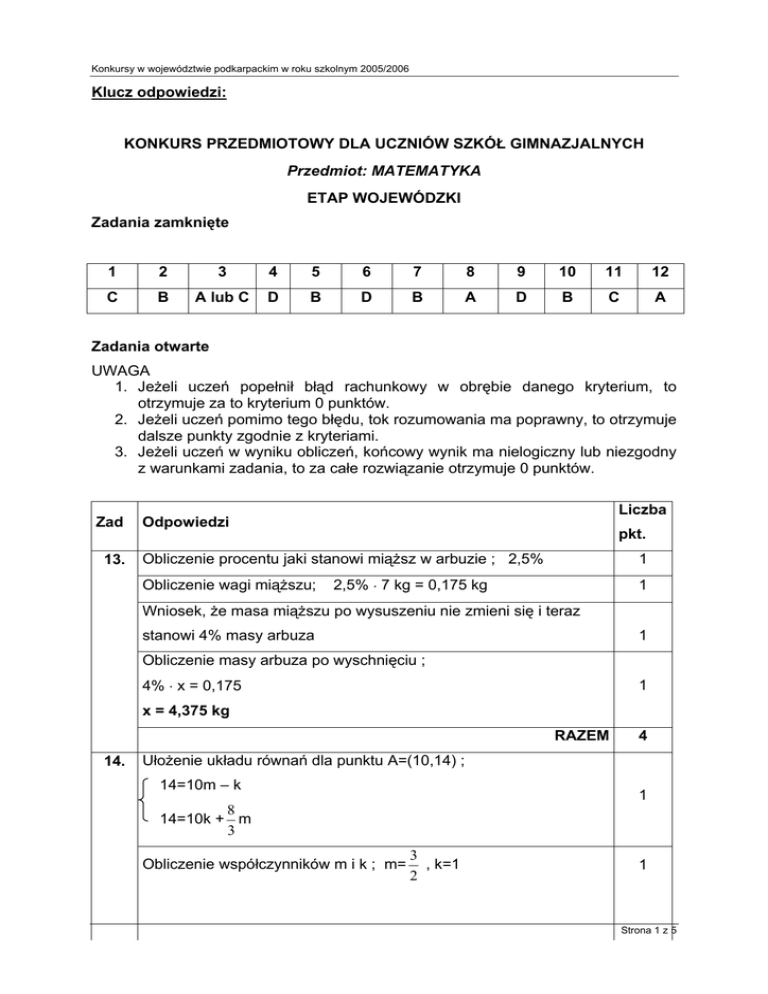 Konkursy w województwie podkarpackim w roku szkolnym 2005/2006 Klucz odpowiedzi: KONKURS PRZEDMIOTOWY DLA UCZNIÓW SZKÓŁ GIMNAZJALNYCH Przedmiot: MATEMATYKA ETAP WOJEWÓDZKI Zadania zamknięte 1 2 3 4 5 6 7 8 9 10 11 12 C B A lub C D B D B A D B C A Zadania otwarte UWAGA 1. Jeżeli uczeń popełnił błąd rachunkowy w obrębie danego kryterium, to otrzymuje za to kryterium 0 punktów. 2. Jeżeli uczeń pomimo tego błędu, tok rozumowania ma poprawny, to otrzymuje dalsze punkty zgodnie z kryteriami. 3. Jeżeli uczeń w wyniku obliczeń, końcowy wynik ma nielogiczny lub niezgodny z warunkami zadania, to za całe rozwiązanie otrzymuje 0 punktów. Zad 13. Liczba Odpowiedzi pkt. Obliczenie procentu jaki stanowi miąższ w arbuzie ; 2,5% Obliczenie wagi miąższu; 1 2,5% ⋅ 7 kg = 0,175 kg 1 Wniosek, że masa miąższu po wysuszeniu nie zmieni się i teraz stanowi 4% masy arbuza 1 Obliczenie masy arbuza po wyschnięciu ; 4% ⋅ x = 0,175 1 x = 4,375 kg RAZEM 14. 4 Ułożenie układu równań dla punktu A=(10,14) ; 14=10m – k 1 8 14=10k + m 3 Obliczenie współczynników m i k ; m= 3 , k=1 2 1 Strona 1 z 5 Konkursy w województwie podkarpackim w roku szkolnym 2005/2006 Wyznaczenie wzorów funkcji; y = 1,5x – 1 1 y=x+4 Wykonanie rysunku zgodnego z warunkami zadania 1 Wyznaczenie podstawy i wysokości trójkąta i obliczenie pola trójkąta; 1 P=0,5 ⋅ 5 ⋅ 10 = 25 j2 RAZEM 5 15. 1 Zapisanie całej drogi którą przebył Jurek s= 24 ⋅ (t1+ t2) Zapisanie pierwszego odcinka drogi, jaką przebył Jurek w czasie t1 lub czasu pierwszego odcinka 1 1 s= 30 ⋅ t1 2 Zapisanie drugiego odcinka drogi, jaką przebył Jurek w czasie t2 lub czasu drugiego odcinka 1 s= V2 ⋅ t2 2 t2 = t - t1 1 s= V2 ⋅ (t - t1) 2 1 Strona 2 z 5 Konkursy w województwie podkarpackim w roku szkolnym 2005/2006 Zapisanie równania 24 (t1 + t2)= 60 ⋅ t1 3 t 2 = t1 lub zależności 2 1 prowadzącej do obliczenia V2 3 Obliczenie prędkości z jaką przejechał drugi odcinek; 30⋅t1=V2⋅ t1 2 1 V2= 20 km/h RAZEM 16. Zauważenie, że długość jednej krawędzi jest wspólnym dzielnikiem liczb 18 i 45 i może wynosić 1 lub 3 lub 9 2 Prawidłowo podane wymiary prostopadłościanu; 1,18,45 1 Prawidłowo podane wymiary prostopadłościanu; 3, 6, 15 1 Prawidłowo podane wymiary prostopadłościanu; 9, 2, 5 1 RAZEM 17. 5 5 Rysunek zgodny z warunkami zadania x, y – przyprostokątne r – promień okręgu wpisanego w trójkąt 1 R – promień okręgu opisanego na trójkącie Odpowiednie oznaczenie długości odcinków na rysunku, w tym zauważenie, że przeciwprostokątna równa się średnicy wielkiego okręgu. Zauważenie równości odpowiednich odcinków: x-r, y-r w powstałych deltoidach. Zapisanie równości zgodnej z treścią zadania; 1 1 y - r +x – r = 2R Wykazanie że równość jest prawidłowa; x + y = 2R + 2r 1 RAZEM 4 Strona 3 z 5 Konkursy w województwie podkarpackim w roku szkolnym 2005/2006 18. Rysunek zgodny z warunkami zadania 1 r – promień podstawy walca, h –wysokość walca; R – promień podstawy stożka; H – wysokość stożka Odpowiednie oznaczenie długości odcinków na rysunku : h, r, H, R, Zauważenie zależności w trójkącie o kątach: 30o, 60o, 90o prowadzących do obliczenia H i R, lub ułożenie proporcji prowadzącej do obliczenia R i H, np a – długość boku trójkąta; a 3 1 a a 3 2 = 2 ; a = 2R ; H = 1 2 6 a−3 2 1 Obliczenie promieni podstawy walca i stożka: r = 3 cm; R = (2 3 +3 ) cm lub Wyznaczenie długości boku trójkąta a = 4 3 + 6 1 Obliczenie: wysokości walca i stożka: h = 6 cm, H = R 3 cm, H = ( 6 + 3 3 ) cm 1 Zna wzory na obliczanie objętości walca i stożka i prawidłowo 1 podstawia do wzoru; Vs= π (2 3 + 3)2 (6 +3 3 ) cm3; 3 2 3 Vw = 3 6 π cm Obliczenie objętości walca i stożka z jednostką: Vw=54 π cm3 ; Vs = ( 78 + 45 3 ) cm3 1 1 Strona 4 z 5 Konkursy w województwie podkarpackim w roku szkolnym 2005/2006 Obliczenie stosunku objętości walca do objętości stożka: Vw 54π = lub Vs (78 + 45 3)π ( ) ( 18 ⋅ 26 − 15 3 = = 18 26 − 15 3 26 2 − 15 2 ⋅ 3 26 + 15 3 lub 468 - 270 3 lub około 0,34 18 1 ) RAZEM 7 Jeżeli uczeń poprawnie rozwiązał zadanie inną niż podana w schemacie rozwiązania metodą otrzymuje maksymalną liczbę punktów za to zadanie. Strona 5 z 5