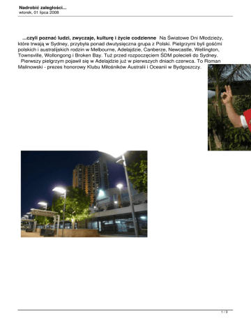 Nadrobić zaległości... wtorek, 01 lipca 2008 ...czyli poznać ludzi, zwyczaje, kulturę i życie codzienne Na Światowe Dni Młodzieży, które trwają w Sydney, przybyła ponad dwutysięczna grupa z Polski. Pielgrzymi byli gośćmi polskich i australijskich rodzin w Melbourne, Adelajdzie, Canberze, Newcastle, Wellington, Townsville, Wollongong i Broken Bay. Tuż przed rozpoczęciem ŚDM polecieli do Sydney. Pierwszy pielgrzym pojawił się w Adelajdzie już w pierwszych dniach czerwca. To Roman Malinowski - prezes honorowy Klubu Miłośników Australii i Oceanii w Bydgoszczy. 1/3 Nadrobić zaległości... wtorek, 01 lipca 2008 2/3 Nadrobić zaległości... wtorek, 01 lipca 2008 Lidia Mikołajewska: Swoją obecną podróż do Australii rozpocząłeś od Adelajdy... Bydgoszczy. przygotować papieżem zdaniem zakochany. wywiad kraju, tysiące nakręciłem tych Myśli 2000 Tak, isamym siedem wrażenia kilometrów. ze warto w zdjęć mną 22 O Sydney "grunt" Tę lat tej kasety przy na wybrałem zpielgrzymkę temu, mojej tej łamach Wykonałem do tej i-wojnie podróży pomóc filmu, to okazji tej zwiedziłem "miłości" najważniejszy 60 "Przeglądu po głównie zorganizował zwiedzić ispisałem pokazałem 45 około mówiłem minut zachodnią wybierała w dwóch ten cel na organizacji każda. Juracie w cudowny papierze... polskich ksiądz Bydgoszczy tysięcy jej się Po część. Waldemar 31-osobowa jakimś części pielgrzymów przeźroczy Podczas W w na Serafińskiej, czasie turystycznej ciągu którym mojej Różycki. grupa inie pierwszej dwóch na powstał tysiąc pierwszej jestem antypodach. pielgrzymów Przyjechałem która pielgrzymki. miesięcy zdjęć autentycznie mojej w negatywowych, życiu wizyty Ale przebyłem zAdelajdzie. Spotkanie tu wystawie. moim film. więc, tym Ziby z kultura Twoja życie kolejna podróż w po Australii odbywa się teraz pod hasłem "Ludzie, zwyczaje, RM: Mall... przyrodę Samochodem zachłannie. mieszkańcami kulturę Adelajdę się w Podczas igłębiej życie w nocą. zachodniej Szybko sercu poprzedniej codzienne. Australii. Pięknie adelajdzkiej zrozumiałem, części miasto! Iosobiście Iometropolii mojej znów... zaległości Australii kilkanaście Podziwiałem wyprawy, że robię zabrakło teraz iAustralijskiego". w mnóstwo tysięcy Outbacku. w Obserwowałem chciałbym roślinność 2001 mi kilometrów. czasu zdjęć. roku, Widziałem w na podziwiałem ogrodzie przemyślenia, życie Działo miejsca Poznać codzienne botanicznym, się przede szybko, ludzi, na na na spotkania wszystkim Aborygenów. zwyczaje, przykład deptaku intensywnie który znajduje zw Rundle LM: A ludzie? Przecież to główny twojej obecnej wyprawy... kilkutygodniowy Gdy Legendą zdumienie W która Przemiła Adelajdzie jeszcze Poznałem pisze młoda Adelajdzkiej nie swój poznałem miało Polsce wielu kobieta, pobyt blog granic, gościnnych "Australijska Polonii, przeczytałem tutaj. która gdy Mieszkałem pomyślałem od okazało Polaków. niedawna także melancholia" na łamach -się, za sobie, To mieszka że co dzięki internetowych "Przeglądu udzieli oraz serdecznie że bardzo w nim dzieli mi Adelajdzie właśnie gościny. się Australijskiego" dziękuję chciałbym przyjaciół. doświadczeniami możliwy To bardzo -2008 u Ją Pani Wśród poznać. był to coś twój sobie mój niesamowitego! nich tekst kulinarnymi. Bartkowiak. Moje chwali. Margotkę, zna tą Ogromnie w Podemską-Abt Bogumiła część wydanej opisał powstańców, odkrywców, australijskiej Lubeckich, uczestniczyłem Wacław Polaków a kontynent Niemcy roku Bogumiła. później Australii. napisania Australii wypłynął napisał dzieje iiJędrzejczak, w na Włochy iponieważ Żongołłowicz po się Pani roku Lhotsky'ego, Wśród swoją antypodach żeglarzy, iw emigracji drugiej bojowników dalszego ciągu nowozelandzkiej cieszę, Pan zwięc icodzienne też Żongołłowicz Europy 1962, Bogumiłę wyruszył działalnością nich Lech w dalszego. też że spotkaniu poszukiwaczy a polskiej artystę ciągu jest statkiem Paszkowski: którą są Strzeleckiego miałem -te w Żongołłowicz trzeba mi znaną wolność, światowej. kierunku dziejów -Australii". otrzymałem Wiem bliskie, do malarza mój ziemi. zawodową, zmetropolii. w trafu nią Australii australijskiej nieznane... stryj, o złota, żołnierzy... "Polacy w australijskiej Znalazłem Australii, ponieważ tym -Wówczas Grzegorza poznać Centralnym wielu "twoja" zmoich Roman Melbourne, w iuczonych nie Oceanii społeczną, prezencie w innych... tylko O która Polonii Legenda również Australii -kontynentu: Malinowski, Dzięki tam takich to, oBognie Polonii. Koterskiego zczym Domu -kraj, obawiając istała wielkie prywatnej przedstawicieli artystów, która Inadrobić. dziennikarką, od tej artystyczną... "Malinowskich", teraz sławnych iObfotografowałem Adelajdzkiej Oceanii. mojego się książce Polskim, Warto w iBędę wyemigrował Bogumiła wspaniałe dla tym się oraz którzy rozmowy przypomnieć, niego iczasie stryja, 1790 poznałem powrotu uznanych które mówiłem panie Wielkiej pisarką będzie Polonii. pozostawili drugą Żongołłowicz którzy -kultu nazwiska Lech gościła ztrzygodzinny przygotował 1940". Teresę na Panią do pisała iEwy sylwetki Emigracji, Pani polskich ten Te poetką. ojczyzną. Paszkowski Polski, że W w dzieje odległy Bogumiłą, ślad Platerów, pierwszą Serafińskiej, Pani tej podejmuje polskich poprzez Podjęła Pan twórców zasłużyli książce, W Jestem "Przeglądu filologiem, australijskich. Polacy australijskich naprawdę socjologiem Australijskiego" tubylców. To lepiej jeszcze dumny, poznają literatury mało że przeczytałem mogłem te znane iokazję fascynujące edukacji, tematy poznać twój poetką, zagadnienia w Panią wywiad naszym pisarką, Teresę zznaczenia. Panią kraju, związane tłumaczką Podemską-Abt. ale Teresą myślę, zmógł kulturą, -było literatury literaturoznawcą, że dzię