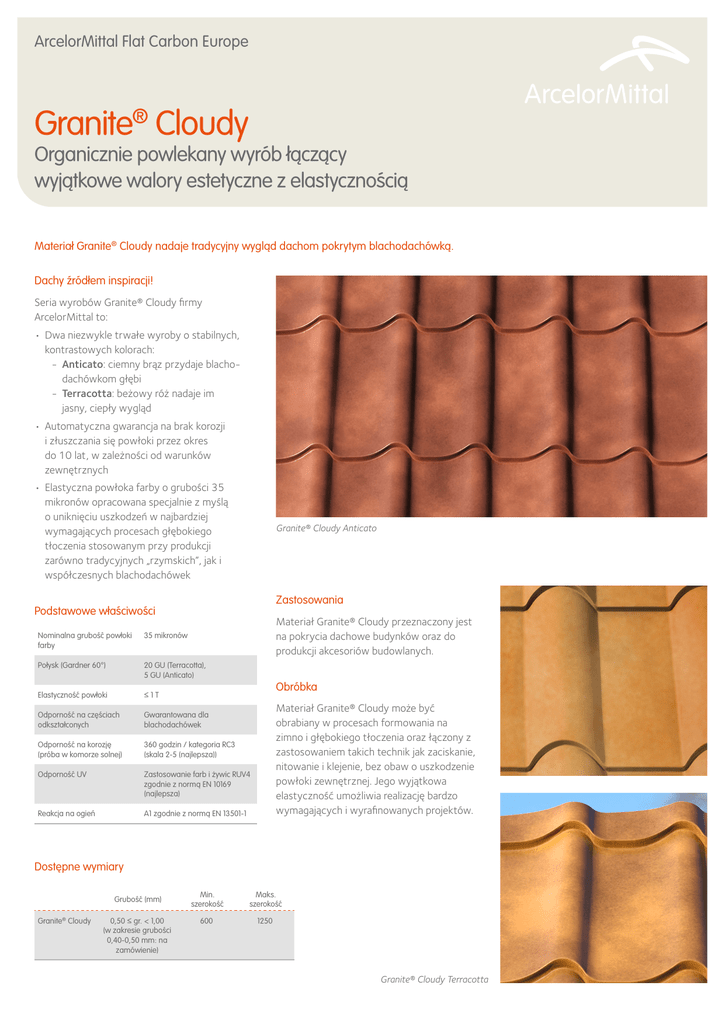 ArcelorMittal Flat Carbon Europe Granite® Cloudy Organicznie powlekany wyrób łączący wyjątkowe walory estetyczne z elastycznością Materiał Granite® Cloudy nadaje tradycyjny wygląd dachom pokrytym blachodachówką. Dachy źródłem inspiracji! Seria wyrobów Granite® Cloudy firmy ArcelorMittal to: • Dwa niezwykle trwałe wyroby o stabilnych, kontrastowych kolorach: - Anticato: ciemny brąz przydaje blachodachówkom głębi - Terracotta: beżowy róż nadaje im jasny, ciepły wygląd • Automatyczna gwarancja na brak korozji i złuszczania się powłoki przez okres do 10 lat, w zależności od warunków zewnętrznych • Elastyczna powłoka farby o grubości 35 mikronów opracowana specjalnie z myślą o uniknięciu uszkodzeń w najbardziej wymagających procesach głębokiego tłoczenia stosowanym przy produkcji zarówno tradycyjnych „rzymskich”, jak i współczesnych blachodachówek Granite® Cloudy Anticato Zastosowania Podstawowe właściwości Materiał Granite® Cloudy przeznaczony jest na pokrycia dachowe budynków oraz do produkcji akcesoriów budowlanych. Nominalna grubość powłoki farby 35 mikronów Połysk (Gardner 60°) 20 GU (Terracotta), 5 GU (Anticato) Elastyczność powłoki ≤1T Odporność na częściach odkształconych Gwarantowana dla blachodachówek Odporność na korozję (próba w komorze solnej) 360 godzin / kategoria RC3 (skala 2-5 (najlepsza)) Odporność UV Zastosowanie farb i żywic RUV4 zgodnie z normą EN 10169 (najlepsza) Reakcja na ogień A1 zgodnie z normą EN 13501-1 Obróbka Materiał Granite® Cloudy może być obrabiany w procesach formowania na zimno i głębokiego tłoczenia oraz łączony z zastosowaniem takich technik jak zaciskanie, nitowanie i klejenie, bez obaw o uszkodzenie powłoki zewnętrznej. Jego wyjątkowa elastyczność umożliwia realizację bardzo wymagających i wyrafinowanych projektów. Dostępne wymiary Grubość (mm) Granite® Cloudy 0,50 ≤ gr. < 1,00 (w zakresie grubości 0,40-0,50 mm: na zamówienie) Min. szerokość Maks. szerokość 600 1250 Granite® Cloudy Terracotta Służymy Państwu pomocą Wyrób po dwuletniej ekspozycji na warunki zewnętrzne na nadmorskim stanowisku C5 (atlantyckie wybrzeże Francji). Warunki ekspozycji: próbka mocowana horyzontalnie na stojaku o kącie nachylenia 5° Po lewej: Granite® Cloudy Anticato (narastająca próba zginania 1-3 T, zarysowania do powłoki cynku) Po prawej: Granite® Cloudy Terracotta (narastająca próba zginania 1-3 T, zarysowania do podłoża stalowego (po lewej) i do powłoki cynku (po prawej)) Flat Carbon Europe 19, avenue de la Liberté L-2930 Luxembourg [email protected] www.arcelormittal.com/fce Dalsze informacje, szczegółowe katalogi oraz dane techniczne znajdą Państwo na stronie: www.arcelormittal.com/fce Bezpośredni kontakt: [email protected] Fotografie Philippe Vandenameele – Marcin Głaz Copyright Wszelkie prawa zastrzeżone. Żadna cześć niniejszej publikacji nie może być powielana w jakikolwiek sposób i w jakiejkolwiek formie bez uzyskania pisemnej zgody firmy ArcelorMittal. Pomimo dołożenia wszelkich starań dla zapewnienia ścisłości danych zawartych w niniejszej publikacji, informacje te nie są wiążące w sensie umownym. Dlatego też firma ArcelorMittal ani żadna inna firma Grupy ArcelorMittal nie ponosi odpowiedzialności za pomyłki, przeoczenia bądź jakiekolwiek informacje, które mogą okazać się błędne. Ponieważ możliwe jest wprowadzenie zmian do treści niniejszej publikacji bez wcześniejszego powiadomienia, aktualną wersję znajdą Państwo w zakładce „Magazines and brochures” na stronie internetowej www.arcelormittal.com/fce PR-TD-CLD-PL – 04/2010 Dla zapewnienia najwyższej jakości materiału Granite® Cloudy, wykonane z niego wyroby wystawione są na stałe działanie czynników zewnętrznych oraz poddawane regularnym testom.