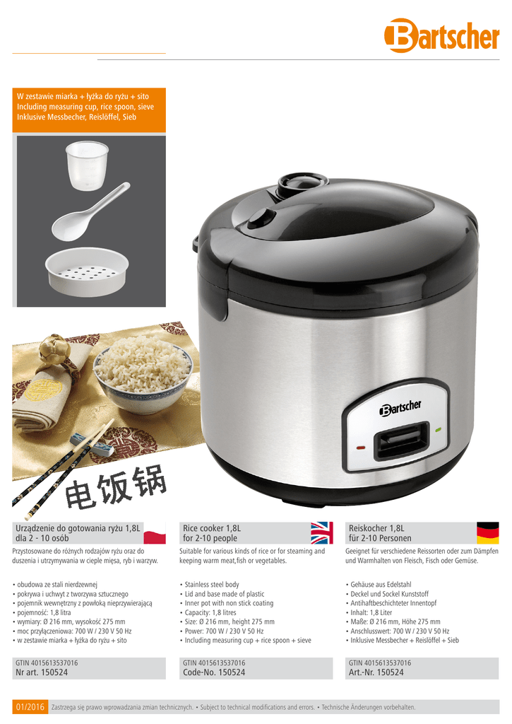 W zestawie miarka + łyżka do ryżu + sito Including measuring cup, rice spoon, sieve Inklusive Messbecher, Reislöffel, Sieb Urządzenie do gotowania ryżu 1,8L dla 2 - 10 osób Rice cooker 1,8L for 2-10 people Reiskocher 1,8L für 2-10 Personen Przystosowane do różnych rodzajów ryżu oraz do duszenia i utrzymywania w cieple mięsa, ryb i warzyw. Suitable for various kinds of rice or for steaming and keeping warm meat,fish or vegetables. Geeignet für verschiedene Reissorten oder zum Dämpfen und Warmhalten von Fleisch, Fisch oder Gemüse. • obudowa ze stali nierdzewnej • pokrywa i uchwyt z tworzywa sztucznego • pojemnik wewnętrzny z powłoką nieprzywierającą • pojemność: 1,8 litra • wymiary: Ø 216 mm, wysokość 275 mm • moc przyłączeniowa: 700 W / 230 V 50 Hz • w zestawie miarka + łyżka do ryżu + sito • Stainless steel body • Lid and base made of plastic • Inner pot with non stick coating • Capacity: 1,8 litres • Size: Ø 216 mm, height 275 mm • Power: 700 W / 230 V 50 Hz • Including measuring cup + rice spoon + sieve • Gehäuse aus Edelstahl • Deckel und Sockel Kunststoff • Antihaftbeschichteter Innentopf • Inhalt: 1,8 Liter • Maße: Ø 216 mm, Höhe 275 mm • Anschlusswert: 700 W / 230 V 50 Hz • Inklusive Messbecher + Reislöffel + Sieb GTIN 4015613537016 Nr art. 150524 01/2016 GTIN 4015613537016 Code-No. 150524 GTIN 4015613537016 Art.-Nr. 150524 Zastrzega się prawo wprowadzania zmian technicznych. • Subject to technical modifications and errors. • Technische Änderungen vorbehalten.