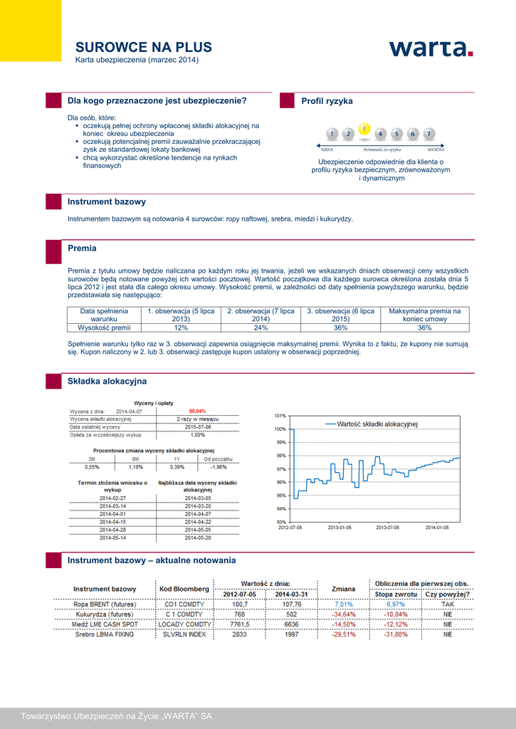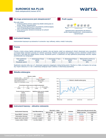 SUROWCE NA PLUS Karta ubezpieczenia (marzec 2014) Dla kogo przeznaczone jest ubezpieczenie? Dla osób, które: oczekują pełnej ochrony wpłaconej składki alokacyjnej na koniec okresu ubezpieczenia oczekują potencjalnej premii zauważalnie przekraczającej zysk ze standardowej lokaty bankowej chcą wykorzystać określone tendencje na rynkach finansowych Profil ryzyka Ubezpieczenie odpowiednie dla klienta o profilu ryzyka bezpiecznym, zrównoważonym i dynamicznym Instrument bazowy Instrumentem bazowym są notowania 4 surowców: ropy naftowej, srebra, miedzi i kukurydzy. Premia Premia z tytułu umowy będzie naliczana po każdym roku jej trwania, jeżeli we wskazanych dniach obserwacji ceny wszystkich surowców będą notowane powyżej ich wartości pocztowej. Wartość początkowa dla każdego surowca określona została dnia 5 lipca 2012 i jest stała dla całego okresu umowy. Wysokość premii, w zależności od daty spełnienia powyższego warunku, będzie przedstawiała się następująco: Data spełnienia warunku Wysokość premii 1. obserwacja (5 lipca 2013) 12% 2. obserwacja (7 lipca 2014) 24% 3. obserwacja (6 lipca 2015) 36% Maksymalna premia na koniec umowy 36% Spełnienie warunku tylko raz w 3. obserwacji zapewnia osiągnięcie maksymalnej premii. Wynika to z faktu, że kupony nie sumują się. Kupon naliczony w 2. lub 3. obserwacji zastępuje kupon ustalony w obserwacji poprzedniej. Składka alokacyjna Instrument bazowy – aktualne notowania Towarzystwo Ubezpieczeń na Życie „WARTA” SA Instrument bazowy – wykres Komentarz rynkowy Od początku trwania ubezpieczenia do marca 2013 roku ceny wszystkich obserwowanych surowców albo znajdowały się powyżej wartości początkowej albo oscylowały wokół niej. Obraz sytuacji pogorszył się w II kwartale 2013r., w trakcie którego wartości srebra, miedzi i kukurydzy zanurkowały i obecnie każdy z nich notowany jest poniżej wartości początkowej. Straty na miedzi są stosunkowo niewielkie i biorąc pod uwagę okres pozostały do końca trwania ubezpieczenia (1,5 roku) z łatwością można sobie wyobrazić ich odrobienie. Inaczej wygląda przypadek na kukurydzy oraz srebrze, które tracą około 30%. Obserwowana w ostatnich miesiącach przecena ma dwa podstawowe źródła. Pierwszym jest słabnący wzrost gospodarczy w krajach wschodzących (a szczególnie Chinach), które generują zdecydowaną większość nowego popytu na surowce. Drugi powód (powiązany z pierwszym) polega na odwróceniu się inwestorów portfelowych od szeroko pojętego rynku surowców. Z jednej strony rolę odgrywa tu wspomniane pogorszenie fundamentów (oczekiwany mniejszy popyt), ale także stopniowe ograniczanie drukowania pieniądza przez bank centralny w USA. Ten proces wspierał w ostatnich latach hossę na rynku surowców. Odrabianie strat powinna wspomóc oczekiwana w kolejnych kwartałach stopniowa poprawa sytuacji gospodarczej na świecie, co w perspektywie wciąż odległego czasu do zapadalności inwestycji (1,5 roku), powinno dawać nadzieję na odrobienie strat. Kontakt Informacje na temat ubezpieczeń TUnŻ WARTA S.A. można uzyskać pod numerem infolinii 801 308 308 +48 502 308 308 (dla połączeń z zagranicy) (opłata zgodna z taryfą operatora) NOTA PRAWNA Wszelkie opinie i oceny zawarte w niniejszym opracowaniu wyrażają opinie Ubezpieczyciela w dniu jego wydania. Opracowanie przygotowano dochowując należytej staranności, wykorzystując źródła informacji, które Ubezpieczyciel uważa za wiarygodne i dokładne, jednakże nie istnieje gwarancja, iż są one wyczerpujące i w pełni odzwierciedlają stan faktyczny. Wykresy i diagramy przedstawione w niniejszym opracowaniu mają charakter wyłącznie ilustracyjny, nie są one ani doradztwem inwestycyjnym, ani prognozą. Ubezpieczyciel nie świadczy usług doradztwa inwestycyjnego, ani nie udziela porad inwestycyjnych a informacje nie mają w żadnym wypadku charakteru porady inwestycyjnej. Szczegółowe informacje dotyczące umowy ubezpieczenia znajdują się w Ogólnych Warunkach Ubezpieczenia dostępnych w placówkach Ubezpieczyciela i/lub stronie internetowej www.warta.pl. Przed zawarciem umowy Klient samodzielnie określa poziom akceptowalnego przez siebie ryzyka, potencjalne korzyści oraz straty z nią związane, jak również w szczególności charakterystykę, konsekwencje prawne, podatkowe i księgowe umowy. Powielanie bądź publikowanie niniejszego opracowania lub jego części bez pisemnej zgody Ubezpieczyciela jest zabronione. Niniejszy materiał nie stanowi oferty w rozumieniu art. 66 Kodeksu cywilnego. Towarzystwo Ubezpieczeń na Życie WARTA S.A. wpisane przez Sąd Rejonowy dla M. St. Warszawy do rejestru przedsiębiorców Krajowego Rejestru