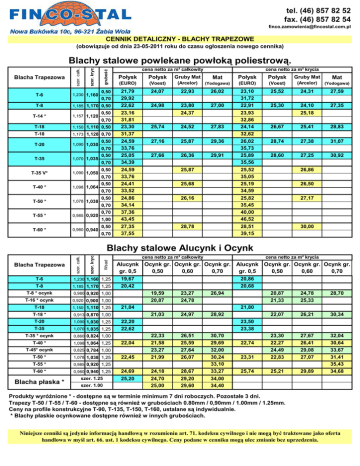 tel. (46) 857 82 52 fax. (46) 857 82 54 [email protected] CENNIK DETALICZNY - BLACHY TRAPEZOWE (obowiązuje od dnia 23-05-2011 roku do czasu ogłoszenia nowego cennika) grubość szer. kryc. Blacha Trapezowa szer. całk. Blachy stalowe powlekane powłoką poliestrową. 0,50 T-6 1,230 1,160 T-8 1,185 1,170 0,50 T-14 * 1,157 1,120 0,70 0,50 0,70 T-18 1,150 1,110 0,50 T-18 1,173 1,128 0,70 T-20 1,090 1,030 T-35 1,070 1,035 T-35 V* 1,090 1,050 T-40 * 1,098 1,064 T-50 * 1,078 1,038 T-55 * 0,985 0,920 T-60 * 0,980 0,940 0,50 0,70 0,50 0,70 0,50 0,70 0,50 0,70 0,50 0,70 0,70 1,00 0,50 0,70 cena netto za m² całkowity cena netto za m² krycia Połysk Połysk Gruby Mat Mat Połysk Połysk Gruby Mat Mat (EURO) (Voest) (Arcelor) (Yodogawa) (EURO) (Voest) (Arcelor) (Yodogawa) 21,79 29,92 22,62 24,07 22,93 26,02 25,52 24,31 27,59 23,80 27,00 23,10 31,72 22,91 24,10 27,35 23,16 31,81 23,30 31,37 24,98 24,37 25,74 24,52 27,83 24,59 33,76 27,16 25,87 29,36 25,05 34,39 27,66 26,36 29,91 23,93 32,86 24,14 32,62 25,30 25,18 26,67 25,41 28,83 26,02 35,73 28,74 27,38 31,07 25,89 35,56 28,60 27,25 30,92 24,59 33,76 25,87 25,52 35,05 26,86 24,41 33,52 25,68 25,19 34,59 26,50 24,86 34,14 26,16 25,82 35,45 27,17 40,00 46,52 37,36 43,45 27,35 37,55 28,78 28,51 39,15 30,00 cena netto za m² całkowity Wsad szer. kryc. Blacha Trapezowa szer. całk. Blachy stalowe Alucynk i Ocynk T-6 1,230 1,160 1,25 T-8 1,185 1,170 1,25 T-8 * ocynk 0,980 0,920 1,00 T-16 * ocynk 0,920 0,900 1,00 cena netto za m² krycia Alucynk Ocynk gr. Ocynk gr. Ocynk gr. Alucynk Ocynk gr. Ocynk gr. Ocynk gr. gr. 0,5 0,50 0,60 0,70 gr. 0,5 0,50 0,60 0,70 19,67 20,42 20,86 20,68 19,59 20,87 23,27 24,78 26,94 21,03 24,97 28,92 21,04 1,150 1,110 1,25 0,913 0,870 1,00 T-20 1,090 1,030 1,25 T-35 1,070 1,035 1,25 T-35 * ocynk 0,860 0,824 1,00 T-40 * 1,098 1,064 1,25 T-45* ocynk 0,825 0,784 1,00 T-50 * 1,078 1,038 1,25 T-55 * 0,985 0,920 1,25 T-60 * 0,980 0,940 1,25 24,69 24,18 28,67 30,70 29,69 32,00 30,24 33,10 33,27 szer. 1.25 25,20 24,70 25,00 29,20 29,60 34,00 34,40 Blacha płaska * szer. 1.00 22,20 22,62 22,45 24,78 25,33 28,70 22,07 26,21 30,34 23,31 23,30 22,27 24,49 22,83 27,67 26,41 29,08 27,07 25,74 25,21 29,89 32,04 30,64 33,67 31,41 35,43 34,68 21,80 T-18 T-18 * 22,04 20,87 21,33 23,50 23,38 22,33 21,58 23,27 21,99 26,51 25,59 27,64 26,07 22,74 Produkty wyróżnione * - dostępne są w terminie minimum 7 dni roboczych. Pozostałe 3 dni. Trapezy T-50 / T-55 / T-60 - dostępne są również w grubościach 0.80mm / 0,90mm / 1.00mm / 1.25mm. Ceny na profile konstrukcyjne T-90, T-135, T-150, T-160, ustalane są indywidualnie. * Blachy płaskie ocynkowane dostępne również w innych grubościach. Niniejsze cenniki są jedynie informacją handlową w rozumieniu art. 71. kodeksu cywilnego i nie mogą być traktowane jako oferta handlowa w myśl art. 66. ust. 1 kodeksu cywilnego. Ceny podane w cenniku mogą ulec zmianie bez uprzedzenia.