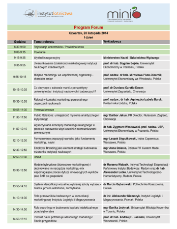 Program Forum Czwartek, 20 listopada 2014 I dzień Wykładowca Godzina Temat referatu 8:30-9:00 Rejestracja uczestników / Powitalna kawa 9:00-9:15 Powitanie 9:15-9:35 Wykład inauguracyjny Ministerstwo Nauki i Szkolnictwa Wyższego 9:35-9:55 Uwarunkowania działalności marketingowej instytucji naukowych i badawczych prof. dr hab. Bogdan Sojkin, Uniwersytet Ekonomiczny w Poznaniu, Polska 9:55-10:15 Miejsce marketingu we współczesnej organizacji charakter zmian prof. nadzw. dr hab. Mirosława Pluta-Olearnik, Uniwersytet Ekonomiczny we Wrocławiu, Polska 10:15-10:35 Co decyduje o sukcesie marki z perspektywy uniwersytetów i instytucji naukowych i badawczych? prof. dr Durdana Ozretic-Dosen Uniwersytet Zagrzebski, Chorwacja 10:35-10:55 Relacyjny kontekst marketingu personalnego organizacji naukowych prof. nadzw., dr hab. Agnieszka Izabela Baruk, Politechnika Łódzka, Polska 10:55-11:30 Przerwa kawowa 11:30-11:50 Public Relations: umiejętność myślenia analitycznego i krytycznego mgr Dalibor Jakus, PR Director, Nulaosam, Zagrzeb, Chorwacja 11:50-12:10 Wykorzystanie koncepcji marketingu relacyjnego w procesie budowania więzi uczelni z interesariuszami zewnętrznymi dr hab. Zygmunt Waśkowski, prof. nadzw. UEP, Uniwersytet Ekonomiczny w Poznaniu, Polska 12:10-12:30 Formułowanie propozycji wartości jako fundamentu marketingu nauki mgr Leszek Stypułkowski, Index Copernicus, Warszawa, Polska 12:30-12:50 Employer Branding jako element strategii budowania wizerunku instytucji naukowych mgr Anna Dzienio, Dzienio PR Custom Made, Warszawa, Polska 12:50-13:30 Obiad 13:30-13:50 Modele hybrydowe (biznesowo-marketingowe) i dedykowane im narzędzia marketingu-mix wspomagające proces dyfuzji innowacyjnych wyników prac B+R do gospodarki 13:50-14:10 System identyfikacji wizualnej wybranej szkoły wyższej - dr Marcin Gębarowski, Politechnika Rzeszowska, zakres, proces wdrażania, zarządzanie Polska 14:10-14:30 Rola pracowników badawczych w komunikacji marketingowej Instytutu Logistyki i Magazynowania dr inż. Aleksander Niemczyk, Instytut Logistyki i Magazynowania, Poznań, Polska 14:30-14:50 Rola coachingu w budowaniu kapitału intelektualnego przedsiębiorstwa mgr Eunika Jedynak, Uniwersytet Mikołaja Kopernika w Toruniu, Polska 14:50-15:10 Produkt nauki potrzebuje właściwego marketingu: Studia przypadków prof. dr hab. Andrzej H. Jasiński, Uniwersytet Warszawski, Polska dr Marzena Walasik, Instytut Technologii Eksploatacji Państwowy Instytut Badawczy, Radom oraz dr hab. Aleksander Lotko, Uniwersytet TechnologicznoHumanistyczny, Radom, Polska 15:10-15:30 Analiza społecznej odpowiedzialności biznesu branży farmaceutycznej - powinność, szansa czy konieczność w prowadzeniu działalności przedsiębiorstw farmaceutycznych 15:30-15:40 Dyskusja mgr Joanna Turkiewicz, Uniwersytet Mikołaja Kopernika w Toruniu, Polska 15:40 Zakończenie 19:00 Spektakl w Teatrze Studio - Oleanna. Po spektaklu bankiet w Teatrze Studio. Piątek, 21 listopada 2014 II dzień Wykładowca Godzina Temat referatu 9:00-9:15 Powitanie (kawa/herbata) 9:15-9:35 Strategie marketingowe szkoły wyższej prof. dr hab. Lidia Białoń, Wyższa Szkoła Menedżerska, Warszawa, Polska 9:35-9:55 Nauka w sektorze publicznym mgr Jadranka Jezeršek Turnes, Director, Kontekst, Ljubljana, Słowenia 9:55-10:15 Alternatywne metryki - przyszłość naukometrii. Jak instytucje naukowe mogą je wykorzystać? dr Emanuel Kulczycki, Uniwersytet im. Adama Mickiewicza w Poznaniu, Polska 10:15-10:35 Ocena działań prowadzonych przez firmy w mediach społecznościowych w świetle wyników badań ich użytkowników prof. dr hab. Bogdan Gregor, mgr Tomasz Kubiak, Uniwersytet Łódzki, Polska 10:35-11:00 Przerwa kawowa 11:00-11:20 Interfejs oraz konkurencyjność organizacyjna marketingu i sprzedaży prof. George J. Avlonitis, Uniwersytet Ekonomii i Biznesu w Atenach, Grecja 11:20-11:40 Zarządzanie niepubliczną uczelnią wyższą dr Piotr Mikosik, Wyższa Szkoła Menedżerska, Warszawa, Polska 11:40-12:00 Popularyzacja nauki jako narzędzie marketingowe na przykładzie udziału w przedsięwzięciu Ministra Nauki i Szkolnictwa Wyższego "Ścieżki Kopernika" mgr inż. Adam Piasecki, Instytut Technik Innowacyjnych EMAG, Katowice, Polska 12:00-12:20 Rola instytucji badawczych w konsultacjach społecznych dr Joanna Pruchnicka, Centrum Badań i Dozoru Górnictwa Podziemnego Sp. z o.o., Lędziny, Polska 12:20-13:00 Obiad 13:00-13:20 Skuteczna komunikacja z przedsiębiorstwami na różnych etapach kariery naukowca dr Marzena Feldy, Ośrodek Przetwarzania InformacjiPaństwowy Instytut Badawczy, Warszawa, Polska 13:20-13:40 Pozyskiwanie interesariuszy poprzez cykliczne wydarzenia naukowe mgr Jaromir Matulewicz, Instytut Rozwoju Miast, Kraków, Polska Czynniki sukcesu i ograniczenia dla skutecznej komunikacji wewnętrznej dr Dariusz Tworzydło, Instytut Rozwoju Społeczeństwa Informacyjnego, Rzeszów, Polska 14:00-14:20 Siedem dróg do autentyczności, czyli jak zmieniła się komunikacja i oczekiwania konsumentów. (Wystąpienie mgr Marcin Maj, Prezes OS3, Warszawa, Polska 14:20-14:30 Dyskusja 13:40-14:00 14:30 oparte na doświadczeniu agencji, które jest pozanaukowym spojrzeniem na prezentowane zagadnienie) Podsumowanie i zamknięcie Forum Patronat honorowy: Partner merytoryczny: Patronat medialny: