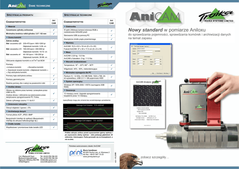 DANE TECHNICZNE SPECYFIKACJA PRODUKTU SPECYFIKACJE TECHNICZNE Ani CAM CHARAKTERYSTYKI Materiał Ani CAM CHARAKTERYSTYKI Elektronika Ceramiczne cylindry aniloxowe Minimalna średnica rolki/cylindra: 2.5” / 63 mm W pełni 24bitowa kamera kolorowa RGB o rozdzielczości 640x480 pixeli Nowy standard w pomiarze Aniloxu Sterowanie USB za pomocą PC Zewnętrzne źródło prądu przemiennego do sprawdzania pojemności, sprawdzania komórek i archiwizacji danych na temat zapasu Ocena komórki Zakres analizy: Std: soczewka x20 235-475 lpcm / 600-1200 lpi Głębokość komórki: 3-36 µm Std: soczewka x10 100-235 lpcm / 250-600 lpi Std: soczewka x4 AniCAM: 15,5 x 9,5 x 19 cm (S x G x W) Futerał AniCAM: 37 x 30 x 17,5 cm (S x G x W) Głębokość komórki: 10-72 µm 40-100 lpcm / 100-250 lpi 2 Obliczenie objętości komórki w cm /m lub BCM AniCAM: 2.20 kg / 5.0 lbs AniCAM z futerałem: 5 kg / 11.0 lbs Pomiary: • Liniatura komórki • Szerokość ścianki komórki • Głębokość komórki • • Kąt odchylenia komórki Warunki środowiskowe: o • Szczelina komórki Masa Głębokość komórki: 30-96 µm 3 Wymiary o o o Temperatura: 16 – 32 C /60 – 90 F Wilgotność: 40% - 60%, niekondensująca Minimalne wymagania dla PC Pomiary kąta odchylenia aniloxu Pomiary geometryczne Średnie pomiary dla n sekcji na powierzchni rolki Analiza obrazu Obrazy są robione przez kamerę i przesyłane przez USB na PC. Analiza obrazu i obliczenia są wykonywane przez dedykowane oprogramowanie PC Troika. Zakres cyfrowego zoomu 1:1 do 6:1 Pentium IV, 1.6 GHz, 512 MB RAM, 1024 x 768, 24bit wyświetlacz, USB 2.0 1+ GB pojemności HDD System operacyjny Windows XP / WIN 2000 / VISTA (wymagane 2GB RAM) Gwarancja 12 miesięcy zwrot. Upgrade oprogramowania bezpłatnie przez 12 miesięcy. (specyfikacje mogą ulec zmianie bez wcześniejszego uprzedzenia) Zmienności odczytów Odczyt objętości: typowo ± 5% Archiwizacja danych Format plików ACP, JPEG i BMP Bezpośredni interfejs do aplikacji (Bezpośredni interfejs do arkusza kalkulacyjnego itp.) Źródło światła Współosiowe i promieniowe białe światło LED Próbka odczytu aniloxu przed czyszczeniem (górny wykres) i po czyszczeniu (dolny wykres) – obie pokazują głębokość 26 mikronów. Interesujące: Farba gromadzi się na krawędziach, a nie na dnie. Państwa autoryzowany dealer AniCAM: Biuro handlowe: 62-002 Suchy Las, ul. Klonowa 2 tel./fax: +48 61 847 10 23 www.printsystems.pl zobacz szczegóły… „Wszystko wskazuje na to, Ŝe AniCAM stanie się nowym standardem w pomiarze cylindrów aniloxowych” (Phil Hall, Dyrektor Zarządzający Troika Systems Limited) DLACZEGO ANICAM? AniCAM został opracowany dla drukarni, w których poŜądana jest Kontrola Jakościowa zapasu Aniloxu. W szczególności w celu wewnętrznego rejestrowania danych nowych rolek, stanu rolki w trakcie uŜytkowania oraz aby umoŜliwić finansowe planowanie regeneracji lub wymiany. Praktyczne wewnętrzne zarządzanie zapasem Aniloxu jest poŜądane w celu skrócenia czasów dopasowania kolorów, zapewnienia stałej jakości druku i zwrócenia uwagi na potencjalne problemy przed przejściem do maszyny drukarskiej poprzez określenie, czy rolka jest czysta czy brudna. CO MOśNA MIERZYĆ? Średnią objętość komórki ŁATWY W UśYTKOWANIU I PRZENOŚNY ChociaŜ AniCAM jest bardzo profesjonalnym przyrządem, jego obsługa jest bardzo prosta: w celu odczytania objętości umieścić przenośną kamerę AniCAM na szczycie Państwa rolki aniloxowej, wybrać odpowiednie ustawienia i kliknąć na przycisk Cell Profile, aby uzyskać pełen odczyt. Obraz zostanie wtedy przesłany do okna analizy, które jednocześnie wyświetla stronę informacyjną z odczytem objętości i głębokości. Wprowadzają Państwo po prostu nazwę klienta, identyfikator rolki i nazwisko operatora. System generuje formularz raportu, który moŜe zostać wydrukowany lub wyeksportowany do bazy danych lub arkusza kalkulacyjnego do dalszej analizy, takiej jak Państwa własny sposób raportowania lub analiza zuŜycia rolki aniloxowej. Okno kamery AniCAM pozwala znaleźć obszar docelowy Obracalny widok 3D komórek Liniaturę komórek w lpi lub lpcm Średnicę szczeliny komórek Pomiar objętości komórki, głębokości komórki i grubości ścianki jest potrzebny, aby mieć stałą świadomość stanu Aniloxu i zredukować ryzyko straty czasu produkcji i moŜliwości strat materiałowych. KLUCZOWE ZALETY ANICAM Bardzo praktyczne i łatwe w stosowaniu narzędzie, które zapewni, Ŝe Państwa rolki aniloxowe są odpowiednio zidentyfikowane za pomocą pomiaru objętości, liniatury rastra, kąta odchylenia rastra, szczeliny komórki i pomiaru ścianki, wykonywanych w ciągu zaledwie kilku minut. Znajomość stanu Aniloxa znajdującego się w sercu Państwa maszyny drukarskiej, dzięki odpowiedniej identyfikacji i weryfikacji, daje zwiększoną pewność końcowego wyniku drukowania. MoŜliwość zobaczenia za pomocą cyfrowego mikroskopu AniCAM czy komórki są zatkane lub uszkodzone znacząco pomoŜe w zredukowaniu ilości kosztownych odpadów lub powtórek druku. Weryfikacja objętości zestawu rolek aniloxowych jest konieczna w celu utrzymania balansu farby na maszynie drukarskiej. Mając zestaw rolek, o których wiecie Państwo, Ŝe mają podobne objętości, zredukujecie czasochłonne i kosztowne wzmacnianie farby i związaną z nim ilość zuŜywanej farby. Wszystkie informacje na temat pomiarów i obrazów mogą zostać wydrukowane lub wyeksportowane w celu wykorzystania w innych aplikacjach (takich jak Excel lub bazy danych) do porównania pomiędzy informacjami historycznymi i bieŜącymi. MoŜna teraz śledzić zmiany w objętości rolek aniloxowych i monitorować ich stan. Szerokość ścianki komórek Głębokość komórek Kąt odchylenia komórki Okno informacyjne komórki Wydruk wszystkich waŜnych odczytów i obliczeń. ŚWIATŁO WSPÓŁOSIOWE I PROMINIOWE Ustawienia pozwalają uŜytkownikowi zdef