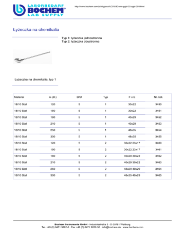 http://www.bochem.com/pl/Wyposa%C5%BCenie-pgid-32-agid-258.html Łyżeczka�na�chemikalia Typ�1:�łyżeczka�jednostronna Typ�2:�łyżeczka�obustronna Łyżeczka�na�chemikalia,�typ�1 Materiał A�(dł.) D/Ø Typ F�x�E Nr.�kat. 18/10�Stal 120 5 1 30x22 3450 18/10�Stal 150 5 1 30x22 3451 18/10�Stal 180 5 1 40x29 3452 18/10�Stal 210 5 1 40x29 3453 18/10�Stal 250 5 1 48x35 3454 18/10�Stal 300 5 1 48x35 3455 18/10�Stal 120 5 2 30x22�23x17 3460 18/10�Stal 150 5 2 30x22�23x17 3461 18/10�Stal 180 5 2 40x29�30x22 3462 18/10�Stal 210 5 2 40x29�30x22 3463 18/10�Stal 250 5 2 48x29�40x29 3464 18/10�Stal 300 5 2 48x35�40x29 3465 Bochem Instrumente GmbH · Industriestraße 3 · D-35781 Weilburg Tel. +49 (0) 6471 9282-0 · Fax +49 (0) 6471 9282-30 · [email protected] · www.bochem.com