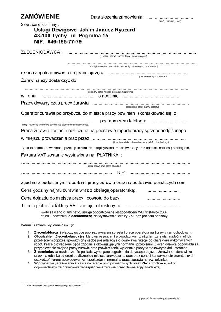 Formularz zamówienia - Usługi Dźwigowe Jakim Janusz Ryszard