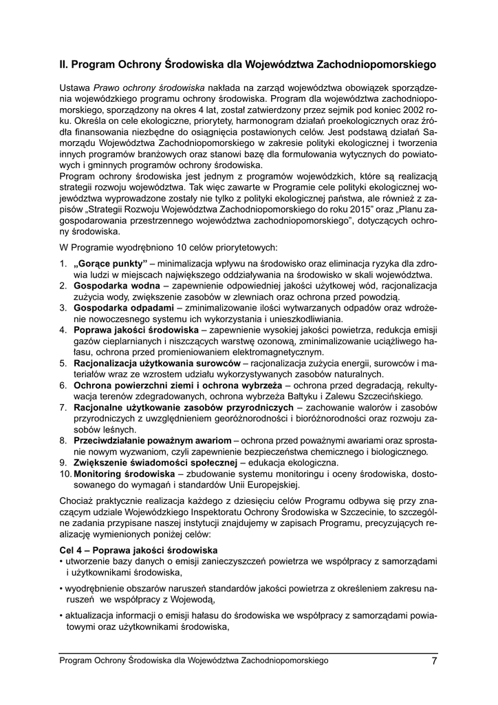 II. Program Ochrony Ârodowiska dla Województwa Zachodniopomorskiego Ustawa Prawo ochrony Êrodowiska nak∏ada na zarzàd województwa obowiàzek sporzàdzenia wojewódzkiego programu ochrony Êrodowiska. Program dla województwa zachodniopomorskiego, sporzàdzony na okres 4 lat, zosta∏ zatwierdzony przez sejmik pod koniec 2002 roku. OkreÊla on cele ekologiczne, priorytety, harmonogram dzia∏aƒ proekologicznych oraz êród∏a finansowania niezb´dne do osiàgni´cia postawionych celów. Jest podstawà dzia∏aƒ Samorzàdu Województwa Zachodniopomorskiego w zakresie polityki ekologicznej i tworzenia innych programów bran˝owych oraz stanowi baz´ dla formu∏owania wytycznych do powiatowych i gminnych programów ochrony Êrodowiska. Program ochrony Êrodowiska jest jednym z programów wojewódzkich, które sà realizacjà strategii rozwoju województwa. Tak wi´c zawarte w Programie cele polityki ekologicznej województwa wyprowadzone zosta∏y nie tylko z polityki ekologicznej paƒstwa, ale równie˝ z zapisów „Strategii Rozwoju Województwa Zachodniopomorskiego do roku 2015” oraz „Planu zagospodarowania przestrzennego województwa zachodniopomorskiego”, dotyczàcych ochrony Êrodowiska. W Programie wyodr´bniono 10 celów priorytetowych: 1. „Goràce punkty” – minimalizacja wp∏ywu na Êrodowisko oraz eliminacja ryzyka dla zdrowia ludzi w miejscach najwi´kszego oddzia∏ywania na Êrodowisko w skali województwa. 2. Gospodarka wodna – zapewnienie odpowiedniej jakoÊci u˝ytkowej wód, racjonalizacja zu˝ycia wody, zwi´kszenie zasobów w zlewniach oraz ochrona przed powodzià. 3. Gospodarka odpadami – zminimalizowanie iloÊci wytwarzanych odpadów oraz wdro˝enie nowoczesnego systemu ich wykorzystania i unieszkodliwiania. 4. Poprawa jakoÊci Êrodowiska – zapewnienie wysokiej jakoÊci powietrza, redukcja emisji gazów cieplarnianych i niszczàcych warstw´ ozonowà, zminimalizowanie ucià˝liwego ha∏asu, ochrona przed promieniowaniem elektromagnetycznym. 5. Racjonalizacja u˝ytkowania surowców – racjonalizacja zu˝ycia energii, surowców i materia∏ów wraz ze wzrostem udzia∏u wykorzystywanych zasobów naturalnych. 6. Ochrona powierzchni ziemi i ochrona wybrze˝a – ochrona przed degradacjà, rekultywacja terenów zdegradowanych, ochrona wybrze˝a Ba∏tyku i Zalewu Szczeciƒskiego. 7. Racjonalne u˝ytkowanie zasobów przyrodniczych – zachowanie walorów i zasobów przyrodniczych z uwzgl´dnieniem georó˝norodnoÊci i bioró˝norodnoÊci oraz rozwoju zasobów leÊnych. 8. Przeciwdzia∏anie powa˝nym awariom – ochrona przed powa˝nymi awariami oraz sprostanie nowym wyzwaniom, czyli zapewnienie bezpieczeƒstwa chemicznego i biologicznego. 9. Zwi´kszenie ÊwiadomoÊci spo∏ecznej – edukacja ekologiczna. 10. Monitoring Êrodowiska – zbudowanie systemu monitoringu i oceny Êrodowiska, dostosowanego do wymagaƒ i standardów Unii Europejskiej. Chocia˝ praktycznie realizacja ka˝dego z dziesi´ciu celów Programu odbywa si´ przy znaczàcym udziale Wojewódzkiego Inspektoratu Ochrony Ârodowiska w Szczecinie, to szczególne zadania przypisane naszej instytucji znajdujemy w zapisach Programu, precyzujàcych realizacj´ wymienionych poni˝ej celów: Cel 4 – Poprawa jakoÊci Êrodowiska • utworzenie bazy danych o emisji zanieczyszczeƒ powietrza we wspó∏pracy z samorzàdami i u˝ytkownikami Êrodowiska, • wyodr´bnienie obszarów naruszeƒ standardów jakoÊci powietrza z okreÊleniem zakresu naruszeƒ we wspó∏pracy z Wojewodà, • aktualizacja informacji o emisji ha∏asu do Êrodowiska we wspó∏pracy z samorzàdami powiatowymi oraz u˝ytkownikami Êrodowiska, Program Ochrony Ârodowiska dla Województwa Zachodniopomorskiego 7 • ocena stanu akustycznego Êrodowiska, • ocena zagro˝eƒ promieniowaniem elektromagnetycznym we wspó∏pracy z samorzàdami, przedsi´biorstwami energetycznymi oraz operatorami sieci telefonii komórkowej. Cel 8 – Przeciwdzia∏anie powa˝nym awariom • aktualizacja listy zak∏adów i instalacji stwarzajàcych potencjalne zagro˝enie wystàpienia powa˝nych awarii, • wspó∏praca transgraniczna w zakresie informowania o zagro˝eniach i prowadzenia akcji ratowniczych, we wspó∏pracy z Ministerstwem Ârodowiska, Paƒstwowà Stra˝à Po˝arnà i Wojewodà. Cel 9 – Zwi´kszenie ÊwiadomoÊci spo∏ecznej • utworzenie w urz´dach administracji publicznej systemów gromadzenia i upowszechniania informacji o Êrodowisku, • informowanie spo∏eczeƒstwa o stanie Êrodowiska. Cel 10 – Monitoring Êrodowiska • monitoring i ocena jakoÊci Êrodowiska we wspó∏pracy z Wojewodà, u˝ytkownikami Êrodowiska (szczególnie monitoring emisji), Regionalnym Zarzàdem Gospodarki Wodnej w Szczecinie oraz Poznaniu, samorzàdami, Urz´dem Marsza∏kowskim i Wojewódzkà Stacjà Chemiczno-Rolniczà. Odpowiedzi na pytania – czy i w jaki sposób zadania wymienione powy˝ej sà realizowane przez WIO w Szczecinie? – znajdujà si´ w prezentowanym Raporcie. Du˝ym wyzwaniem ze wzgl´dów merytorycznych i finansowych jest budowa systemu monitoringu i oceny Êrodowiska, dostosowanego do wymagaƒ Unii Europejskiej – Cel 10. Chocia˝ koordynatorem wszelkich dzia∏aƒ w ramach tego celu jest Wojewódzki Inspektor Ochrony Ârodowiska w Szczecinie, to cel ten powinien byç realizowany przy wspó∏udziale administracji rzàdowej i samorzàdowej ró˝nego szczebla. Równie˝ jeÊli chodzi o finansowanie poszczególnych zadaƒ w ramach tego celu, to jego ci´˝ar nie mo˝e spoczywaç jedynie na Êrodkach bud˝etowych. W Programie, w tabelach podajàcych êród∏a finansowania dla Celu 10 wymienione sà tak˝e: finansowanie z funduszy UE, Wojewódzkiego Funduszu Ochrony Ârodowiska i Gospodarki Wodnej, Narodowego Funduszu Ochrony Ârodowiska i Gospodarki Wodnej, z funduszy gminnych i powiatowych. 8 Raport o stanie Êrodowiska w województwie zachodniopomorskim w latach 2002-2003