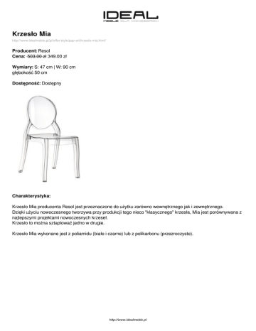 Krzesło Mia http://www.idealmeble.pl/pl/offer/style/pop-art/krzeslo-mia.html/ Producent: Resol Cena: 503.00 zł 349.00 zł Wymiary: S: 47 cm | W: 90 cm głębokość 50 cm Dostępność: Dostępny Charakterystyka: Krzesło Mia producenta Resol jest przeznaczone do użytku zarówno wewnętrznego jak i zewnętrznego. Dzięki użyciu nowoczesnego tworzywa przy produkcji tego nieco "klasycznego" krzesła, Mia jest porównywana z najlepszymi projektami nowoczesnych krzeseł. Krzesło to można sztaplować jedno w drugie. Krzesło Mia wykonane jest z poliamidu (białe i czarne) lub z polikarbonu (przezroczyste). http://www.idealmeble.pl Dostępne wersje produktu: nazwa produktu Krzesło Mia warianty kolor transparentny cena 503.00zł 349.00zł dostępne Dostępny Krzesło Mia kolor transparentny amber 503.00zł 349.00zł Dostępny Krzesło Mia kolor transparentny dymiony 503.00zł 349.00zł Dostępny Krzesło Mia kolor kryty czerwony 503.00zł 349.00zł Zapytaj Krzesło Mia kolor kryty czarny 503.00zł 349.00zł Zapytaj Krzesło Mia kolor kryty biały 503.00zł 349.00zł Dostępny http://www.idealmeble.pl Zdjęcia produktu: http://www.idealmeble.pl http://www.idealmeble.pl Powered by TCPDF (www.tcpdf.org)