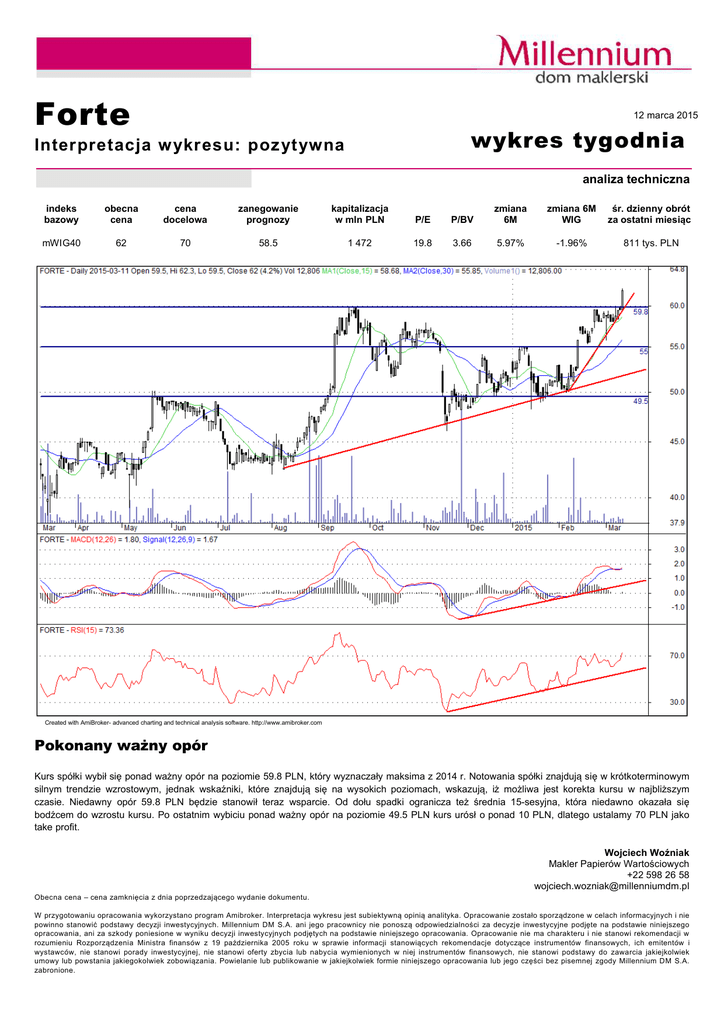 Forte 12 marca 2015 wykres tygodnia Interpretacja w ykresu: poz ytywna analiza techniczna indeks bazowy obecna cena cena docelowa zanegowanie prognozy kapitalizacja w mln PLN P/E P/BV zmiana 6M zmiana 6M WIG śr. dzienny obr•t za ostatni miesiąc mWIG40 62 70 58.5 1 472 19.8 3.66 5.97% -1.96% 811 tys. PLN Created with AmiBroker- advanced charting and technical analysis software. http://www.amibroker.com Pokonany ważny op•r Kurs sp†łki wybił się ponad ważny op†r na poziomie 59.8 PLN, kt†ry wyznaczały maksima z 2014 r. Notowania sp†łki znajdują się w kr†tkoterminowym silnym trendzie wzrostowym, jednak wskaźniki, kt†re znajdują się na wysokich poziomach, wskazują, iż możliwa jest korekta kursu w najbliższym czasie. Niedawny op†r 59.8 PLN będzie stanowił teraz wsparcie. Od dołu spadki ogranicza też średnia 15-sesyjna, kt†ra niedawno okazała się bodźcem do wzrostu kursu. Po ostatnim wybiciu ponad ważny op†r na poziomie 49.5 PLN kurs ur†sł o ponad 10 PLN, dlatego ustalamy 70 PLN jako take profit. Wojciech Woźniak Makler Papier†w Wartościowych +22 598 26 58 [email protected] Obecna cena – cena zamknięcia z dnia poprzedzającego wydanie dokumentu. W przygotowaniu opracowania wykorzystano program Amibroker. Interpretacja wykresu jest subiektywną opinią analityka. Opracowanie zostało sporządzone w celach informacyjnych i nie powinno stanowić podstawy decyzji inwestycyjnych. Millennium DM S.A. ani jego pracownicy nie ponoszą odpowiedzialności za decyzje inwestycyjne podjęte na podstawie niniejszego opracowania, ani za szkody poniesione w wyniku decyzji inwestycyjnych podjętych na podstawie niniejszego opracowania. Opracowanie nie ma charakteru i nie stanowi rekomendacji w rozumieniu Rozporządzenia Ministra finans†w z 19 października 2005 roku w sprawie informacji stanowiących rekomendacje dotyczące instrument†w finansowych, ich emitent†w i wystawc†w, nie stanowi porady inwestycyjnej, nie stanowi oferty zbycia lub nabycia wymienionych w niej instrument†w finansowych, nie stanowi podstawy do zawarcia jakiejkolwiek umowy lub powstania jakiegokolwiek zobowiązania. Powielanie lub publikowanie w jakiejkolwiek formie niniejszego opracowania lub jego części bez pisemnej zgody Millennium DM S.A. zabronione.