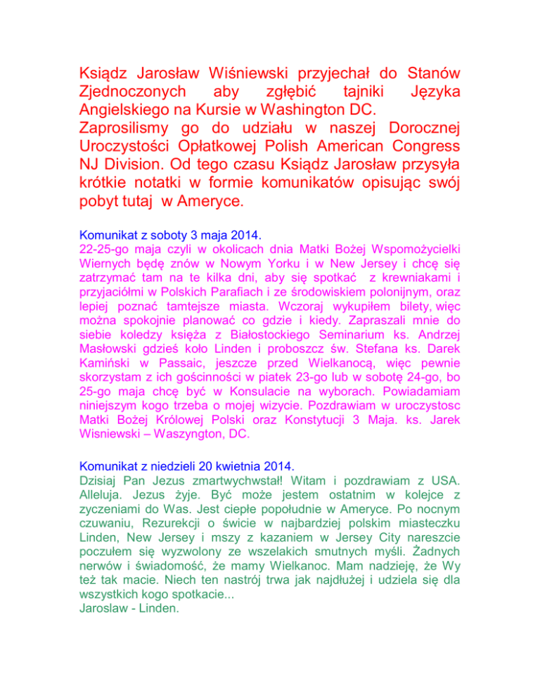 Ksiądz Jarosław Wiśniewski przyjechał do Stanów Zjednoczonych aby zgłębić tajniki Języka Angielskiego na Kursie w Washington DC. Zaprosilismy go do udziału w naszej Dorocznej Uroczystości Opłatkowej Polish American Congress NJ Division. Od tego czasu Ksiądz Jarosław przysyła krótkie notatki w formie komunikatów opisując swój pobyt tutaj w Ameryce. Komunikat z soboty 3 maja 2014. 22-25-go maja czyli w okolicach dnia Matki Bożej Wspomożycielki Wiernych będę znów w Nowym Yorku i w New Jersey i chcę się zatrzymać tam na te kilka dni, aby się spotkać z krewniakami i przyjaciółmi w Polskich Parafiach i ze środowiskiem polonijnym, oraz lepiej poznać tamtejsze miasta. Wczoraj wykupiłem bilety, więc można spokojnie planować co gdzie i kiedy. Zapraszali mnie do siebie koledzy księża z Białostockiego Seminarium ks. Andrzej Masłowski gdzieś koło Linden i proboszcz św. Stefana ks. Darek Kamiński w Passaic, jeszcze przed Wielkanocą, więc pewnie skorzystam z ich gościnności w piatek 23-go lub w sobotę 24-go, bo 25-go maja chcę być w Konsulacie na wyborach. Powiadamiam niniejszym kogo trzeba o mojej wizycie. Pozdrawiam w uroczystosc Matki Bożej Królowej Polski oraz Konstytucji 3 Maja. ks. Jarek Wisniewski – Waszyngton, DC. Komunikat z niedzieli 20 kwietnia 2014. Dzisiaj Pan Jezus zmartwychwstał! Witam i pozdrawiam z USA. Alleluja. Jezus żyje. Być może jestem ostatnim w kolejce z zyczeniami do Was. Jest ciepłe popołudnie w Ameryce. Po nocnym czuwaniu, Rezurekcji o świcie w najbardziej polskim miasteczku Linden, New Jersey i mszy z kazaniem w Jersey City nareszcie poczułem się wyzwolony ze wszelakich smutnych myśli. Żadnych nerwów i świadomość, że mamy Wielkanoc. Mam nadzieję, że Wy też tak macie. Niech ten nastrój trwa jak najdłużej i udziela się dla wszystkich kogo spotkacie... Jaroslaw - Linden. Komunikat z wtorku 25 marca 2014. Witam. Chcę pozdrowić z okazji Zwiastowania! Rosja w tych dniach pokazuje swój drapieżny pazur i kusi sparalizowany pasywnością świat do współudziału w rozbiorze Ukrainy. Jestem na Green Point. To najbardziej polska dzielnica w Nowym Jorku na Brooklynie. Miałem tu okolicznościowa msze i dwa spotkania - świadectwa o pracy na wschodzie. W trakcie kazania zaspiewałem tutejszym parafianom kawałek ze Stachury. Znacie to napewno: Rozdzierający jak tygrysa pazur antylopy plecy jest smutek czlowieczy - nie Brooklyński most lecz na drugą stronę gniewu przebić się, przez obłędu noc, to jest dopiero coś... W dzien zwiastowania przeżywa swoje święcenia biskupie mój starszy kolega z Białostockiego Seminarium X. Andrzej Zglejszewski - duszpasterz polonijny. Jestem z niego dumny. Przyjechałem na te święcenia z Waszyngtonu. Jest duża delegacja z Polski. Zostało do święceń parę godzin ale ja już się cieszę. Proszę trzymajcie kciuki albo sie pomódlcie jak potraficie, żeby mu się wiodło w pracy. To duża promocja dla amerykańskiej Polonii... X. Jarek - Nowy Jork Komunikat z soboty 8 marca 2014. Ukraina w opresji. Byłem więc w zeszłą niedzielę na manifestacji pod rosyjskim konsulatem w Nowym Jorku a w czwartek pod rosyjska ambasadą w Waszyngtonie. Nie watpię bowiem, że rakiety z Kaliningradu są wycelowane na Polskę. Jesteśmy następni w kolejce po Gruzji i Ukrainie. Kto wie może Kazachstan lub Białoruś zostaną poddane cześciowym rozbiorom wcześniej lub pochłonięte w całości. Jedno jednak, jest pewne, ze na Krymie apetyt pana Putina się nie zakończy. Protest to jedyna rzecz jaką możemy uczynić dla Polski. Dlatego właśnie poszedłem na te mityngi. Zarówno w Nowym Jorku jak Waszyngtonie bylo po 2 tyś. osób. Litwini - Łotysze, Czesi, Węgrzy, Turcy, Gruzini, Czerkiesi - Krymscy Tatarzy, Polacy i Ukraińcy razem. Nad rosyjską ambasadą puscili żółto-błękitne baloniki. Jedyna broń przeciwko potędze Putina i plakaty z długim nosem kłamczucha Wołodi jako Buratino albo Pinokio. W całym bloku sowieckim zamarły serca. Tymczasem Para-Ollimpiada w Soczi trwa. Powtórka z 1936... A wszystkie panie odbierają kwiaty od swoich wielbicieli. Ja też je serdecznie pozdrawiam. Ks. Jarek - USA. Komunikat z poniedziłku 24 lutego 2014. Dotarłem szczęśliwie na uroczystości. Tłumów nie było. Odprawiało 3 kapłanów w tym kapelan sybiraków w randze generała i kilku żołnierzy polonijnych z reprezentacyjnej gwardii wytrenowanej przez weteranów armii Andersa. Mnóstwo wrażeń ze spotkania sybiraków – jeszcze wiecej pod ambasadą ukraińską i konsulatem rosyjskim. Obie placówki oddalone od siebie o jakieś 15 ulic na 3 Avenue. Pikieta i przemówienia pod ukraińską Ambasadą spowodowały, że konsul wyszedł do tłumu! Przeprosił za okrucieństwa Janukowycza pod akompaniament gwizdów. Przemawiało w ciągu 2 godzin kilkanascie osób wtym prawosławny i unicki biskup. Do głosu dopuszczono polską delegację. Był wielki aplauz. Ja podszedłem do mikrofonu jako ostatni. Opisałem swe wspomnienia z Ukrainy sprzed 10 lat. Wzruszyłem się. Przemarsz trwał prawie godzinę. Potem włóczyłem się po Broadwayu, po 5 i 6 Avenue. Piękny wieczór. Nikt mnie nie zaczepiał, bo trzymałem kurczowo Procę Dawida czyli Rózaniec w ręku i nadal trzymam. Jak Bóg da rano będę w Waszyngtonie a o 9tej na wykładach. Pzdrawiam X. Jarosław. Komunikat z soboty 22 lutego 2014. Już jadę w megabusie do N.Jorku na jubileusz amerykańskich sybiraków. Wyjazd planowałem od dawna ale z racji na egzaminy nie myslałem o tym i nie dzieliłem się z nikim. To smutna okazja! 74 lata temu zaczęły się wywózki na sybir polaków patriotów z województw kresowych. Przez półtora roku sowieci wywieźli bezpowrotnie ok. 2 miliony naszych rodaków. To dużo większe szkody niż wyrządził nam Hitler. Do dziś jednak w polsce i na świecie ten temat jest nie znany. Uratował trochę gen. Anders, troszkę wyszło z Kościuszkowcami, reszta czekała smierci Sta