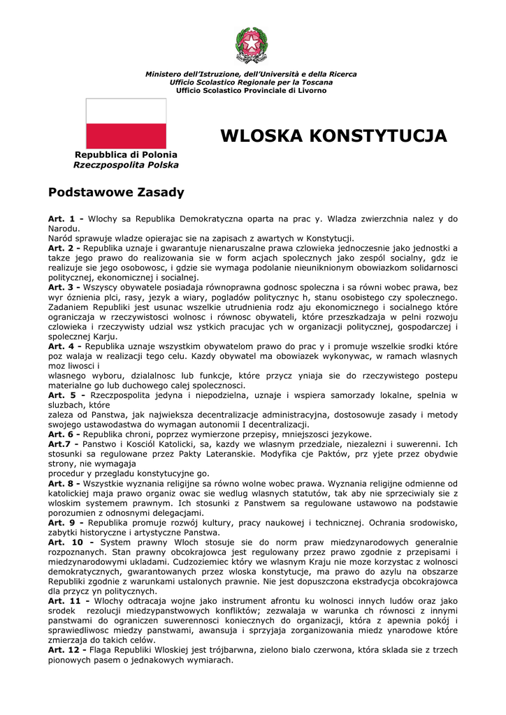 Ministero dell’Istruzione, dell’Università e della Ricerca Ufficio Scolastico Regionale per la Toscana Ufficio Scolastico Provinciale di Livorno WLOSKA KONSTYTUCJA Repubblica di Polonia Rzeczpospolita Polska Podstawowe Zasady Art. 1 - Wlochy sa Republika Demokratyczna oparta na prac y. Wladza zwierzchnia nalez y do Narodu. Naród sprawuje wladze opierajac sie na zapisach z awartych w Konstytucji. Art. 2 - Republika uznaje i gwarantuje nienaruszalne prawa czlowieka jednoczesnie jako jednostki a takze jego prawo do realizowania sie w form acjach spolecznych jako zespól socialny, gdz ie realizuje sie jego osobowosc, i gdzie sie wymaga podolanie nieuniknionym obowiazkom solidarnosci politycznej, ekonomicznej i socialnej. Art. 3 - Wszyscy obywatele posiadaja równoprawna godnosc spoleczna i sa równi wobec prawa, bez wyr óznienia plci, rasy, jezyk a wiary, pogladów politycznyc h, stanu osobistego czy spolecznego. Zadaniem Republiki jest usunac wszelkie utrudnienia rodz aju ekonomicznego i socialnego które ograniczaja w rzeczywistosci wolnosc i równosc obywateli, które przeszkadzaja w pelni rozwoju czlowieka i rzeczywisty udzial wsz ystkich pracujac ych w organizacji politycznej, gospodarczej i spolecznej Karju. Art. 4 - Republika uznaje wszystkim obywatelom prawo do prac y i promuje wszelkie srodki które poz walaja w realizacji tego celu. Kazdy obywatel ma obowiazek wykonywac, w ramach wlasnych moz liwosci i wlasnego wyboru, dzialalnosc lub funkcje, które przycz yniaja sie do rzeczywistego postepu materialne go lub duchowego calej spolecznosci. Art. 5 - Rzeczpospolita jedyna i niepodzielna, uznaje i wspiera samorzady lokalne, spelnia w sluzbach, które zaleza od Panstwa, jak najwieksza decentralizacje administracyjna, dostosowuje zasady i metody swojego ustawodastwa do wymagan autonomii I decentralizacji. Art. 6 - Republika chroni, poprzez wymierzone przepisy, mniejszosci jezykowe. Art.7 - Panstwo i Kosciól Katolicki, sa, kazdy we wlasnym przedziale, niezalezni i suwerenni. Ich stosunki sa regulowane przez Pakty Lateranskie. Modyfika cje Paktów, prz yjete przez obydwie strony, nie wymagaja procedur y przegladu konstytucyjne go. Art. 8 - Wszystkie wyznania religijne sa równo wolne wobec prawa. Wyznania religijne odmienne od katolickiej maja prawo organiz owac sie wedlug wlasnych statutów, tak aby nie sprzeciwialy sie z wloskim systemem prawnym. Ich stosunki z Panstwem sa regulowane ustawowo na podstawie porozumien z odnosnymi delegacjami. Art. 9 - Republika promuje rozwój kultury, pracy naukowej i technicznej. Ochrania srodowisko, zabytki historyczne i artystyczne Panstwa. Art. 10 - System prawny Wloch stosuje sie do norm praw miedzynarodowych generalnie rozpoznanych. Stan prawny obcokrajowca jest regulowany przez prawo zgodnie z przepisami i miedzynarodowymi ukladami. Cudzoziemiec który we wlasnym Kraju nie moze korzystac z wolnosci demokratycznych, gwarantowanych przez wloska konstytucje, ma prawo do azylu na obszarze Republiki zgodnie z warunkami ustalonych prawnie. Nie jest dopuszczona ekstradycja obcokrajowca dla przycz yn politycznych. Art. 11 - Wlochy odtracaja wojne jako instrument afrontu ku wolnosci innych ludów oraz jako srodek rezolucji miedzypanstwowych konfliktów; zezwalaja w warunka ch równosci z innymi panstwami do ograniczen suwerennosci koniecznych do organizacji, która z apewnia pokój i sprawiedliwosc miedzy panstwami, awansuja i sprzyjaja zorganizowania miedz ynarodowe które zmierzaja do takich celów. Art. 12 - Flaga Republiki Wloskiej jest trójbarwna, zielono bialo czerwona, która sklada sie z trzech pionowych pasem o jednakowych wymiarach. Czesc I - Prawa i Obowiazki obywateli Tytul I Stosunki cywilne Art. 13 - Kazdemu zapewnia sie nietykalnosc I wolnosc osobista. Nie jest dopuszczona z adna forma uwiezienia, inspekcji lub kontroli osobistej, ani jakiegokolwiek innego ograniczenia wolnosci, jedynie w prz ypadkach uzasadnionych przez Wladze Sadowe i w przypadkach okreslonych w ustawie i w sposób w niej okreslony. W przypadkach wyjatkowych i naglych potrzeb, wyz naczonych surowo przez prawo, organy wladzy bezpieczenstwa publicznego moga zaadoptowac zarzadzenia tymczasowe, które musza zostac zakomunikowane w ciagu czterdziestu osmiu godzin Wladze Sadowej, I jesli ta ich nie uprawomocni w ciagu nastepnych czterdziestu osmiu godzin, uznaja sie one za odwolane i zostaja pozbawione wszelkiego dzialania. Jest karana kazda przemoc fizyczna i moralna na osobach pomimo wsz ystko, poddanych do ograniczen wolnosci. Prawo ustala granice wiezi zapobiegawczej. Art. 14 - Zapewnia sie nienaruszalnosc mieszkania. Prz eszukanie mieszkania moze nastapic jedynie w przypadkach okreslonych w ustawie i w sposób w niej okreslony Przesz ukiwania i inspekcje dla powodów zdrowotnych i bezpieczenstwa publicznego, albo do celów ekonomicznych i skarbowych, sa regulowane przez prawa szczególne. Art. 15 - Zapewnia sie kazdemu obywatelowi wolnosc i ochrone tajemnicy komunikowania sie. Ogranicz enia moga nastapic jedynie przez Wladze Sadowe w przypadkach okreslonych w ustawie i w sposób w niej okreslony. Art. 16 - Kazdemu zapewnia sie wolnosc poruszania sie po terytorium Republiki oraz wyboru miejsca zamieszkania i pobytu, te prawa moga podlegac ograniczeniom okreslonym w ustawie w sposób ogólny dla powodów zdrowotnych lub bezpieczenstwa. Zadne ograniczenie nie moze byc ustalone dla powodów politycznych. Kazdy obywatel ma prawo i wolnosc wyjazdu z Kraju i powrotu, wyjatki okresla ustawa. Art. 17 - Obywatele maja prawo do pokojowych zgromadzen bez broni. Dla spotkan, takze w miejscach publicznych, nie zada sie uprzedniego ostrz ezenia. Dla zgromadzen w miejscach publicznych plenerowych (place, ulice, itd.) trzeba uprzenio ostrzezyc wladze, które moga je wstrz ymac jedynie dla uzasadnionych powodów bezpieczenstwa i nietykalnosci publicz nej. Art. 18 - Kazdemu zapewnia sie wolnosc zrzeszania sie, bez upowaz nienia, dla celów nie zakazanych dla poszczegulnych obywateli 