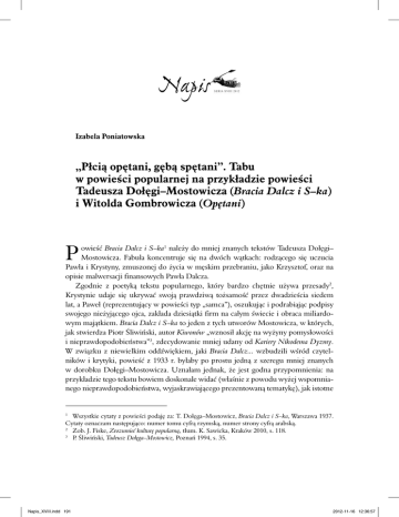 Izabela Poniatowska „Płcią opętani, gębą spętani”. Tabu w powieści popularnej na przykładzie powieści Tadeusza Dołęgi–Mostowicza (Bracia Dalcz i S–ka) i Witolda Gombrowicza (Opętani) P owieść Bracia Dalcz i S–ka1 należy do mniej znanych tekstów Tadeusza Dołęgi– Mostowicza. Fabuła koncentruje się na dwóch wątkach: rodzącego się uczucia Pawła i Krystyny, zmuszonej do życia w męskim przebraniu, jako Krzysztof, oraz na opisie malwersacji finansowych Pawła Dalcza. Zgodnie z poetyką tekstu popularnego, który bardzo chętnie używa przesady2, Krystynie udaje się ukrywać swoją prawdziwą tożsamość przez dwadzieścia siedem lat, a Paweł (reprezentujący w powieści typ „samca”), oszukując i podrabiając podpisy swojego nieżyjącego ojca, zakłada dziesiątki firm na całym świecie i obraca miliardowym majątkiem. Bracia Dalcz i S–ka to jeden z tych utworów Mostowicza, w których, jak stwierdza Piotr Śliwiński, autor Kiwonów „wznosił akcję na wyżyny pomysłowości i nieprawdopodobieństwa”3, zdecydowanie mniej udany od Kariery Nikodema Dyzmy. W związku z niewielkim oddźwiękiem, jaki Bracia Dalcz... wzbudzili wśród czytelników i krytyki, powieść z 1933 r. byłaby po prostu jedną z szeregu mniej znanych w dorobku Dołęgi–Mostowicza. Uznałam jednak, że jest godna przypomnienia: na przykładzie tego tekstu bowiem doskonale widać (właśnie z powodu wyżej wspomnianego nieprawdopodobieństwa, wyjaskrawiającego prezentowaną tematykę), jak istotne Wszystkie cytaty z powieści podaję za: T. Dołęga–Mostowicz, Bracia Dalcz i S–ka, Warszawa 1937. Cytaty oznaczam następująco: numer tomu cyfrą rzymską, numer strony cyfrą arabską. 2 Zob. J. Fiske, Zrozumieć kulturę popularną, tłum. K. Sawicka, Kraków 2010, s. 118. 3 P. Śliwiński, Tadeusz Dołęga–Mostowicz, Poznań 1994, s. 35. 1 Napis_XVIII.indd 191 2012-11-16 12:36:57 192 Izabela Poniatowska dla konstrukcji powieści popularnej są kategorie, które na pierwszy rzut oka trudno brać pod uwagę w badaniach literackich. Taką kategorią jest w Braciach Dalcz... tabu, któremu poświęcony jest niniejszy tekst. Jak (i po co) badać tabu w powieści popularnej? Tabu jest zakazem k u l t u r o w y m , nie estetycznym, co sprawia, że jego użyteczność w badaniach literackich może wydawać się wątpliwa. Niemniej jednak, warto podjąć ryzyko czytania tekstu przez pryzmat tabu — nie tylko ze względu na pojawiające się już od lat głosy o kulturowym zwrocie w teorii literatury (to rzecz znana i chyba właściwie dziś bezsporna), ale także ze względu na to, że kategoria ta wchodzi do literatury w związku z tym, co ukryte, ale zarazem — związane z szeroko pojętym doświadczeniem społecznym. Tabu to zarazem dyskurs i doświadczenie4. „Literatura, by zaryzykować najogólniejsze sformułowanie, daje się dziś określić jedynie jako zinstytucjonalizowana sztuka wypowiadania ludzkiego doświadczenia rzeczywistości — w całym jego zróżnicowaniu i specyfice” — konstatuje Ryszard Nycz5. Wartość literatury popularnej tkwi przede wszystkim w tym, że stara się mówić o tym, co ogólne, nie tylko artykułować, ale także uniwersalizować wyżej wspomniane ludzkie doświadczenie rzeczywistości (to, że zwykle czyni to z pobudek ekonomicznych czy też komercyjnych, ma w tym wypadku znikome znaczenie). „Masowa produkcja miernoty może być interesująca, nie jako taka, lecz jako m a t e r i a ł [wyróżn. I. P.] do wniosków o przemianach, zachodzących w chaosie ginącej i rodzącej się zarazem kultury” — stwierdzał Stefan Kołaczkowski w „Roczniku Literackim za rok 1933” (a więc w roku ukazania się Braci Dalcz..., którzy też pojawiają się w tej publikacji). Krytyk pisze więc o przydatności „tej trzeciej”6 jako zapisu doświadczenia — i jednocześnie, de facto o użyteczności właśnie kategorii kulturowych do badań „tej trzeciej”. Zaś cytowany wyżej Ryszard Nycz przypomina, że „punktem wyjścia każdej [dotychczasowej formuły profesjonalnej wiedzy literaturoznawczej — dop. I. P.] było zdiagnozowanie poznania potocznego czy przedteoretycznego jako naznaczonego nieuchronnie deformującym wpływem warunków poznania na jego rezultaty”7. Tymczasem w odniesieniu do tekstu popularnego poznanie potoczne często okazuje się najwłaściwszym kluczem interpretacyjnym — nie deformuje, lecz wyjaśnia8. R. Nycz, Kulturowa natura, słaby profesjonalizm, w: Kulturowa teoria literatury. Główne pojęcia i problemy, red. M.P. Markowski, R. Nycz, Kraków 2006, s. 33. 5 Ibidem, s. 33. 6 To chwytliwe określenie literatury popularnej zostało zaproponowane przez Annę Martuszewską w książce „Ta trzecia” (A. Martuszewska, „Ta trzecia”. Problemy literatury popularnej, Gdańsk 1997). 7 R. Nycz, op. cit., s 27. 8 „Potoczności jako kategorii semantyczno–kulturowej przypisuje się szereg istotnych wartości stylowych, tj. antropocentryzm, u podłoża stylu potocznego stoją elementarne, codzienne, egzystencjalne doświadczenia tzw. prostego człowieka i jego zachowań, empiryzm w widzeniu świata, racjonalność 4 Napis_XVIII.indd 192 2012-11-16 12:36:57 „Płcią opętani, gębą spętani”. Tabu w powieści popularnej na przykładzie powieści... 193 Z tego powodu właśnie przydatność kategorii tabu w badaniach literackich, jako związanej z pewną określoną wspólnotą, byłaby bezsporna głównie w stosunku do literatury popularnej. Po pierwsze, świadomość istnienia i przełamywanie tabu jest niewątpliwie jednym z najczęściej eksplorowanych tematów rozrywkowej literatury popularnej9, która daleka jest od wszelkich dydaktycznych zapędów. To narzędzie o tyle ważne, że odbiór tekstu popularnego (z poziomu czytelnika) ma charakter głównie mimetyczny10: w związku z tym, dany tekst zwykle bywa odnoszony do rzeczywistego świata wartości czytającego. Dzięki poruszaniu tema