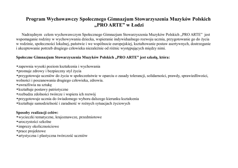 Program Wychowawczy Społecznego Gimnazjum Stowarzyszenia Muzyków Polskich „PRO ARTE” w Łodzi Nadrzędnym celem wychowawczym Społecznego Gimnazjum Stowarzyszenia Muzyków Polskich „PRO ARTE” jest wspomaganie rodziny w wychowywaniu dziecka, wspieranie indywidualnego rozwoju ucznia, przygotowanie go do życia w rodzinie, społeczności lokalnej, państwie i we wspólnocie europejskiej, kształtowanie postaw asertywnych, dostrzeganie i akceptowanie potrzeb drugiego człowieka niezależnie od różnic występujących między nimi. Społeczne Gimnazjum Stowarzyszenia Muzyków Polskich „PRO ARTE” jest szkołą, która: •zapewnia wysoki poziom kształcenia i wychowania •promuje zdrowy i bezpieczny styl życia •przygotowuje uczniów do życia w społeczeństwie w oparciu o zasady tolerancji, solidarności, prawdy, sprawiedliwości, wolności i poszanowania drugiego człowieka, zdrowia. •uwrażliwia na sztukę •kształtuje postawy patriotyczne •rozbudza zdolności twórcze i wspiera ich rozwój •przygotowuje ucznia do świadomego wyboru dalszego kierunku kształcenia •kształtuje samodzielność i zaradność w rożnych sytuacjach życiowych Sposoby realizacji celów: •wycieczki tematyczne, krajoznawcze, przedmiotowe •uroczystości szkolne •imprezy okolicznościowe •prace projektowe •artystyczna i plastyczna twórczość uczniów Lp Zadania Cele Plan działań wychowawczych Sposoby realizacji Termin Odpowiedzia lni Ewaluacja 1. Zapoznanie uczniów i rodziców z dokumentacją regulującą życie szkoły Świadome uczestnictwo Omówienie z rodzicami i uczniami uczniów i rodziców w obowiązujących dokumentów w procesie wychowawczym gimnazjum. szkoły IX wychowawca dyrektor Analiza dokumentów, wpis w dzienniku. 2. Rozpoznanie środowiska rodzinnego uczniów i ich potrzeb. Określenie potrzeb ucznia Indywidualne rozmowy z uczniami i i form pomocy rodzicami. Analiza dostarczonych przez rodziców dokumentów. IX wychowawca dyrektor Analiza dokumentów 3. Uświadomienie sobie Integracja zespołu swoich mocnych i słabych klasowego stron, umiejętność współistnienia w grupie Zajęcia integracyjno-asymilacyjne. Organizacja i udział w uroczystościach szkolnych i klasowych. Założenie księgi klasowej. IX dla wychowawca klasy pierwszej, cały okres edukacji 4. Przygotowanie uczniów do życia społecznego. Prowadzenie zajęć metodami aktywizującymi, tworzenie sytuacji sprzyjających swobodnemu wypowiadaniu się, dyskusji. Warsztaty wskazujące sposoby radzenia sobie ze stresem. Cały okres Wychowawca, edukacji nauczyciele, rodzice, dyrektor 5. Kształtowanie Respektowanie praw umiejętności innych, dążenie do rozwiązywania postawy asertywnej. konfliktów, radzenia sobie ze stresem, właściwego zachowania w trudnych sytuacjach. Zajęcia doskonalące techniki dyskutowania, wyrażania sądów i opinii. Propagowanie pozytywnych wartości przez postawę nauczyciela. Pogadanki nt. zasad zachowania. Zajęcia promujące zachowania asertywne. Cały okres Wychowawca, edukacji nauczyciele, rodzice, dyrektor 6. Propagowanie zdrowego stylu życia Uświadomienie skutków Prezentacja interesujących form niezdrowego trybu życia. spędzania wolnego czasu. Pogadanki Promowanie idei na temat właściwego odżywiania, Cały okres Wychowawca, edukacji nauczyciele, rodzice Nabywanie umiejętności wypowiadania się i wyrażania własnych opinii, bycia asertywnym, radzenia sobie ze stresem. Obserwacja zdrowego trybu życia. Walka z uzależnieniem. Diagnozowanie podstawowych zagrożeń w szkole. higieny osobistej, higieny pracy. Zajęcia terapeutyczne 7. Rozwijanie zainteresowań Rozwijanie uzdolnień poprzez wspieranie i talentów uczniów motywacji wewnętrznej Organizowanie warsztatu pracy. Prezentacja zainteresowań i osiągnięć Cały okres Wychowawca, uczniów. Wymiana doświadczeń nauki nauczyciele, rodzice 8. Tworzenie reguł zachowania w różnych sytuacjach i miejscach. Tworzenie zbioru norm kulturalnego postępowania oraz wzorców zachowań w szkole i miejscach publicznych. Kształtowanie umiejętności doboru stroju i zachowania adekwatnego do okoliczności. Propagowanie właściwych postaw i zachowań. Ocenianie zachowań własnych i innych. Dyskusja, autoprezentacja. 9. Propagowanie zdrowego stylu życia Przestrzeganie higieny Pogadanki. Prezentacja zdrowych, osobistej i higieny pracy. różnorodnych form aktywnego Propagowanie aktywnego wypoczynku. i bezpiecznego wypoczynku 10. Poznawanie religii, zwyczajów, obyczajów innych narodów. Poznawanie odmiennych tradycji, współuczestniczenie w Kształtowanie postaw tolerancji. Cały okres Wychowawca, obserwacja nauki wszyscy nauczyciele Cały okres Wychowawca, nauki nauczyciele, rodzice Zdobywanie wiadomości o Cały okres Wychowawca, tradycjach, kulturze i religiach innych nauki nauczyciele, nardów, przy wykorzystaniu rożnych rodzice źródeł informacji. Organizacja konkursów, uroczystości kulturze regionalnej, narodowej, europejskiej. Rozwijanie akceptacji dla trudności i ograniczeń innych ludzi. Wyrabianie zdolności dostrzegania potrzeb innych ludzi. 11. Kształtowanie aktywnych Rozumienie konieczności postaw w działaniach na ochrony środowiska i rzecz środowiska. dbałości jego utrzymanie Zrozumienie konieczności zachowań ekologicznych. Poznawanie piękna przyrody w regionie, kraju. Zaangażowanie w problematykę ekologiczną -wykonywanie projektów, czynne uczestnictwo w akcji „Sprzątanie świata”, „Dzień Ziemi” Cały okres Wychowawca, nauki nauczyciele, rodzice 12. Uczenie szacunku do Kształtowanie postaw symboli narodowych, patriotycznych. państwowych, religijnych. Poznanie historii kultury i tradycji swojego regionu i kraju. Rozwijanie szacunku dla miejsc pamięci narodowych Uczestnictwo w obchodach świąt narodowych, państwowych i religijnych. Odwiedzanie miejsc pamięci, muzeów i wystaw. Organizowanie wycieczek. Cały okres Wychowawca, nauki nauczyciele, rodzice 13. 