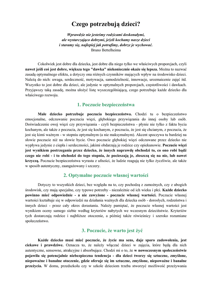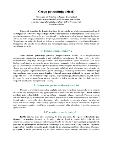 Czego potrzebują dzieci? Wprawdzie nie jesteśmy rodzicami doskonałymi, ale wystarczająco dobrymi, jeżeli kochamy nasze dzieci i staramy się, najlepiej jak potrafimy, dobrze je wychować. Bruno Bettelheima Cokolwiek jest dobre dla dziecka, jest dobre dla niego tylko we właściwych proporcjach, czyli nawet jeśli coś jest dobre, większa tego "dawka" niekoniecznie okaże się lepsza. Można to nazwać zasadą optymalnego efektu, a dotyczy ona różnych czynników mających wpływ na środowisko dzieci. Należą do nich: uwaga, serdeczność, motywacja, samodzielność, innowacje, urozmaicenie zajęć itd. Wszystko to jest dobre dla dzieci, ale jedynie w optymalnych proporcjach, częstotliwości i dawkach. Przyjąwszy taką zasadę, można ułożyć listę wyszczególniającą, czego potrzebuje każde dziecko dla właściwego rozwoju. 1. Poczucie bezpieczeństwa Małe dziecko potrzebuje poczucia bezpieczeństwa. Chodzi tu o bezpieczeństwo emocjonalne, odczuwanie poczucia więzi, głębokiego przywiązania do innej osoby lub osób. Doświadczenie owej więzi czy przywiązania - czyli bezpieczeństwa - płynie nie tylko z faktu bycia kochanym, ale także z poczucia, że jest się kochanym, z poczucia, że jest się chcianym, z poczucia, że jest się kimś ważnym - w stopniu optymalnym (a nie maksymalnym). Akcent spoczywa tu bardziej na słowie poczucie niż na słowie bycie. Owo poczucie głębokiej więzi odczuwane przez dziecko nie wypływa jedynie z ciepła i serdeczności, jakimi obdarzają je rodzice czy opiekunowie. Poczucie więzi jest wynikiem postrzegania przez dziecko, że innych naprawdę obchodzi to, co ono robi bądź czego nie robi - i to obchodzi do tego stopnia, że pocieszają je, złoszczą się na nie, lub nawet krzyczą. Poczucie bezpieczeństwa wyrasta z ufności, że ludzie reagują nie tylko życzliwie, ale także w sposób autentyczny, zaangażowany i szczery. 2. Optymalne poczucie własnej wartości Dotyczy to wszystkich dzieci, bez względu na to, czy pochodzą z zamożnych, czy z ubogich środowisk, czy mają specjalne, czy typowe potrzeby - niezależnie od ich wieku i płci. Każde dziecko powinno mieć odpowiednie - a nie zawyżone - poczucie własnej wartości. Poczucie własnej wartości kształtuje się w odpowiedzi na działania ważnych dla dziecka osób - dorosłych, rodzeństwa i innych dzieci - przez cały okres dorastania. Należy pamiętać, że poczucie własnej wartości jest wynikiem oceny samego siebie według kryteriów nabytych we wczesnym dzieciństwie. Kryteriów tych dostarczają rodzice i najbliższe otoczenie, a później także rówieśnicy i szeroko rozumiane społeczeństwo. 3. Poczucie, że warto jest żyć Każde dziecko musi mieć poczucie, że życie ma sens, daje sporo zadowolenia, jest ciekawe i prawdziwe. Oznacza to, że należy włączać dzieci w zajęcia, które będą dla nich autentyczne, sensowne, atrakcyjne i absorbujące. Chodzi mi o to, że w nowoczesnym społeczeństwie pojawiła się potencjalnie niebezpieczna tendencja - dla dzieci tworzy się sztuczne, zmyślone, niepoważne i banalne otoczenie, gdzie oferuje się im sztuczne, zmyślone, niepoważne i banalne przeżycia. W domu, przedszkolu czy w szkole dzieciom trzeba stworzyć możliwość przeżywania doświadczeń, dzięki którym zaczną postrzegać swoje życie jako autentyczne, wartościowe i satysfakcjonujące. 4. Pomoc w zrozumieniu doświadczeń Dzieci - zwłaszcza małe - potrzebują dorosłych, którzy pomogą im zrozumieć ich własne doświadczenia. Pewne pojęcia i sposoby rozumienia tych doświadczeń kształtują się jeszcze od wczesnego dzieciństwa. Niektóre mogą być błędne lub fałszywe, choć odpowiednie dla danego poziomu rozwoju. Jednym z najważniejszych zadań jest pomóc dzieciom w lepszym, doskonalszym i pełniejszym zrozumieniu ich własnego świata oraz świata innych ludzi. Co dzieci powinny rozumieć? Z pewnością innych ludzi - co robią i dlaczego, co odczuwają i jak się czują, a także siebie i inne żywe istoty w swoim otoczeniu - jak one same i inne stworzenia rosną, skąd pochodzą ludzie i rzeczy, jak rzeczy powstają i funkcjonują itd. 5. Autorytet dorosłych Małe dzieci potrzebują dorosłych, którzy akceptują swój autorytet wynikający z większego doświadczenia, wiedzy i mądrości. Oznacza to, że ani rodzice, ani nauczyciele nie powinni wahać się między dwoma skrajnościami: postawą autorytarną i permisywną. Postawę autorytarną można określić jako egzekwowanie władzy przy braku ciepłych uczuć, zachęty czy wyjaśnienia. Z kolei postawa permisywna to rezygnacja dorosłego z autorytetu i władzy, choć w tym przypadku dzieci mogą otrzymać ciepło, zachętę i wsparcie, jeśli tego potrzebują. Zamiast skrajnej postawy autorytarnej czy permisywnej, dzieci potrzebują autorytetu dorosłych, którzy mając znaczącą władzę nad ich życiem, jednocześnie okazują im ciepło, wsparcie i zachętę oraz w jasny sposób wyjaśniają, dlaczego wytyczyli pewne nieprzekraczalne granice. Autorytet oznacza również traktowanie dzieci z szacunkiem - liczenie się z ich poglądami, odczuciami, pragnieniami i pomysłami, nawet jeśli wywołują nasz sprzeciw. Nietrudno szanować kogoś, z kim się zgadzamy. Szanować kogoś, kto ma odmienne poglądy, pragnienia i odczucia, zwłaszcza takie, których nie aprobujemy, to oznaka mądrości rodziców. 6. Dobre wzorce osobowe Małe dzieci potrzebują optymalnego kontaktu z dorosłymi oraz ze starszymi kolegami, którzy posiadają cechy charakteru, jakie chcielibyśmy w dzieciach rozwinąć. Każdy rodzic może sporządzić listę takich cech. Z pewnością okaże się, że będą między nimi różnice, ale bardzo prawdopodobne jest też, że znajdą się na nich cechy identyczne, takie jak: troska o innych, prawdomówność, uprzejmość, akceptacja dla odmienności, chęć uczenia się itd. Warto odpowiedzieć sobie na pytania: Jak często nasze dzieci