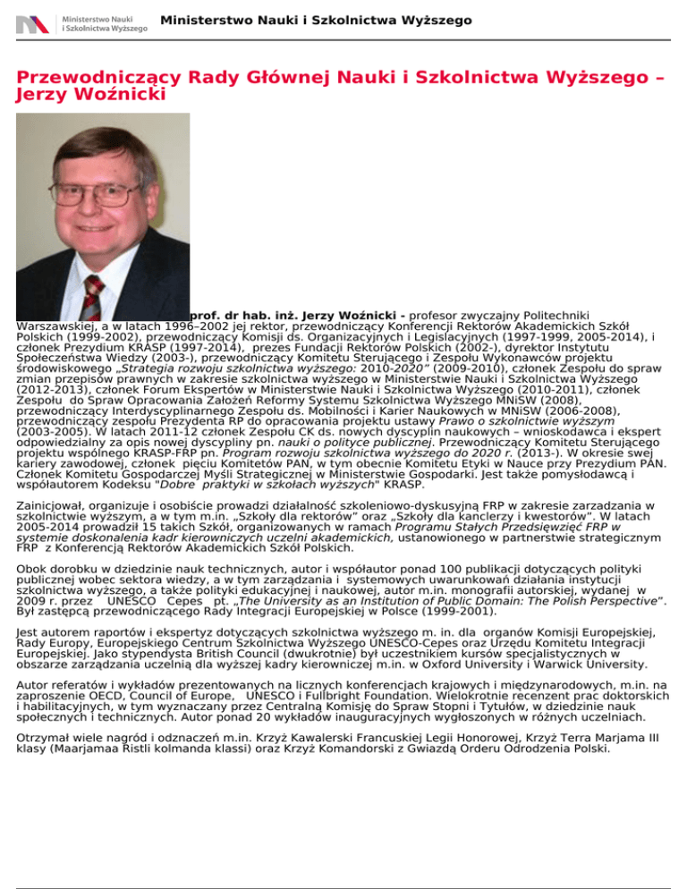 Ministerstwo Nauki i Szkolnictwa Wyższego Przewodniczący Rady Głównej Nauki i Szkolnictwa Wyższego – Jerzy Woźnicki prof. dr hab. inż. Jerzy Woźnicki - profesor zwyczajny Politechniki Warszawskiej, a w latach 1996–2002 jej rektor, przewodniczący Konferencji Rektorów Akademickich Szkół Polskich (1999-2002), przewodniczący Komisji ds. Organizacyjnych i Legislacyjnych (1997-1999, 2005-2014), i członek Prezydium KRASP (1997-2014), prezes Fundacji Rektorów Polskich (2002-), dyrektor Instytutu Społeczeństwa Wiedzy (2003-), przewodniczący Komitetu Sterującego i Zespołu Wykonawców projektu środowiskowego „Strategia rozwoju szkolnictwa wyższego: 2010-2020” (2009-2010), członek Zespołu do spraw zmian przepisów prawnych w zakresie szkolnictwa wyższego w Ministerstwie Nauki i Szkolnictwa Wyższego (2012-2013), członek Forum Ekspertów w Ministerstwie Nauki i Szkolnictwa Wyższego (2010-2011), członek Zespołu do Spraw Opracowania Założeń Reformy Systemu Szkolnictwa Wyższego MNiSW (2008), przewodniczący Interdyscyplinarnego Zespołu ds. Mobilności i Karier Naukowych w MNiSW (2006-2008), przewodniczący zespołu Prezydenta RP do opracowania projektu ustawy Prawo o szkolnictwie wyższym (2003-2005). W latach 2011-12 członek Zespołu CK ds. nowych dyscyplin naukowych – wnioskodawca i ekspert odpowiedzialny za opis nowej dyscypliny pn. nauki o polityce publicznej. Przewodniczący Komitetu Sterującego projektu wspólnego KRASP-FRP pn. Program rozwoju szkolnictwa wyższego do 2020 r. (2013-). W okresie swej kariery zawodowej, członek pięciu Komitetów PAN, w tym obecnie Komitetu Etyki w Nauce przy Prezydium PAN. Członek Komitetu Gospodarczej Myśli Strategicznej w Ministerstwie Gospodarki. Jest także pomysłodawcą i współautorem Kodeksu "Dobre praktyki w szkołach wyższych" KRASP. Zainicjował, organizuje i osobiście prowadzi działalność szkoleniowo-dyskusyjną FRP w zakresie zarzadzania w szkolnictwie wyższym, a w tym m.in. „Szkoły dla rektorów” oraz „Szkoły dla kanclerzy i kwestorów”. W latach 2005-2014 prowadził 15 takich Szkół, organizowanych w ramach Programu Stałych Przedsięwzięć FRP w systemie doskonalenia kadr kierowniczych uczelni akademickich, ustanowionego w partnerstwie strategicznym FRP z Konferencją Rektorów Akademickich Szkół Polskich. Obok dorobku w dziedzinie nauk technicznych, autor i współautor ponad 100 publikacji dotyczących polityki publicznej wobec sektora wiedzy, a w tym zarządzania i systemowych uwarunkowań działania instytucji szkolnictwa wyższego, a także polityki edukacyjnej i naukowej, autor m.in. monografii autorskiej, wydanej w 2009 r. przez UNESCO Cepes pt. „The University as an Institution of Public Domain: The Polish Perspective”. Był zastępcą przewodniczącego Rady Integracji Europejskiej w Polsce (1999-2001). Jest autorem raportów i ekspertyz dotyczących szkolnictwa wyższego m. in. dla organów Komisji Europejskiej, Rady Europy, Europejskiego Centrum Szkolnictwa Wyższego UNESCO-Cepes oraz Urzędu Komitetu Integracji Europejskiej. Jako stypendysta British Council (dwukrotnie) był uczestnikiem kursów specjalistycznych w obszarze zarządzania uczelnią dla wyższej kadry kierowniczej m.in. w Oxford University i Warwick University. Autor referatów i wykładów prezentowanych na licznych konferencjach krajowych i międzynarodowych, m.in. na zaproszenie OECD, Council of Europe, UNESCO i Fullbright Foundation. Wielokrotnie recenzent prac doktorskich i habilitacyjnych, w tym wyznaczany przez Centralną Komisję do Spraw Stopni i Tytułów, w dziedzinie nauk społecznych i technicznych. Autor ponad 20 wykładów inauguracyjnych wygłoszonych w różnych uczelniach. Otrzymał wiele nagród i odznaczeń m.in. Krzyż Kawalerski Francuskiej Legii Honorowej, Krzyż Terra Marjama III klasy (Maarjamaa Ristli kolmanda klassi) oraz Krzyż Komandorski z Gwiazdą Orderu Odrodzenia Polski. Powered by TCPDF (www.tcpdf.org)