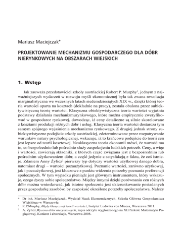 Projektowanie mechanizmu gospodarczego dla dóbr...1 Mariusz Maciejczak* PROJEKTOWANIE MECHANIZMU GOSPODARCZEGO DLA DÓBR NIERYNKOWYCH NA OBSZARACH WIEJSKICH 1.Wstęp Jak zauważa przedstawiciel szkoły austriackiej Robert P. Murphy1, jednym z najważniejszych wydarzeń w rozwoju myśli ekonomicznej była tak zwana rewolucja marginalistyczna we wczesnych latach siedemdziesiątych XIX w., dzięki której teoria wartości oparta na kosztach (dokładnie na pracy), została obalona przez subiektywistyczną teorię wartości. Klasyczna obiektywistyczna teoria wartości wyjaśnia podstawy działania mechanizmurynkowego, które można empirycznie zweryfikować w gospodarce rynkowej, dowodząc, iż ceny detaliczne są silnie skorelowane z kosztami produkcji różnych dóbr i usług. Klasyczna teoria wartości dostarcza tym samym spójnego wyjaśnienia mechanizmu rynkowego. Z drugiej jednak strony subiektywistyczne podejście szkoły austriackiej, zdeterminowane przez rozpatrywanie warunków natury psychologicznej, wskazuje, iż to krańcowe podejście do teorii cen jest lepsze od teorii kosztowej. Neoklasyczna teoria ekonomii mówi, że wartość ma to, co bezpośrednio lub pośrednio służy zaspokojeniu ludzkich potrzeb. Ceny, a więc i wartości, zawierają składniki, z których część związana jest z bezpośrednim lub pośrednim użytkowaniem dóbr, a część jedynie z satysfakcją z faktu, że coś istnieje. Zdaniem Anny Żylicz2 pierwszy typ dotyczy wartości użytkowej danego dobra, natomiast drugi – wartości pozaużytkowej. Poznanie wartości, zarówno użytkowej, jak i pozaużytkowej, jest kluczowe z punktu widzenia potrzeby poznania preferencji społecznych. W tym wypadku pieniądz jest głównym instrumentem, który wskazuje, czego życzy sobie społeczeństwo. Między innymi dzięki porównaniu cen różnych dóbr można wnioskować, jak istotne społecznie jest ukierunkowanie posiadanych przez gospodarkę zasobów, by zaspokoić określone potrzeby społeczeństwa. Należy * Dr inż. Mariusz Maciejczak, Wydział Nauk Ekonomicznych, Szkoła Główna Gospodarstwa Wiejskiego w Warszawie. R.P.Murphy, Błędy klasycznej teorii wartości, Instytut Ludwika von Misesa, Warszawa 2011. 2 A. Żylicz,Wycena dóbr nierynkowych, zapis odczytu wygłoszonego na XLI Szkole Matematyki Poglądowej, Konkret i abstrakcja, Warszawa 2008. 1 2 Mariusz Maciejczak podkreślić, iż to przede wszystkim wartość użytkowa skupiała i skupia nadal uwagę ekonomistów głównego nurtu. W tym kontekście wartość środowiska naturalnego, trudna do oszacowania, rzadko była uwzględniana w rozważaniach ekonomicznych. Jednak wiek XX przyniósł niezaprzeczalną szczupłość podstawowych zasobów kopalnych, a w wielu przypadkach nawet ich wyczerpywanie. Dyskurs ekonomiczny nie mógł już dłużej nie uwzględniać wartości dóbr o charakterze nierynkowym, takich jak środowisko naturalne, w analizie kosztów i korzyści, gdyż prowadziło to w sposób bezpośredni do obniżenia zamiast do wzrostu dobrobytu społecznego. Głównym problemem ekonomistów był więc fakt, że pewne dobra nie pojawiają się na rynku, więc ich ceny nie da się tam zaobserwować, określając obiektywistycznie lub subiektywistycznie ich wartości. Co więcej, nieznany jest mechanizm koordynacji tychże dóbr. Jak wskazuje Tomasz Żylicz3, jeszcze kilkadziesiąt lat temu ekonomia nie dawała odpowiedzi na pytanie o wycenę dóbr nierynkowych. Przełom nastąpił w drugiej połowie XX wieku. Stworzone zostały wtedy pierwsze metody, dzięki którym dobra, w przypadku których nie występują ceny rynkowe, zostały poddawane analizie ekonomicznej przy użyciu pieniądza.Metody te zostały nazwane ekonomią eksperymentalną, a wyraźny wzrost ich znaczenia nastąpił w 2002 r., kiedy Vernon L. Spith otrzymał Nagrodę Nobla w dziedzinie ekonomii za ustanowienie eksperymentów laboratoryjnych narzędziem empirycznej analizy ekonomicznej. Przed ekonomią otwarty został nowy rozdział, w którym oprócz podejścia spekulatywnego i empirycznego stosowano podejście eksperymentalne4. Ekonomiści zaczęli więc projektować eksperymenty, dzięki którym w kontrolowanych warunkach mogą testować poprawność swoich teorii. Głównym założeniem ekonomii eksperymentalnej jest, ile ludzie są gotowi poświęcić z tego, co mają, aby zapewnić sobie dostępność tego, co właśnie chcemy wycenić. 2.Cele i metody Celem artykułu jest omówienie teorii powstawania mechanizmu gospodarczego w odniesieniu do dóbr nierynkowych i przedstawienie jej zastosowania w rolnictwie i obszarach wiejskich. W pracy posłużono się krytycznym przeglądem literatury oraz metodą dokumentacyjną przedstawiającą na przykładzie programów rolnośrodowiskowych opracowanych i wdrażanych w ramach Wspólnej Polityki Rolnej Unii Europejskiej empiryczny dowód zastosowania omawianej teorii. T. Żylicz,Wycena dóbr nierynkowych, Aura, sierpień 2007. M. Maciejczak,Rolnictwoiobszarywiejskieźródłemdóbrpublicznych–przeglądliteratury, Zeszyty Naukowe SGGW, Ekonomika i Organizacja Gospodarki Żywnościowej 2009, z. 75. 3 4 Projektowanie mechanizmu gospodarczego dla dóbr...3 3.Teoria projektowania mechanizmu gospodarczego Ekonomia klasyczna zakłada funkcjonowanie jednego mechanizmu alokacji ograniczonych zasobów i wytworzonych z nich dóbr wobec nieograniczonych potrzeb społeczeństwa, który bazuje na rynku. Poddany on został krytyce przez przedstawicieli nurtu neoklasycznego. Neoklasycy, zwracając uwagę na nieefektywność klasycznego mechanizmu rynkowego, zauważyli i docenili rolę państwa w zakresie koordynacji procesów nie tylko ekonomicznych, ale i – szerzej rzecz ujmując– społeczno-gospodarczych. Przykłady nieporadności mechanizmu rynkowego w aspekcie jego efektywności i społecznej akceptacji występują przy próbach zastosowania neoklasycznego rachunku typu nakłady-efekty, w jego ilościowym ujęciuw odniesieniu do polityki
