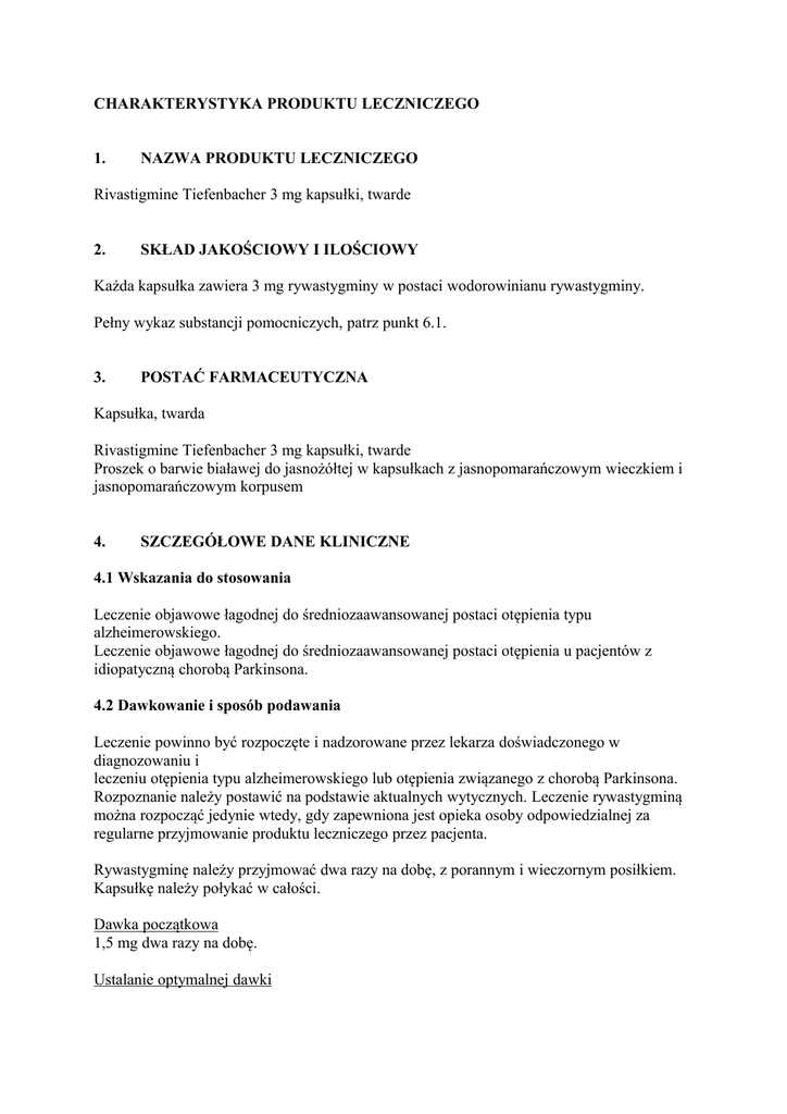 CHARAKTERYSTYKA PRODUKTU LECZNICZEGO 1. NAZWA PRODUKTU LECZNICZEGO Rivastigmine Tiefenbacher 3 mg kapsułki, twarde 2. SKŁAD JAKOŚCIOWY I ILOŚCIOWY Każda kapsułka zawiera 3 mg rywastygminy w postaci wodorowinianu rywastygminy. Pełny wykaz substancji pomocniczych, patrz punkt 6.1. 3. POSTAĆ FARMACEUTYCZNA Kapsułka, twarda Rivastigmine Tiefenbacher 3 mg kapsułki, twarde Proszek o barwie białawej do jasnożółtej w kapsułkach z jasnopomarańczowym wieczkiem i jasnopomarańczowym korpusem 4. SZCZEGÓŁOWE DANE KLINICZNE 4.1 Wskazania do stosowania Leczenie objawowe łagodnej do średniozaawansowanej postaci otępienia typu alzheimerowskiego. Leczenie objawowe łagodnej do średniozaawansowanej postaci otępienia u pacjentów z idiopatyczną chorobą Parkinsona. 4.2 Dawkowanie i sposób podawania Leczenie powinno być rozpoczęte i nadzorowane przez lekarza doświadczonego w diagnozowaniu i leczeniu otępienia typu alzheimerowskiego lub otępienia związanego z chorobą Parkinsona. Rozpoznanie należy postawić na podstawie aktualnych wytycznych. Leczenie rywastygminą można rozpocząć jedynie wtedy, gdy zapewniona jest opieka osoby odpowiedzialnej za regularne przyjmowanie produktu leczniczego przez pacjenta. Rywastygminę należy przyjmować dwa razy na dobę, z porannym i wieczornym posiłkiem. Kapsułkę należy połykać w całości. Dawka początkowa 1,5 mg dwa razy na dobę. Ustalanie optymalnej dawki Dawka początkowa wynosi 1,5 mg dwa razy na dobę. Jeśli dawka ta jest dobrze tolerowana przez pacjenta, po co najmniej dwóch tygodniach leczenia można zwiększyć ją do 3 mg dwa razy na dobę. Kolejne zwiększanie dawki do 4,5 mg, a następnie do 6 mg dwa razy na dobę, możliwe jest w przypadku dobrej tolerancji obecnie stosowanej dawki i może być rozważane po co najmniej dwutygodniowym okresie leczenia poprzednią dawką. Jeśli podczas leczenia pacjentów z otępieniem związanym z chorobą Parkinsona wystąpią działania niepożądane (np. nudności, wymioty, bóle brzucha lub utrata łaknienia), zmniejszenie masy ciała lub nasilenie objawów pozapiramidowych (np. drżenia), pominięcie jednej lub kilku dawek może doprowadzić do ich ustąpienia. W razie utrzymywania się działań niepożądanych należy czasowo zmniejszyć dawkę dobową do poprzedniej dobrze tolerowanej dawki lub leczenie należy przerwać. Dawka podtrzymująca Skuteczna dawka terapeutyczna wynosi 3 do 6 mg dwa razy na dobę. W celu uzyskania maksymalnego działania terapeutycznego, pacjenci powinni kontynuować leczenie, przyjmując produkt leczniczy w największej, dobrze tolerowanej dawce. Zalecana maksymalna dawka dobowa wynosi 6 mg dwa razy na dobę. Leczenie podtrzymujące może być kontynuowane tak długo, jak długo utrzymuje się działanie terapeutyczne. Z tego względu należy regularnie poddawać ponownej ocenie działanie terapeutyczne rywastygminy, szczególnie u pacjentów leczonych dawkami mniejszymi niż 3 mg dwa razy na dobę. Jeśli po 3 miesiącach leczenia dawką podtrzymującą nie nastąpi złagodzenie objawów otępienia, leczenie należy przerwać. Przerwanie leczenia należy również rozważyć, jeśli nie stwierdza się już oznak działania terapeutycznego. Nie jest możliwe przewidzenie indywidualnej reakcji pacjenta na leczenie rywastygminą. Jednak lepsze wyniki leczenia obserwowano u pacjentów z chorobą Parkinsona i umiarkowanym otępieniem. Podobnie, lepsze działanie obserwowano u pacjentów z chorobą Parkinsona i omamami wzrokowymi (patrz punkt 5.1). Nie badano efektów działania terapeutycznego w badaniach klinicznych kontrolowanych placebo, trwających dłużej niż 6 miesięcy. Wznowienie leczenia Jeżeli leczenie przerwano na dłużej niż kilka dni, należy je ponownie rozpoczynać, stosując dawkę 1,5 mg dwa razy na dobę. Ustalanie dawki optymalnej powinno wówczas odbywać się tak, jak opisano powyżej. Zaburzenie czynności nerek i wątroby Ze względu na zwiększenie ekspozycji u pacjentów z umiarkowanym zaburzeniem czynności nerek oraz łagodnymi lub umiarkowanymi zaburzeniami czynności wątroby, należy starannie ustalić wielkość dawki, w zależności od indywidualnej tolerancji (patrz punkt 5.2). Nie prowadzono badań z udziałem pacjentów z ciężkimi zaburzeniami czynności wątroby (patrz punkt 4.3). Dzieci Rywastygmina nie jest zalecana do stosowania u dzieci. 4.3 Przeciwwskazania Stosowanie produktu leczniczego jest przeciwwskazane u pacjentów - z nadwrażliwością na substancję czynną, inne karbaminiany lub na którąkolwiek substancję pomocniczą, - z ciężkimi zaburzeniami czynności wątroby, ze względu na brak badań w tej grupie pacjentów. 4.4 Specjalne ostrzeżenia i środki ostrożności dotyczące stosowania Częstość i nasilenie działań niepożądanych zwiększa się wraz ze zwiększaniem dawki. Jeżeli leczenie przerwano na dłużej niż kilka dni, należy je ponownie rozpoczynać, stosując dawkę 1,5 mg dwa razy na dobę, w celu zmniejszenia możliwości wystąpienia działań niepożądanych (np. wymiotów). Ustalanie optymalnej dawki: Działania niepożądane (np. nadciśnienie tętnicze i omamy u pacjentów z otępieniem występującym w chorobie Alzheimera oraz nasilenie objawów pozapiramidowych, zwłaszcza drżenia u pacjentów z otępieniem związanym z chorobą Parkinsona) obserwowano krótko po zwiększeniu dawki. Działania te mogą ustąpić po zmniejszeniu dawki. W pozostałych przypadkach podawanie rywastygminy przerywano (patrz punkt 4.8). Zaburzenia żołądka i jelit, takie jak nudności i wymioty mogą wystąpić szczególnie w początkowym okresie leczenia i (lub) w okresie zwiększania dawki. Wymienione działania niepożądane częściej występują u kobiet. Pacjenci z chorobą Alzheimera mogą tracić na wadze, co wiązane jest ze stosowaniem inhibitorów cholinoesterazy, w tym rywastygminy. W czasie leczenia rywastygminą, należy kontrolować masę ciała pacjenta. W razie na