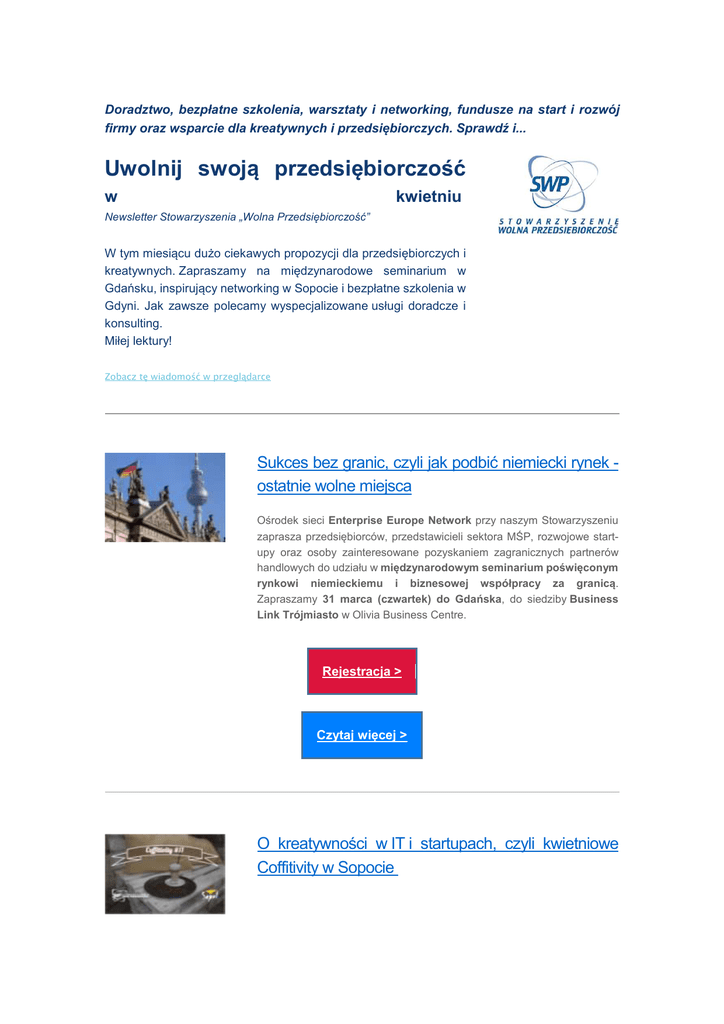 Doradztwo, bezpłatne szkolenia, warsztaty i networking, fundusze na start i rozwój firmy oraz wsparcie dla kreatywnych i przedsiębiorczych. Sprawdź i... Uwolnij swoją przedsiębiorczość w kwietniu Newsletter Stowarzyszenia „Wolna Przedsiębiorczość” W tym miesiącu dużo ciekawych propozycji dla przedsiębiorczych i kreatywnych. Zapraszamy na międzynarodowe seminarium w Gdańsku, inspirujący networking w Sopocie i bezpłatne szkolenia w Gdyni. Jak zawsze polecamy wyspecjalizowane usługi doradcze i konsulting. Miłej lektury! Zobacz tę wiadomość w przeglądarce Sukces bez granic, czyli jak podbić niemiecki rynek ostatnie wolne miejsca Ośrodek sieci Enterprise Europe Network przy naszym Stowarzyszeniu zaprasza przedsiębiorców, przedstawicieli sektora MŚP, rozwojowe startupy oraz osoby zainteresowane pozyskaniem zagranicznych partnerów handlowych do udziału w międzynarodowym seminarium poświęconym rynkowi niemieckiemu i biznesowej współpracy za granicą. Zapraszamy 31 marca (czwartek) do Gdańska, do siedziby Business Link Trójmiasto w Olivia Business Centre. Rejestracja > Czytaj więcej > O kreatywności w IT i startupach, czyli kwietniowe Coffitivity w Sopocie Zapraszamy na wiosenną edycję trójmiejskiego networkingu dla przedsiębiorczych i kreatywnych! O nie takiej prostej historii startupowania, przy małym co nieco, opowie współtwórczyni platformy evenea.pl Agnieszka Oleszczuk-Widawska. Na Coffitivity #11 zapraszamy 13 kwietnia (środa) do surferskomarynistycznych wnętrz Restauracji Mesa w Sopocie. Uwaga! Liczba miejsc ograniczona - obowiązuje rejestracja! Rejestracja > Czytaj więcej > Weź udział w TCD podczas Hannover Messe i zdobądź nowe kontrakty Zapraszamy do udziału w giełdzie kooperacyjnej Technology Cooperation Days, czyli rozmowach B2B dla branży przemysłowej, które odbędą się podczas targów Hannover Messe 2016 w dniach 25-29 kwietnia w Niemczech. Zainteresowanych zapraszamy do kontaktu z konsultantem ośrodka sieci Enterprise Europe Network przy naszym Stowarzyszeniu: [email protected]. Czytaj więcej > Rejestracja > Rozlicz PIT z nami - przyjdź do najlepszego biura rachunkowego w Trójmieście! Trwa czas rozliczeń z fiskusem. Chcesz mieć pewność, że prawidłowo rozliczysz swój PIT i skorzystasz ze wszystkich przysługujących ulg? Przerażają Cię formularze, sprawozdania finansowe i rozliczenia skarbowe? Skorzystaj z pomocy biura rachunkowego przy naszym Stowarzyszeniu. Dopilnujemy terminów, będzie reprezentować Twoją firmę przed urzędami, pomożemy też pozyskać i rozliczyć dotację unijną. Sprawdź! Czytaj więcej > Social Media dla małych przedsiębiorców - otwarte szkolenie W imieniu naszego Partnera PPNT Gdynia zapraszamy do udziału w bezpłatnym szkoleniu dla małych przedsiębiorców na temat aspektów prawnych związanych z korzystaniem z mediów społecznościowych. Spotkanie odbędzie się 5 kwietnia (wtorek) w Pomorskim Parku Naukowo-Technologicznym w Gdyni. Wstęp wolny, obowiązuje rejestracja! Czytaj więcej > Skorzystaj z Instrument MŚP i zdobądź z nami dotacje na innowacje Ośrodek sieci Enterprise Europe Network przy naszym Stowarzyszeniu zaprasza na bezpłatne konsultacje dot. możliwości pozyskania dofinansowania w ramach Instrument MŚP (SME Instrument) w Programie ramowym w zakresie badań naukowych i innowacji Horyzont 2020. Nasi konsultanci bezpłatnie wyjaśnią, jakie możliwości oferuje narzędzie i jak z nich skorzystać, udzielą informacji o zasadach programu i przygotowania wniosków. Czytaj więcej > A może Twój biznes - twoja praca... w Gdyni? Powiatowy Urząd Pracy w Gdyni rozpoczął rekrutację do nowego programu specjalnego adresowanego do osób bezrobotnych. W ofercie m.in. warsztaty przedsiębiorczości, wsparcie informacyjno-doradcze ułatwiające tworzenie biznesplanu i zakładanie działalności gospodarczej oraz środki na założenie firmy i stypendium na czas szkolenia. Organizatorzy czekają na zgłoszenia do 22 kwietnia. Czytaj więcej > BHP, PPOŻ i pierwsza pomoc - profesjonalna obsługa firm Przedsiębiorca zatrudniający co najmniej jednego pracownika, podlega obowiązkom związanym z wymogami przepisów BHP i PPOŻ. Nie wiesz, jak je spełnić? Skontaktuj się z nami! Nasi certyfikowani i doświadczeni instruktorzy pomogą szybko i sprawnie uporać się ze wszystkimi ustawowymi wymaganiami. Czytaj więcej > Szybka ścieżka do innowacji i milionów euro na projekty Fast Track to Innovation (FTI) to akcja pilotażowa zaplanowana na lata 2015 r. i 2016 r. Budżet inicjatywy na poszczególne lata wynosi po 100 mln euro. Co roku Komisja Europejska zamierza wesprzeć od 50 do 70 projektów na zaawansowane i wyspecjalizowane rozwiązania B+R. Maksymalny grant to 3 mln euro, a poziom dofinansowania 70%. . Czytaj więcej > Tymczasem SWP na Facebooku... Zachęcamy do śledzenia naszego profilu na Facebooku - Uwolnij swoją przedsiębiorczość, gdzie polecamy szkolenia, rekomendujemy wydarzenia w regionie i inspirujemy ciekawostkami. Subskrybuj nasze wydarzenia! Lubię to! Subskrybuj > Zdjęcia: pixabay.com; www.pexels.com; Partnerzy. Copyright © 2015 Stowarzyszenie Wolna Przedsiębiorczość, All rights reserved. Nasz adres: Stowarzyszenia „Wolna Przedsiębiorczość” ul. Piekarnicza 12 Gdańsk 80-126 Polska Add us to your address book Uwaga! Korzystanie z newslettera jest dobrowolne i bezterminowe. Zapisując się do newslettera, wyrażasz zgodę na przetwarzanie swoich danych osobowych, w celu otrzymywania newslettera. W celu wysyłania newslettera Stowarzyszenie Wolna Przedsiębiorczość pozyskuje Twoją nazwę adresu poczty elektronicznej. W każdej chwili możesz dokonać zmiany lub usunięcia swoich danych wprowadzonych w procesie rejestracji. Administratorem danych jest Stowarzyszenie Wolna Przedsiębiorczość Oddział Terenowy w Gdańsku, ul. Piekarnicza 12A, 80-126 Gdańsk. Dane są podawane przez Ciebie dobrowolnie, niemniej bez ich pod