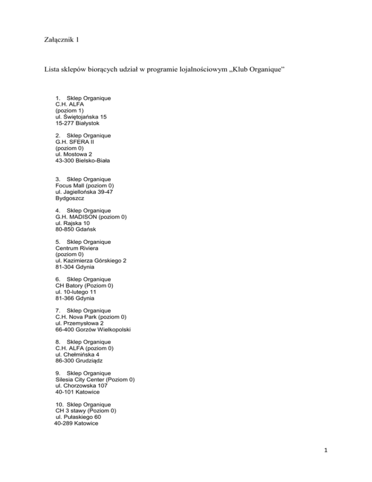 Załącznik 1 Lista sklepów biorących udział w programie lojalnościowym „Klub Organique” 1. Sklep Organique C.H. ALFA (poziom 1) ul. Świętojańska 15 15-277 Białystok 2. Sklep Organique G.H. SFERA II (poziom 0) ul. Mostowa 2 43-300 Bielsko-Biała 3. Sklep Organique Focus Mall (poziom 0) ul. Jagiellońska 39-47 Bydgoszcz 4. Sklep Organique G.H. MADISON (poziom 0) ul. Rajska 10 80-850 Gdańsk 5. Sklep Organique Centrum Riviera (poziom 0) ul. Kazimierza Górskiego 2 81-304 Gdynia 6. Sklep Organique CH Batory (Poziom 0) ul. 10-lutego 11 81-366 Gdynia 7. Sklep Organique C.H. Nova Park (poziom 0) ul. Przemysłowa 2 66-400 Gorzów Wielkopolski 8. Sklep Organique C.H. ALFA (poziom 0) ul. Chełmińska 4 86-300 Grudziądz 9. Sklep Organique Silesia City Center (Poziom 0) ul. Chorzowska 107 40-101 Katowice 10. Sklep Organique CH 3 stawy (Poziom 0) ul. Pułaskiego 60 40-289 Katowice 1 11. Sklep Organique G.H. ECHO (poziom -1) ul. Świętokrzyska 20 25-406 Kielce 12. Sklep Organique GALERIA KORONA (poziom -1) ul. Warszawska 26 25-312 Kielce 13. Skep Organique C.H. Atrium Koszalin (Poziom 0) ul. Paderewskiego 1 75-736 Koszalin 14. Sklep Organique Galeria Bronowice (poziom 0) ul. Stawowa 61 31-346 Kraków 15. Sklep Organique Bonarka City Center (poziom 0) ul. Henryka Kamieńskiego 11 30-644 Kraków 16. Sklep Organique Park Handlowy Zakopianka (poziom 0) ul. Zakopiańska 62 Kraków 17. Sklep Organique Galeria Kazimierz (poziom 0) ul. Podgórska 34 31-536 Kraków 18. Sklep Organique GALERIA OLIMP IV (poziom 1) ul. Spółdzielczości Pracy 30/32 Lublin 19. Sklep Organique CHR Lublin Plaza (poziom 0) ul. Lipowa 13 20-024 Lublin 20. C.H. Łomianki ul. Brukowa 25 Łomianki 21. Sklep Organique C.H. PORT ŁÓDŹ (poziom 0) ul. Pabianicka 245 93-457 Łódź 22. Sklep Organique C.H. Manufaktura ul. J. Karskiego 5 Łódź 2 23. Sklep Organique Aura Centrum (poziom 2) al. Piłsudskiego 16 10-576 Olsztyn 24. Sklep Organique Galeria Warmińska (Poziom 0) Droga Wojewódźka 598 10-959 Olsztyn 25. Sklep Organique King Cross Marcelin (poziom 0) ul. Bukowska 156 60-198 Poznań 26. Sklep Organique City Center (poziom 0) ul. Stanisława Matyi 2 Poznań 27. Sklep Organique Galeria Zielona (poziom 0) ul. Lubelska 2 24-100 Puławy 28. Sklep Organique Galeria Słoneczna (poziom 0) ul. Bolesława Chrobrego 1 26-600 Radom 29. Sklep Organique GALERIA RUMIA (poziom 0) ul. Sobieskiego 11 A 84-230 Rumia 30. Sklep Organique C. H. – U. Focus Mall (poziom 1) ul. B. Chrobrego 1 44-200 Rybnik 31. Sklep Organique GALERIA KASKADA (poziom -1) Aleja Niepodległości 36 70-404 Szczecin 32. Galeria Siedlce (Poziom 0) ul. Józefa Piłsudskiego 74 08-110 Siedlce 33. Sklep Organique ul. Piłsudskiego 6/11 42-600 Tarnowskie Góry 34. Sklep Organique Toruń Plaza (poziom 0) ul. Broniewskiego 90 87-100 Toruń 35. Sklep Organique C.H. Copernicus (poziom 0) ul. Żółkiewskiego 15 87-100 Toruń 3 36. Sklep Organique C.H. Atrium Reduta (poziom 0) Al. Jerozolimskie 148 02-326 Warszawa 37. Sklep Organique C.H. Atrium Promenada (poziom 1) ul. Ostrobramska 75 C 04-175 Warszawa 38. Sklep Organique Dworzec Centralny – Podziemia (poziom -1) Al. Jerozolimskie/al. Jana Pawła II, Lokal 37 00-111 Warszawa 39. Sklep Organique ORGANIQUE KABATY al. KEN 24 U5, Ursynów/Kabaty 02-796 Warszawa 40. Sklep Organique C.H. WOLA PARK (poziom 0) ul. Górczewska 124 01-460 Warszawa 41. Sklep Organique ul. 12-go Marca 218 84-200 Wejherowo 42. Sklep Organique C.H. RENOMA (poziom 2) ul. Świdnicka 40 50-029 Wrocław 43. Sklep Organique G.H. MAGNOLIA PARK (poziom 0) ul. Legnicka 58 54-204 Wrocław 44. Sklep Organique GALERIA DOMINIKAŃSKA (poziom -1) Plac Dominikański 3 50-001 Wrocław 45. Sklep Organique Factory ul. Graniczna 2 54-610 Wrocław 46. Sklep Organique GALERIA FOCUS MALL (poziom 1) ul. Wrocławska 17 65-427 Zielona Góra 47. Sklep Organique Galeria Rzeszów (Poziom -1) Al. Piłsudskiego 44 35-007 Rzeszów 4 48. Sklep Organique (Poziom 0) CHR Sukcesja Al. Politechniki 1 93-590 Łódź 49. Sklep Organique (Poziom 0) ul. Gen Armii Gorbatowa 28 07-410 Ostrołęka 5