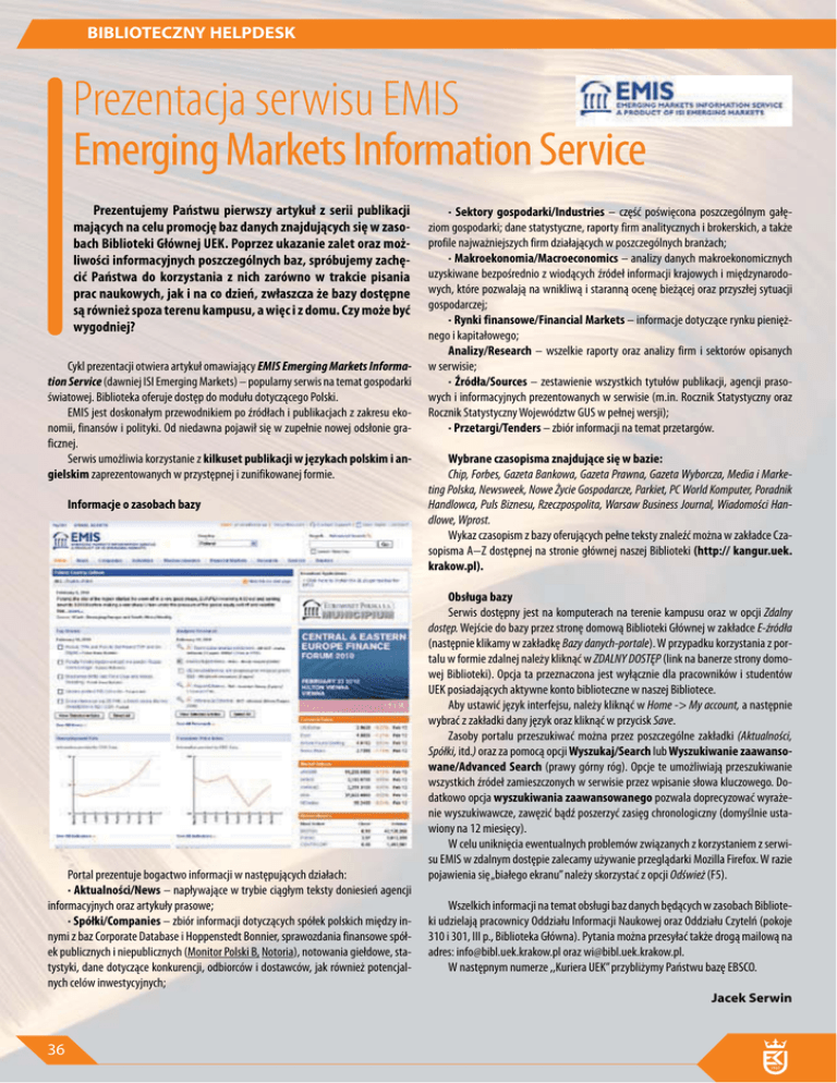 BIBLIOTECZNY HELPDESK Prezentacja serwisu EMIS Emerging Markets Information Service Prezentujemy Państwu pierwszy artykuł z serii publikacji mających na celu promocję baz danych znajdujących się w zasobach Biblioteki Głównej UEK. Poprzez ukazanie zalet oraz możliwości informacyjnych poszczególnych baz, spróbujemy zachęcić Państwa do korzystania z nich zarówno w trakcie pisania prac naukowych, jak i na co dzień, zwłaszcza że bazy dostępne są również spoza terenu kampusu, a więc i z domu. Czy może być wygodniej? Cykl prezentacji otwiera artykuł omawiający EMIS Emerging Markets Information Service (dawniej ISI Emerging Markets) – popularny serwis na temat gospodarki światowej. Biblioteka oferuje dostęp do modułu dotyczącego Polski. EMIS jest doskonałym przewodnikiem po źródłach i publikacjach z zakresu ekonomii, finansów i polityki. Od niedawna pojawił się w zupełnie nowej odsłonie graficznej. Serwis umożliwia korzystanie z kilkuset publikacji w językach polskim i angielskim zaprezentowanych w przystępnej i zunifikowanej formie. Informacje o zasobach bazy Portal prezentuje bogactwo informacji w następujących działach: · Aktualności/News – napływające w trybie ciągłym teksty doniesień agencji informacyjnych oraz artykuły prasowe; · Spółki/Companies – zbiór informacji dotyczących spółek polskich między innymi z baz Corporate Database i Hoppenstedt Bonnier, sprawozdania finansowe spółek publicznych i niepublicznych (Monitor Polski B, Notoria), notowania giełdowe, statystyki, dane dotyczące konkurencji, odbiorców i dostawców, jak również potencjalnych celów inwestycyjnych; · Sektory gospodarki/Industries – część poświęcona poszczególnym gałęziom gospodarki; dane statystyczne, raporty firm analitycznych i brokerskich, a także profile najważniejszych firm działających w poszczególnych branżach; · Makroekonomia/Macroeconomics – analizy danych makroekonomicznych uzyskiwane bezpośrednio z wiodących źródeł informacji krajowych i międzynarodowych, które pozwalają na wnikliwą i staranną ocenę bieżącej oraz przyszłej sytuacji gospodarczej; · Rynki finansowe/Financial Markets – informacje dotyczące rynku pieniężnego i kapitałowego; Analizy/Research – wszelkie raporty oraz analizy firm i sektorów opisanych w serwisie; · Źródła/Sources – zestawienie wszystkich tytułów publikacji, agencji prasowych i informacyjnych prezentowanych w serwisie (m.in. Rocznik Statystyczny oraz Rocznik Statystyczny Województw GUS w pełnej wersji); · Przetargi/Tenders – zbiór informacji na temat przetargów. Wybrane czasopisma znajdujące się w bazie: Chip, Forbes, Gazeta Bankowa, Gazeta Prawna, Gazeta Wyborcza, Media i Marketing Polska, Newsweek, Nowe Życie Gospodarcze, Parkiet, PC World Komputer, Poradnik Handlowca, Puls Biznesu, Rzeczpospolita, Warsaw Business Journal, Wiadomości Handlowe, Wprost. Wykaz czasopism z bazy oferujących pełne teksty znaleźć można w zakładce Czasopisma A−Z dostępnej na stronie głównej naszej Biblioteki (http:// kangur.uek. krakow.pl). Obsługa bazy Serwis dostępny jest na komputerach na terenie kampusu oraz w opcji Zdalny dostęp. Wejście do bazy przez stronę domową Biblioteki Głównej w zakładce E-źródła (następnie klikamy w zakładkę Bazy danych-portale). W przypadku korzystania z portalu w formie zdalnej należy kliknąć w ZDALNY DOSTĘP (link na banerze strony domowej Biblioteki). Opcja ta przeznaczona jest wyłącznie dla pracowników i studentów UEK posiadających aktywne konto biblioteczne w naszej Bibliotece. Aby ustawić język interfejsu, należy kliknąć w Home -> My account, a następnie wybrać z zakładki dany język oraz kliknąć w przycisk Save. Zasoby portalu przeszukiwać można przez poszczególne zakładki (Aktualności, Spółki, itd.) oraz za pomocą opcji Wyszukaj/Search lub Wyszukiwanie zaawansowane/Advanced Search (prawy górny róg). Opcje te umożliwiają przeszukiwanie wszystkich źródeł zamieszczonych w serwisie przez wpisanie słowa kluczowego. Dodatkowo opcja wyszukiwania zaawansowanego pozwala doprecyzować wyrażenie wyszukiwawcze, zawęzić bądź poszerzyć zasięg chronologiczny (domyślnie ustawiony na 12 miesięcy). W celu uniknięcia ewentualnych problemów związanych z korzystaniem z serwisu EMIS w zdalnym dostępie zalecamy używanie przeglądarki Mozilla Firefox. W razie pojawienia się „białego ekranu” należy skorzystać z opcji Odśwież (F5). Wszelkich informacji na temat obsługi baz danych będących w zasobach Biblioteki udzielają pracownicy Oddziału Informacji Naukowej oraz Oddziału Czytelń (pokoje 310 i 301, III p., Biblioteka Główna). Pytania można przesyłać także drogą mailową na adres: [email protected] oraz [email protected]. W następnym numerze ,,Kuriera UEK” przybliżymy Państwu bazę EBSCO. Jacek Serwin 36