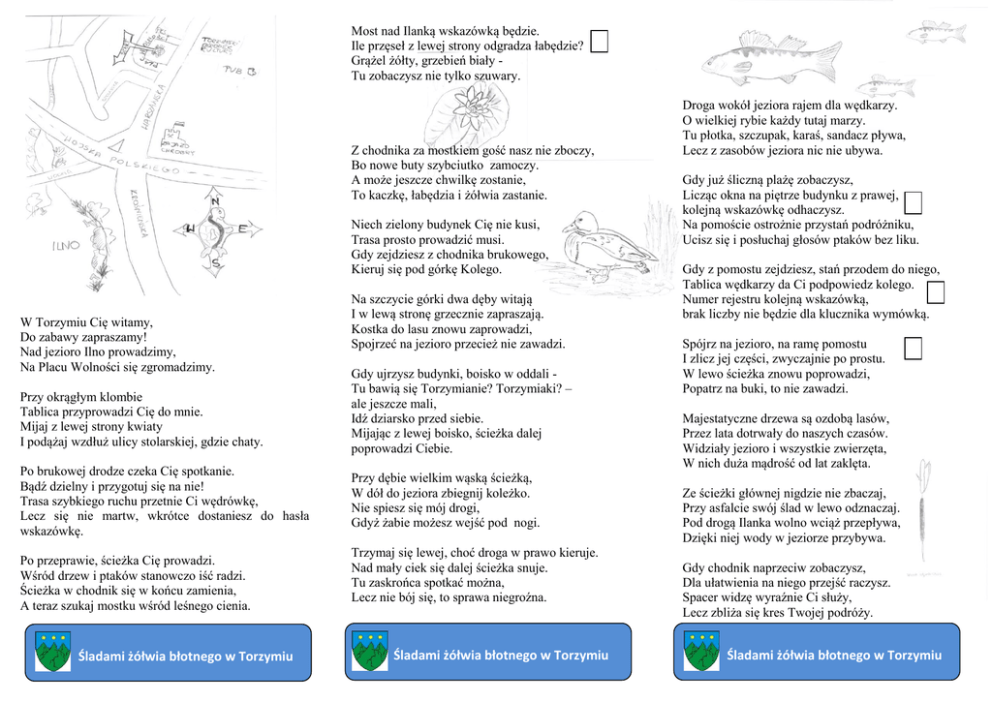 Most nad Ilanką wskazówką będzie. Ile przęseł z lewej strony odgradza łabędzie? Grążel żółty, grzebień biały Tu zobaczysz nie tylko szuwary. Z chodnika za mostkiem gość nasz nie zboczy, Bo nowe buty szybciutko zamoczy. A może jeszcze chwilkę zostanie, To kaczkę, łabędzia i żółwia zastanie. Niech zielony budynek Cię nie kusi, Trasa prosto prowadzić musi. Gdy zejdziesz z chodnika brukowego, Kieruj się pod górkę Kolego. W Torzymiu Cię witamy, Do zabawy zapraszamy! Nad jezioro Ilno prowadzimy, Na Placu Wolności się zgromadzimy. Przy okrągłym klombie Tablica przyprowadzi Cię do mnie. Mijaj z lewej strony kwiaty I podążaj wzdłuż ulicy stolarskiej, gdzie chaty. Po brukowej drodze czeka Cię spotkanie. Bądź dzielny i przygotuj się na nie! Trasa szybkiego ruchu przetnie Ci wędrówkę, Lecz się nie martw, wkrótce dostaniesz do hasła wskazówkę. Po przeprawie, ścieżka Cię prowadzi. Wśród drzew i ptaków stanowczo iść radzi. Ścieżka w chodnik się w końcu zamienia, A teraz szukaj mostku wśród leśnego cienia. Śladami żółwia błotnego w Torzymiu Na szczycie górki dwa dęby witają I w lewą stronę grzecznie zapraszają. Kostka do lasu znowu zaprowadzi, Spojrzeć na jezioro przecież nie zawadzi. Gdy ujrzysz budynki, boisko w oddali Tu bawią się Torzymianie? Torzymiaki? – ale jeszcze mali, Idź dziarsko przed siebie. Mijając z lewej boisko, ścieżka dalej poprowadzi Ciebie. Przy dębie wielkim wąską ścieżką, W dół do jeziora zbiegnij koleżko. Nie spiesz się mój drogi, Gdyż żabie możesz wejść pod nogi. Trzymaj się lewej, choć droga w prawo kieruje. Nad mały ciek się dalej ścieżka snuje. Tu zaskrońca spotkać można, Lecz nie bój się, to sprawa niegroźna. Śladami żółwia błotnego w Torzymiu Droga wokół jeziora rajem dla wędkarzy. O wielkiej rybie każdy tutaj marzy. Tu płotka, szczupak, karaś, sandacz pływa, Lecz z zasobów jeziora nic nie ubywa. Gdy już śliczną plażę zobaczysz, Licząc okna na piętrze budynku z prawej, kolejną wskazówkę odhaczysz. Na pomoście ostrożnie przystań podróżniku, Ucisz się i posłuchaj głosów ptaków bez liku. Gdy z pomostu zejdziesz, stań przodem do niego, Tablica wędkarzy da Ci podpowiedz kolego. Numer rejestru kolejną wskazówką, brak liczby nie będzie dla klucznika wymówką. Spójrz na jezioro, na ramę pomostu I zlicz jej części, zwyczajnie po prostu. W lewo ścieżka znowu poprowadzi, Popatrz na buki, to nie zawadzi. Majestatyczne drzewa są ozdobą lasów, Przez lata dotrwały do naszych czasów. Widziały jezioro i wszystkie zwierzęta, W nich duża mądrość od lat zaklęta. Ze ścieżki głównej nigdzie nie zbaczaj, Przy asfalcie swój ślad w lewo odznaczaj. Pod drogą Ilanka wolno wciąż przepływa, Dzięki niej wody w jeziorze przybywa. Gdy chodnik naprzeciw zobaczysz, Dla ułatwienia na niego przejść raczysz. Spacer widzę wyraźnie Ci służy, Lecz zbliża się kres Twojej podróży. Śladami żółwia błotnego w Torzymiu Gdy wszystkie wskazówki już masz, Do skarbu drogę znasz. „Most” z „Domem” – wartości pomnóż * = Idź dalej szczęśliwy, bo odpowiedź już znasz I ruchliwą drogę do pokonania masz. Zmierzaj tam, gdzie dużo gości Zajazd Chrobry Cię ugości. Wynik z numerem rejestru – sumę utwórz Barman klucz do szkatułki chowa I ucieszy go Twa mowa. Jeśli hasło dobre podasz, To pieczęć do kolekcji dodasz! + = Gdy sumę uzyskasz, drogi przyjacielu, Trudniejsze czekają Cię działania. Do kwadratu ostatnią podpowiedz – to zadania. Teraz ten kwadrat weź i sumę I dodaj czując wielka dumę + = 2 Jeśli szczęście miałeś podróżniku, widok żółwia błotnego dopiszesz do wyniku. Rzadki to widok, bo gad to płochliwy, a jego wiek odgadłeś możliwy. Powiem Ci jeszcze kilka ciekawych słów Jego domem wodny rów. Jak maj i czerwiec zawita, Składa jaja samica pracowita. W sierpniu i wrześniu żółwiątek czas, By wyjść na świat, przywitać nas. Gdy już dorosną, do kilograma ważą, O zjedzeniu muchy czy ślimaka marzą. Gdy zima nadchodzi Żółw wie o tym, że w grupie raźniej się dowodzi. W stan hibernacji zapada, Gdy zbierze się spora gromada. Ich grzbiet ochrania pancerz twardy Karapaks go zwą - nie złamałby go nawet człek hardy. I tak o żółwiu informacji kilka Przekazanie ich to tylko chwilka. Śladami żółwia błotnego w Torzymiu I to koniec tej podróży! Z nami nigdy się nie dłuży! Choć niechętnie Cię żegnamy, To ponownie zapraszamy! Miejsce na Skarb ZWIEDZAJ I BAW SIĘ W KRAINIE SZLAKÓW TURYSTYCZNYCH Śladami żółwia błotnego w Torzymiu Gdzie to jest? Torzym znajduje się w woj. lubuskim, w powiecie sulęcińskim, położony nad rzeką Ilanką i jeziorem Ilno na terenie Stowarzyszenia Kraina Szlaków Turystycznych – Lokalna Grupa Działania. Dojechać tu można drogą krajową nr 92 łączącą Rzepin z Poznaniem, drogą wojewódzką nr 138 łączącą Sulęcin z Gubinem. Do Torzymia również dotrzemy autostradą A2.Wyprawę zaczynamy na ul. Plac Wolności znajdującym się blisko ul. Warszawskiej (DW138) Tematyka: Jeśli nie znalazłeś Skarbu prosimy o zgłoszenie tego do Opiekuna Wyprawy! Opiekun wyprawy: Aleksandra Wilczyk – tel. 660 532 301 www.kst-lgd.pl www.questy.com.pl Tekst i rysunki: Uczestnicy warsztatów z dnia 08.06.2013 r., tj. Aleksandra Wilczyk, Małgorzata Wilczyk, Aleksander Wdowiak, Joanna Masłowska, Anna Jóźwiak Konsultacje: Krzysztof Szustka – trener Questingu Wyprawa zapozna Cię z bogatą przyrodą jeziora Ilno zwanego przez tubylców jeziorem Torzymskim. Jezioro to zaliczane jest do typu sandaczowego, kiedyś do linowosandaczowego. Główną atrakcją jest możliwość spotkania żółwia błotnego, dlatego zapraszamy do wyprawy. Jak szukać skarbu? Przygotuj się na rozwiązywanie zagadek, odkrywanie ukrytych wskazówek oraz wspaniałą przygodę z naturą. Weź ze sobą długopis, wygodne buty i uśmiech na twarzy. 