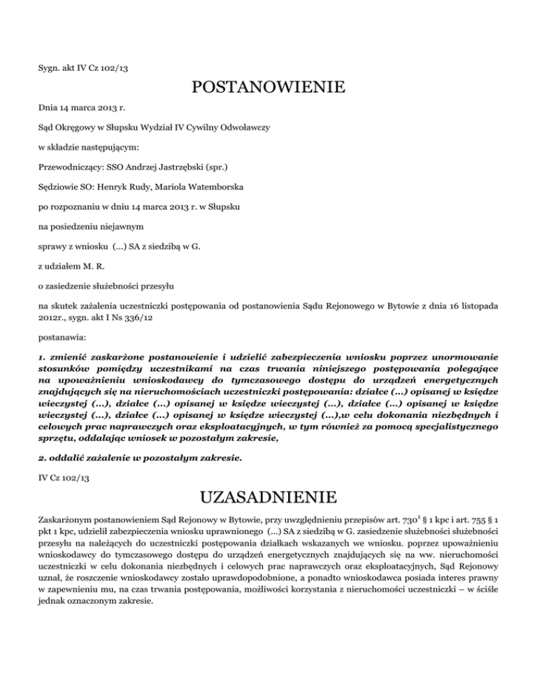 Sygn. akt IV Cz 102/13 POSTANOWIENIE Dnia 14 marca 2013 r. Sąd Okręgowy w Słupsku Wydział IV Cywilny Odwoławczy w składzie następującym: Przewodniczący: SSO Andrzej Jastrzębski (spr.) Sędziowie SO: Henryk Rudy, Mariola Watemborska po rozpoznaniu w dniu 14 marca 2013 r. w Słupsku na posiedzeniu niejawnym sprawy z wniosku (...) SA z siedzibą w G. z udziałem M. R. o zasiedzenie służebności przesyłu na skutek zażalenia uczestniczki postępowania od postanowienia Sądu Rejonowego w Bytowie z dnia 16 listopada 2012r., sygn. akt I Ns 336/12 postanawia: 1. zmienić zaskarżone postanowienie i udzielić zabezpieczenia wniosku poprzez unormowanie stosunków pomiędzy uczestnikami na czas trwania niniejszego postępowania polegające na upoważnieniu wnioskodawcy do tymczasowego dostępu do urządzeń energetycznych znajdujących się na nieruchomościach uczestniczki postępowania: działce (...) opisanej w księdze wieczystej (...), działce (...) opisanej w księdze wieczystej (...), działce (...) opisanej w księdze wieczystej (...), działce (...) opisanej w księdze wieczystej (...),w celu dokonania niezbędnych i celowych prac naprawczych oraz eksploatacyjnych, w tym również za pomocą specjalistycznego sprzętu, oddalając wniosek w pozostałym zakresie, 2. oddalić zażalenie w pozostałym zakresie. IV Cz 102/13 UZASADNIENIE Zaskarżonym postanowieniem Sąd Rejonowy w Bytowie, przy uwzględnieniu przepisów art. 7301 § 1 kpc i art. 755 § 1 pkt 1 kpc, udzielił zabezpieczenia wniosku uprawnionego (...) SA z siedzibą w G. zasiedzenie służebności służebności przesyłu na należących do uczestniczki postępowania działkach wskazanych we wniosku. poprzez upoważnieniu wnioskodawcy do tymczasowego dostępu do urządzeń energetycznych znajdujących się na ww. nieruchomości uczestniczki w celu dokonania niezbędnych i celowych prac naprawczych oraz eksploatacyjnych, Sąd Rejonowy uznał, że roszczenie wnioskodawcy zostało uprawdopodobnione, a ponadto wnioskodawca posiada interes prawny w zapewnieniu mu, na czas trwania postępowania, możliwości korzystania z nieruchomości uczestniczki – w ściśle jednak oznaczonym zakresie. Zażalenie na powyższe postanowienie wywiodła uczestniczka postępowania, która, wnosząc o uchylenie zaskarżonego podniosła, że postanowienie sądu I instancji obarczone jest brakiem precyzyjności co do określenia położenia działek, z których uczestniczka postępowania nie jest właścicielką działki (...), a nadto iż wnioskodawca nie wykazał uprawdopodobnienia roszczenia. W odpowiedzi na zażalenie wnioskodawca wniósł o jego oddalenie. Sąd Okręgowy zważył, co następuje Zażalenie jest w marginalnej części zasadne. W pierwszej kolejności należy wskazać, że charakter prawny zabezpieczenia roszczeń determinują dwie główne cechy, tj. 1) o udzieleniu zabezpieczenia orzeka sąd w specjalnym rodzaju postępowania cywilnego i niezależnie od woli podmiotu, przeciwko któremu jest ono skierowane, oraz 2) zabezpieczenie to pozostaje w bezpośrednim i ścisłym związku z dochodzeniem roszczenia w postępowaniu sądowym lub przed sądem polubownym. Zasadniczym celem postępowania zabezpieczającego, jako postępowania pomocniczego, jest zapewnienie udzielenia natychmiastowej, ale i tymczasowej ochrony prawnej zainteresowanym podmiotom, tak aby całe postępowanie w sprawie osiągnęło swój cel. Pomocniczy cel postępowania zabezpieczającego sprowadza się do tego, że zawsze musi odwoływać się do realiów określonego postępowania rozpoznawczego, a decyzja o udzieleniu zabezpieczenia poprzedzona winna być potrzebą rozważenia konieczności zachowania równowagi pomiędzy sprzecznymi, ważnymi interesami stron, co zawiera dyrektywa zawarta w treści 7301 § 3 kpc, zwana zasadą minimalnej uciążliwości zabezpieczenia. Kierując się powyższą dyrektywą Sąd Rejonowy słusznie zaskarżonym postanowieniem dokonał co do zasady zabezpieczenia poprzez unormowanie stosunków pomiędzy uczestnikami postępowania. W ocenie Sądu Okręgowego w sprawie istniały podstawy udzielenia zabezpieczenia zgodnie z wnioskiem uprawnionej. Przepis art. 7301 kpc określa, kto może żądać przeprowadzenia postępowania zabezpieczającego oraz jakie są warunki zasadności zabezpieczenia. Przepis ten wymaga uprawdopodobnienia roszczenia oraz to, że roszczenie to jemu przysługuje, innymi słowy, musi wykazać wiarygodność roszczenia. Wykazanie istnienia roszczenia nie oznacza jednak udowodnienia faktu, ale jedynie wykazanie jego prawdopodobieństwa. Także interes prawny, jako druga przesłanka zasadności wniosku o zabezpieczenie musi zostać przez uprawnionego (wnioskodawcę) uprawdopodobniony. Interes ten określa się jako obiektywną w świetle obowiązujących przepisów, czyli wywołaną rzeczywistą koniecznością ochrony określonej sfery prawnej, potrzebę uzyskania orzeczenia sądowego o odpowiedniej treści (por. komentarz do art. 7301 kpc pod red. T. Erecińskiego, w: LexPolonica) Zdaniem Sądu Okręgowego uprawniony wnioskodawca zdołał w niniejszym postępowaniu zabezpieczającym uprawdopodobnić zarówno swój wniosek, jak i interes prawny w udzieleniu zabezpieczenia. Zważyć należy, że wnioskodawca zamierza dokonywać niezbędnych prac naprawczych czy eksploatacyjnych napowietrznej sieci energetycznej przebiegającej przez tereny należących do uczestniczki nieruchomości. Podkreślenia wymaga to, że zapadłe w trybie zabezpieczenia rozstrzygnięcie Sądu Rejonowego ma charakter tymczasowy. W rozstrzygnięciu końcowym dopiero Sąd da wyraz ostatecznemu wyważeniu wniosków wypływających z zebranego w sprawie materiału, jak i racji uczestników. Ich analiza zostanie jednak przeprowadzona przez Sąd I instancji w toku dalszego postępowania. Istotnym zatem jest to, że skarżone postanowienie tymczasowo, bo na czas trwania postępowania w sprawie o zasiedzenie służebności przesyłu, regul