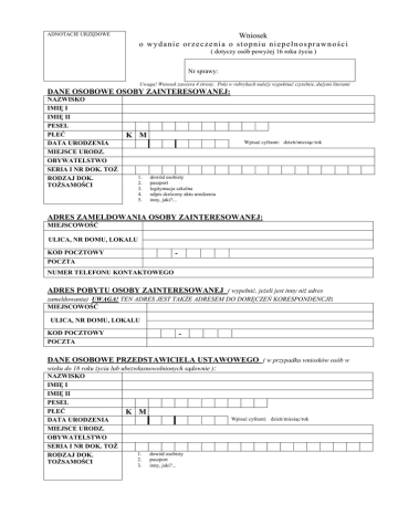 ADNOTACJE URZĘDOWE Wniosek o wydanie orzeczenia o stopniu niepełnosprawności ( dotyczy osób powyżej 16 roku życia ) Nr sprawy: Uwaga! Wniosek zawiera 4 strony. Pola w rubrykach należy wypełniać czytelnie, dużymi literami DANE OSOBOWE OSOBY ZAINTERESOWANEJ: NAZWISKO IMIĘ I IMIĘ II PESEL PŁEĆ DATA URODZENIA MIEJSCE URODZ. OBYWATELSTWO SERIA I NR DOK. TOŻ RODZAJ DOK. TOŻSAMOŚCI K M Wpisać cyframi: dzień/miesiąc/rok 1. 2. 3. 4. 5. dowód osobisty paszport legitymacja szkolna odpis skrócony aktu urodzenia inny, jaki?... ADRES ZAMELDOWANIA OSOBY ZAINTERESOWANEJ: MIEJSCOWOŚĆ ULICA, NR DOMU, LOKALU KOD POCZTOWY - POCZTA NUMER TELEFONU KONTAKTOWEGO ADRES POBYTU OSOBY ZAINTERESOWANEJ ( wypełnić, jeżeli jest inny niż adres zameldowania) UWAGA! TEN ADRES JEST TAKŻE ADRESEM DO DORĘCZEŃ KORESPONDENCJI: MIEJSCOWOŚĆ ULICA, NR DOMU, LOKALU KOD POCZTOWY POCZTA - DANE OSOBOWE PRZEDSTAWICIELA USTAWOWEGO ( w przypadku wniosków osób w wieku do 18 roku życia lub ubezwłasnowolnionych sądownie ): NAZWISKO IMIĘ I IMIĘ II PESEL PŁEĆ DATA URODZENIA MIEJSCE URODZ. OBYWATELSTWO SERIA I NR DOK. TOŻ RODZAJ DOK. TOŻSAMOŚCI K M Wpisać cyframi: dzień/miesiąc/rok 1. 2. 3. dowód osobisty paszport inny, jaki?... ADRES ZAMELDOWANIA/POBYTU PRZEDSTAWICIELA USTAWOWEGO ( w przypadku wniosków osób w wieku do 18 roku życia lub ubezwłasnowolnionych sądownie ): MIEJSCOWOŚĆ ULICA, NR DOMU, LOKALU KOD POCZTOWY POCZTA - TELEFON KONTAKTOWY ZWRACAM SIĘ Z PROŚBĄ O WYDANIE ORZECZENIA O STOPNIU NIEPEŁNOSPRAWNOŚCI DLA CELÓW: X Zaznaczyć Odpowiedniego zatrudnienia Szkolenia Uczestnictwa w terapii zajęciowej Konieczności zaopatrzenia w przedmioty ortopedyczne i środki pomocnicze Korzystania z systemu środowiskowego wsparcia w samodzielnej egzystencji Korzystania z uprawnień na podstawie art. 8 ust.1 z 20.06.1977 r. Prawo o ruchu drogowym ( Dz. U. z 2005r., Nr 108, poz. 908 ) - Karta parkingowa Korzystania ze świadczeń pomocy społecznej Uzyskania zasiłku pielęgnacyjnego Uzyskania przez opiekuna świadczenia pielęgnacyjnego Zamieszkiwania w oddzielnym pokoju Uzyskania przez opiekuna urlopu wychowawczego w dodatkowym wymiarze Korzystania z ulg i uprawnień na podstawie odrębnych przepisów Inne – wymienić jakie: np.: korzystanie z rehabilitacji DANE DOTYCZĄCE SYTUACJI SPOŁECZNEJ I ZAWODOWEJ: Zaznaczyć X STAN CYWILNY: WYKONYWANIE CZYNNOŚCI SAMOOBSŁUGOWYCH: PORUSZANIE SIĘ: PROWADZENIE GOSPODARSTWA DOMOWEGO: WYKSZTAŁCENIE: kawaler / panna żonaty / zamężna separowany / separowana wdowiec / wdowa rozwiedziony / rozwiedziona samodzielnie z pomocą opieka samodzielnie z pomocą opieka samodzielnie z pomocą opieka wyższe średnie zasadnicze podstawowe podstawowe nieukończone i bez wykształcenia ZAWÓD WYUCZONY: CZY AKTUALNIE WYKONUJE PRACĘ: ZAWÓD WYKONYWANY: ZAOPATRZENIE W SPRZĘT POMOCNICZY LUB REHABILITACYJNY: zbędne / wskazane* (jaki rodzaj sprzętu?)………………………………………………….… (właściwe zakreślić) OŚWIADCZENIA: Zaznaczyć X CZY POBIERA ŚWIADCZENIE Z UBEZPIECZENIA SPOŁECZNEGO ? * TAK / NIE CZY POSIADA ORZECZENIE INNEGO ORGANU RENTOWEGO? * ZUS / KRUS/ MWSiA * właściwe zakreślić NAZWA POBIERANEGO ŚWIADCZENIA RENTOWEGO: CZY OSOBA POSIADA / NIE POSIADA ORZECZENIE O STOPNIU NIEPEŁNOSPRAWNOŚCI LUB NIEPEŁNOSPRAWNOŚCI? ( odpowiednie zakreślić ) Jeśli posiada: NR SPRAWY: renta szkoleniowa renta z tytułu częściowej niezdolności do pracy renta z tytułu całkowitej niezdolności do pracy renta z tytułu całkowitej niezdolności do pracy i do samodzielnej egzystencji renta rolnicza z tytułu niezdolności do pracy renta rolnicza szkoleniowa wojskowa renta inwalidzka policyjna renta inwalidzka renta inwalidzka z powodu inwalidztwa I grupy renta inwalidzka z powodu inwalidztwa II grupy renta inwalidzka z powodu inwalidztwa III grupy Jeśli była zaliczona: Do dnia: Jeśli jest zaliczona: Do dnia: CZY OSOBA MOŻE / NIE MOŻE PRZYBYĆ NA POSIEDZENIE SKŁADU ORZEKAJĄCEGO ( odpowiednie zakreślić ) OŚWIADCZAM, ŻE DANE ZAWARTE WE WNIOSKU SĄ ZGODNE ZE STANEM FAKTYCZNYM I PRAWNYM ORAZ JESTEM ŚWIADOMY/A ODPOWIEDZIALNOŚCI KARNEJ ZA ZEZNANIE NIEPRAWDY LUB ZATAJENIE PRAWDY. W ZWIĄZKU Z OBOWIĄZUJĄCĄ USTAWĄ Z DNIA 29.08.97 R. (DZ.U. NR 133/97) O OCHRONIE DANYCH OSOBOWYCH WYRAŻAM ZGODĘ NA PRZETWARZANIE DANYCH DOTYCZĄCYCH MOJEJ OSOBY. …………………, dnia……………. ……………………………………......... podpis wnioskodawcy …………………………………………. podpis przedstawiciela ustawowego INFORMACJE DODATKOWE: 1. 2. 3. składając wniosek należy okazać wymieniony we wniosku dokument potwierdzający tożsamość osoby zainteresowanej, do wniosku należy dołączyć obowiązkowo zaświadczenie lekarskie wydane dla potrzeb Powiatowego Zespołu wydane przez lekarza, pod opieką którego znajduje się wnioskodawca, wydane nie dłużej niż na 30 dni przed dniem złożeniem wniosku; do wniosku załącza się dokumentację medyczną i inne dokumenty medyczne mogące mieć wpływ na ustalenie stopnia niepełnosprawności ( przyjmujemy wyłącznie kserokopie wraz z oryginałami do potwierdzenia zgodności lub ksero potwierdzone za zgodność z oryginałem przez np.: placówkę służby zdrowia lub pomoc społeczną ), UWAGA! WNIOSKI BEZ DOKUMENTACJI MEDYCZNEJ NIE BĘDĄ PRZYJĘTE! 4. jeżeli wniosek składa opiekun prawny, to należy załączyć postanowienie sądu o ustanowieniu opiekuna prawnego ( kserokopię i oryginał do wglądu ) 5. właściwość miejscową zespołu orzekającego ustala się według miejsca pobytu w przypadku osób: a. - bezdomnych b. - przebywających poza miejscem stałego pobytu ponad dwa miesiące ze względów zdrowotnych lub rodzinnych c. - przebywających w zakładach karnych lub poprawczych d. - przebywających w domach pomocy społecznej i ośrodkach wsparcia w rozumieniu przepisów o pomocy społecznej, 6. właściwość miejscową zespołu orzekaj