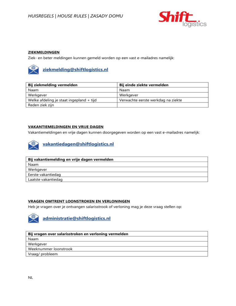 HUISREGELS | HOUSE RULES | ZASADY DOMU ZIEKMELDINGEN Ziek- en beter meldingen kunnen gemeld worden op een vast e-mailadres namelijk: [email protected] Bij ziekmelding vermelden Naam Werkgever Welke afdeling je staat ingepland + tijd Reden ziek zijn Bij einde ziekte vermelden Naam Werkgever Verwachte eerste werkdag na ziekte VAKANTIEMELDINGEN EN VRIJE DAGEN Vakantiemeldingen en vrije dagen kunnen doorgegeven worden op een vast e-mailadres namelijk: [email protected] Bij vakantiemelding en vrije dagen vermelden Naam Werkgever Eerste vakantiedag Laatste vakantiedag VRAGEN OMTRENT LOONSTROKEN EN VERLONINGEN Heb je vragen over je ontvangen salarisstrook of verloning mag je deze vraag stellen op: [email protected] Bij vragen over salarisstroken en verloning vermelden Naam Werkgever Weeknummer loonstrook Vraag/ probleem NL HUISREGELS | HOUSE RULES | ZASADY DOMU Zgłoszenie choroby proszę zgłosić chorobę lub zgłosić możliwość gotowości do pracy po chorobie na adres mailowy: [email protected] proszę wypełnić wszystkie informacje dotyczące zgłoszenia: Zgłoszenie choroby Zgłoszenie gotowości do pracy po chorobie Nazwisko i imię Nazwisko i imię Firma gdzie pracujesz Firma gdzie pracujesz Oddział/ czas pracy Pierwsze zaplanowany dzień pracy po chorobie Rodzaj choroby/powód chorobowy Zgłoszenie urlopu lub wolnego dnia proszę zgłosić urlop lub wolny dzień na adres mailowy: [email protected] proszę wypełnić wszystkie informacje dotyczące zgłoszenia Zgłoszenie urlopu lub wolnego dnia Nazwisko i imię Firma gdzie pracujesz Początek urlopu/dnia wolnego Koniec urlopu/dnia wolnego pytanie o wyciąg z pensji lub inne pytania dotyczące pensji Masz pytanie o wyciąg z pensji lub inne pytanie dotyczące pensji, proszę zgłaszać pytanie na adres mailowy: [email protected] proszę wypełnić wszystkie informacje dotyczące zgłoszenia pytanie o wyciąg z pensji lub inne pytanie o pensję Nazwisko i imię Firma gdzie pracujesz Nr tygodnia który widnieje na wyciągu z pensji, a do którego masz konkretne pytanie lub problem Pytanie lub problem PL HUISREGELS | HOUSE RULES | ZASADY DOMU Illness reports Illness and recovery reports can now be reported to a special e-mail and that is: [email protected] When you are on sick leave report: Name Employer Which departement + time Reason of being sick When you are recovered report : Name Employer Expected first day of working after being sick Holiday reports and free days Holiday reports and free days can be reported to a special e-mail and that is: [email protected] When you want to report your Holiday or free days report: Name Employer First day of your Holiday Last day of your Holiday Questions about payslip and salary Do you have questions about your received salary or payslip, you can ask them on this e-mail: [email protected] When you have questions about salary or payslip report: Name Employer Week number payslip Question/problem EN