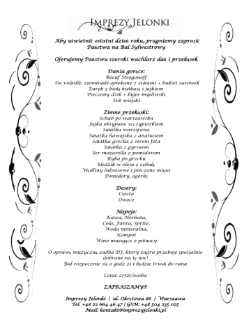 Aby uświetnić ostatni dzień roku, pragniemy zaprosić Państwa na Bal Sylwestrowy Oferujemy Państwu szeroki wachlarz dań i przekąsek Dania gorące: Boeuf Strogonoff De volaille, ziemniaki opiekane z ziołami + bukiet surówek Żurek z białą kiełbasą i jajkiem Pieczony dzik + bigos myśliwski Stół wiejski Zimne przekąski: Schab po warszawsku Jajka obsypane szczypiorkiem Sałatka warzywna Sałatka hawajska z ananasem Sałatka grecka z serem feta Sałatka z gyrosem Ser mozarella z pomidorem Ryba po grecku Śledzik w oleju z cebulą Wędliny luksusowe i pieczone mięsa Pomidory, ogórki Desery: Ciasta Owoce Napoje: Kawa, Herbata, Cola, Fanta, Sprite, Woda mineralna, Kompot Wino musujące o północy O oprawę muzyczną zadba DJ, który zagra przeboje specjalnie dobrane na tę noc! Bal rozpocznie się o godz 21 i będzie trwał do rana Cena: 275zł/osoba ZAPRASZAMY!!! Imprezy Jelonki | ul. Okrętowa 86 | Warszawa Tel. +48 22 664 46 47 | GSM: +48 504 235 025 Mail: [email protected]