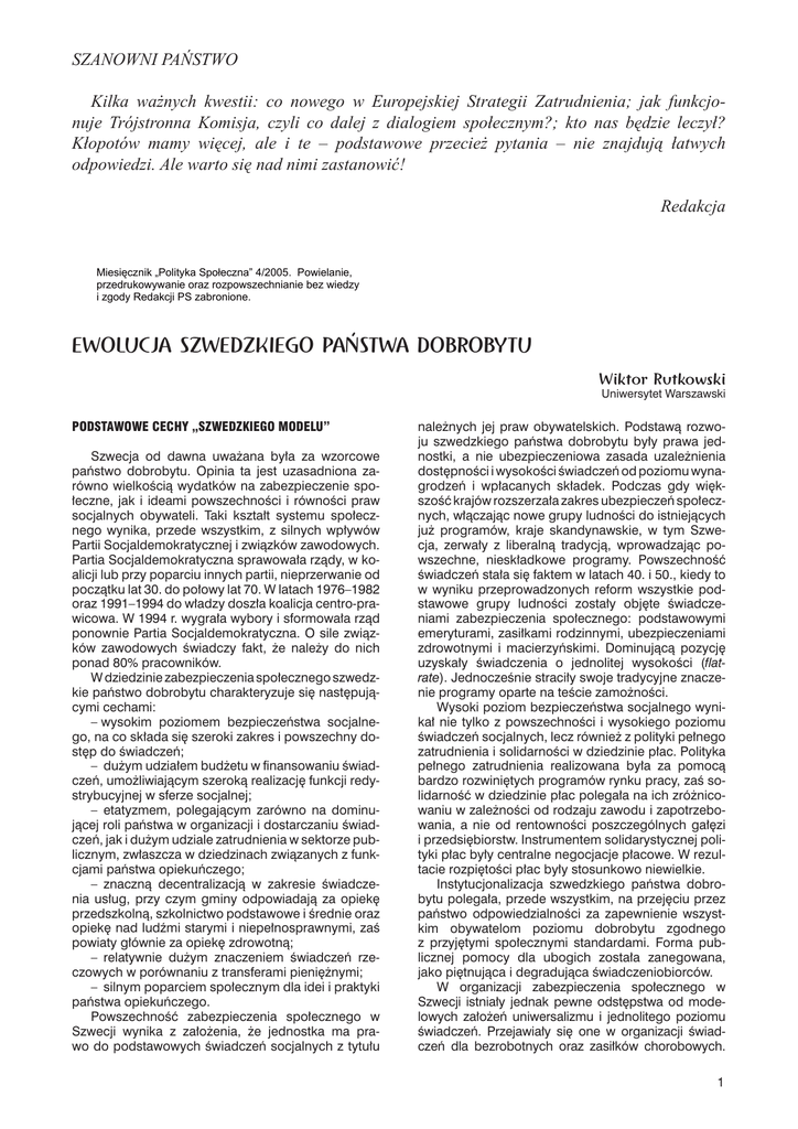 SZANOWNI PAŃSTWO Kilka ważnych kwestii: co nowego w Europejskiej Strategii Zatrudnienia; jak funkcjonuje Trójstronna Komisja, czyli co dalej z dialogiem społecznym?; kto nas będzie leczył? Kłopotów mamy więcej, ale i te – podstawowe przecież pytania – nie znajdują łatwych odpowiedzi. Ale warto się nad nimi zastanowić! Redakcja Miesięcznik „Polityka Społeczna” 4/2005. Powielanie, przedrukowywanie oraz rozpowszechnianie bez wiedzy i zgody Redakcji PS zabronione. EWOLUCJA SZWEDZKIEGO PAŃSTWA DOBROBYTU Wiktor Rutkowski Uniwersytet Warszawski PODSTAWOWE CECHY „SZWEDZKIEGO MODELU” Szwecja od dawna uważana była za wzorcowe państwo dobrobytu. Opinia ta jest uzasadniona zarówno wielkością wydatków na zabezpieczenie społeczne, jak i ideami powszechności i równości praw socjalnych obywateli. Taki kształt systemu społecznego wynika, przede wszystkim, z silnych wpływów Partii Socjaldemokratycznej i związków zawodowych. Partia Socjaldemokratyczna sprawowała rządy, w koalicji lub przy poparciu innych partii, nieprzerwanie od początku lat 30. do połowy lat 70. W latach 1976–1982 oraz 1991–1994 do władzy doszła koalicja centro-prawicowa. W 1994 r. wygrała wybory i sformowała rząd ponownie Partia Socjaldemokratyczna. O sile związków zawodowych świadczy fakt, że należy do nich ponad 80% pracowników. W dziedzinie zabezpieczenia społecznego szwedzkie państwo dobrobytu charakteryzuje się następującymi cechami: – wysokim poziomem bezpieczeństwa socjalnego, na co składa się szeroki zakres i powszechny dostęp do świadczeń; – dużym udziałem budżetu w finansowaniu świadczeń, umożliwiającym szeroką realizację funkcji redystrybucyjnej w sferze socjalnej; – etatyzmem, polegającym zarówno na dominującej roli państwa w organizacji i dostarczaniu świadczeń, jak i dużym udziale zatrudnienia w sektorze publicznym, zwłaszcza w dziedzinach związanych z funkcjami państwa opiekuńczego; – znaczną decentralizacją w zakresie świadczenia usług, przy czym gminy odpowiadają za opiekę przedszkolną, szkolnictwo podstawowe i średnie oraz opiekę nad ludźmi starymi i niepełnosprawnymi, zaś powiaty głównie za opiekę zdrowotną; – relatywnie dużym znaczeniem świadczeń rzeczowych w porównaniu z transferami pieniężnymi; – silnym poparciem społecznym dla idei i praktyki państwa opiekuńczego. Powszechność zabezpieczenia społecznego w Szwecji wynika z założenia, że jednostka ma prawo do podstawowych świadczeń socjalnych z tytułu należnych jej praw obywatelskich. Podstawą rozwoju szwedzkiego państwa dobrobytu były prawa jednostki, a nie ubezpieczeniowa zasada uzależnienia dostępności i wysokości świadczeń od poziomu wynagrodzeń i wpłacanych składek. Podczas gdy większość krajów rozszerzała zakres ubezpieczeń społecznych, włączając nowe grupy ludności do istniejących już programów, kraje skandynawskie, w tym Szwecja, zerwały z liberalną tradycją, wprowadzając powszechne, nieskładkowe programy. Powszechność świadczeń stała się faktem w latach 40. i 50., kiedy to w wyniku przeprowadzonych reform wszystkie podstawowe grupy ludności zostały objęte świadczeniami zabezpieczenia społecznego: podstawowymi emeryturami, zasiłkami rodzinnymi, ubezpieczeniami zdrowotnymi i macierzyńskimi. Dominującą pozycję uzyskały świadczenia o jednolitej wysokości (flatrate). Jednocześnie straciły swoje tradycyjne znaczenie programy oparte na teście zamożności. Wysoki poziom bezpieczeństwa socjalnego wynikał nie tylko z powszechności i wysokiego poziomu świadczeń socjalnych, lecz również z polityki pełnego zatrudnienia i solidarności w dziedzinie płac. Polityka pełnego zatrudnienia realizowana była za pomocą bardzo rozwiniętych programów rynku pracy, zaś solidarność w dziedzinie płac polegała na ich zróżnicowaniu w zależności od rodzaju zawodu i zapotrzebowania, a nie od rentowności poszczególnych gałęzi i przedsiębiorstw. Instrumentem solidarystycznej polityki płac były centralne negocjacje płacowe. W rezultacie rozpiętości płac były stosunkowo niewielkie. Instytucjonalizacja szwedzkiego państwa dobrobytu polegała, przede wszystkim, na przejęciu przez państwo odpowiedzialności za zapewnienie wszystkim obywatelom poziomu dobrobytu zgodnego z przyjętymi społecznymi standardami. Forma publicznej pomocy dla ubogich została zanegowana, jako piętnująca i degradująca świadczeniobiorców. W organizacji zabezpieczenia społecznego w Szwecji istniały jednak pewne odstępstwa od modelowych założeń uniwersalizmu i jednolitego poziomu świadczeń. Przejawiały się one w organizacji świadczeń dla bezrobotnych oraz zasiłków chorobowych. 1 Ubezpieczenia od bezrobocia były od początku podporządkowane organizacyjnie związkom zawodowym i pomimo rosnącej ingerencji państwa do dzisiaj nie zostały w pełni zintegrowane z powszechnym systemem zabezpieczenia społecznego. Wysokość zasiłków dla bezrobotnych jest zróżnicowana i kształtuje się w określonej relacji do wynagrodzeń. Również poziom zasiłków chorobowych jest powiązany z zarobkami. Te odstępstwa od modelowych, przyjętych na przełomie lat 40. i 50., założeń uległy z czasem pogłębieniu. Znalazło to wyraz, przede wszystkim, we wprowadzeniu w 1960 r. uzupełniających świadczeń emerytalnych, powiązanych z wysokością zarobków. W rezultacie z upływem czasu następowała coraz wyraźniejsza zmiana struktury świadczeń pieniężnych: zmniejszał się udział jednolitych świadczeń na rzecz świadczeń uzależnionych od wysokości dochodów. O ile na początku lat 50. świadczenia o jednolitej wysokości wyraźnie przeważały nas świadczeniami przyznawanymi proporcjonalnie do wysokości wynagrodzeń oraz uzależnionymi od poziomu zamożności, o tyle na początku lat 80. dominowały już świadczenia ustalane w relacji do poziomu wynagrodzeń za pracę1