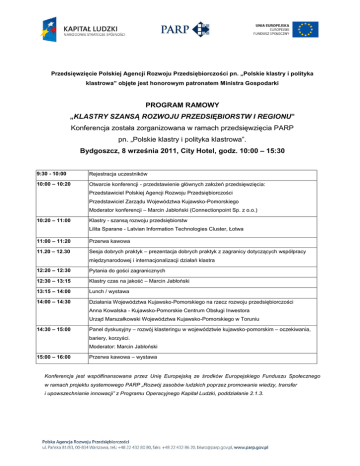 Przedsięwzięcie Polskiej Agencji Rozwoju Przedsiębiorczości pn. „Polskie klastry i polityka klastrowa” objęte jest honorowym patronatem Ministra Gospodarki PROGRAM RAMOWY „KLASTRY SZANSĄ ROZWOJU PRZEDSIĘBIORSTW I REGIONU” Konferencja została zorganizowana w ramach przedsięwzięcia PARP pn. „Polskie klastry i polityka klastrowa”. Bydgoszcz, 8 września 2011, City Hotel, godz. 10:00 – 15:30 9:30 - 10:00 Rejestracja uczestników 10:00 – 10:20 Otwarcie konferencji - przedstawienie głównych założeń przedsięwzięcia: Przedstawiciel Polskiej Agencji Rozwoju Przedsiębiorczości Przedstawiciel Zarządu Województwa Kujawsko-Pomorskiego Moderator konferencji – Marcin Jabłoński (Connectionpoint Sp. z o.o.) 10:20 – 11:00 Klastry - szansą rozwoju przedsiębiorstw Lilita Sparane - Latvian Information Technologies Cluster, Łotwa 11:00 – 11:20 Przerwa kawowa 11.20 – 12.30 Sesja dobrych praktyk – prezentacja dobrych praktyk z zagranicy dotyczących współpracy międzynarodowej i internacjonalizacji działań klastra 12:20 – 12:30 Pytania do gości zagranicznych 12:30 – 13:15 Klastry czas na jakość – Marcin Jabłoński 13:15 – 14:00 Lunch / wystawa 14:00 – 14:30 Działania Województwa Kujawsko-Pomorskiego na rzecz rozwoju przedsiębiorczości Anna Kowalska - Kujawsko-Pomorskie Centrum Obsługi Inwestora Urząd Marszałkowski Województwa Kujawsko-Pomorskiego w Toruniu 14:30 – 15:00 Panel dyskusyjny – rozwój klasteringu w województwie kujawsko-pomorskim – oczekiwania, bariery, korzyści. Moderator: Marcin Jabłoński 15:00 – 16:00 Przerwa kawowa – wystawa Konferencja jest współfinansowana przez Unię Europejską ze środków Europejskiego Funduszu Społecznego w ramach projektu systemowego PARP „Rozwój zasobów ludzkich poprzez promowanie wiedzy, transfer i upowszechnianie innowacji” z Programu Operacyjnego Kapitał Ludzki, poddziałanie 2.1.3. Organizatorem konferencji jest Polska Agencja Miejsce spotkania: Rozwoju Przedsiębiorczości we współpracy City Hotel z Kujawsko-Pomorskim Inwestora przy Województwa Centrum Urzędzie Obsługi Marszałkowskim Kujawsko-Pomorskiego ul. 3 Maja 6 85-950 Bydgoszcz w Toruniu. Konferencja odbywa się pod honorowym patronatem Marszałka Województwa Kujawsko-Pomorskiego. Konferencja organizowana jest w ramach przedsięwzięcia „Polskie klastry i polityka klastrowa”, którego głównym celem jest Źródło: http://maps.google.pl/ wzmocnienie polskich klastrów, podniesienie ich konkurencyjności i zdolności innowacyjnej Organizator spotkania zapewnia tłumaczenie poprzez rozwój kapitału ludzkiego oraz poprzez symultaniczne, poczęstunek w trakcie przerw podniesienie kawowych oraz lunch. efektywności kształtowania polityki klastrowej. W trakcie konferencji dystrybuowane będą darmowe katalogi prezentujące Rejestracja: www.f5/klastry klastry z województwa kujawsko-pomorskiego. Prośba o potwierdzenie udziału/Dodatkowe Równolegle z konferencją odbywać się będą informacje: targi, na których klastry z regionu zaprezentują tel.: (061) 85 66 960 swoją działalność. e-mail: [email protected] Lista wystawców: Zapraszamy również do odwiedzenia 1. Stowarzyszenie Bydgoski Klaster Przemysłowy 2. Stowarzyszenie Producentów Żywności Metodami Ekologicznymi EKOLAND 3. Inowrocławska Lokalna Organizacja Turystyczna (INLOT) 4. Lokalna Organizacja Turystyczna Toruń (LOT Toruń) 5. Ciechociński Klaster Uzdrowiskowy strony: „DOLINA ZDROWIA” http://www.pi.gov.pl/klastry/chapter_95353.asp