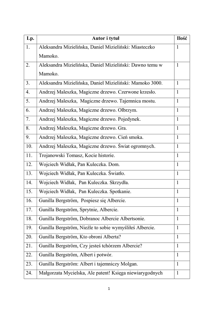 Autor i tytuł Lp. 1. Aleksandra Mizielińska, Daniel Mizieliński: Miasteczko Ilość 1 Mamoko. 2. Aleksandra Mizielińska, Daniel Mizieliński: Dawno temu w 1 Mamoko. 3. Aleksandra Mizielińska, Daniel Mizieliński: Mamoko 3000. 1 4. Andrzej Maleszka, Magiczne drzewo. Czerwone krzesło. 1 5. Andrzej Maleszka, Magiczne drzewo. Tajemnica mostu. 1 6. Andrzej Maleszka, Magiczne drzewo. Olbrzym. 1 7. Andrzej Maleszka, Magiczne drzewo. Pojedynek. 1 8. Andrzej Maleszka, Magiczne drzewo. Gra. 1 9. Andrzej Maleszka, Magiczne drzewo. Cień smoka. 1 10. Andrzej Maleszka, Magiczne drzewo. Świat ogromnych. 1 11. Trojanowski Tomasz, Kocie historie. 1 12. Wojciech Widłak, Pan Kuleczka. Dom. 1 13. Wojciech Widłak, Pan Kuleczka. Światło. 1 14. Wojciech Widłak, Pan Kuleczka. Skrzydła. 1 15. Wojciech Widłak, Pan Kuleczka. Spotkanie. 1 16. Gunilla Bergström, Pospiesz się Albercie. 1 17. Gunilla Bergström, Sprytnie, Albercie. 1 18. Gunilla Bergström, Dobranoc Albercie Albertsonie. 1 19. Gunilla Bergström, Nieźle to sobie wymyśliłeś Albercie. 1 20. Gunilla Bergström, Kto obroni Alberta? 1 21. Gunilla Bergström, Czy jesteś tchórzem Albercie? 1 22. Gunilla Bergström, Albert i potwór. 1 23. Gunilla Bergström: Albert i tajemniczy Molgan. 1 24. Małgorzata Mycielska, Ale patent! Księga niewiarygodnych 1 1 wynalazków. 25. Ulf Nilsson, Kret sam na scenie. 1 26. Yvette Żółtowska- Darska, Ronaldo chłopiec, który wiedział 1 czego chce. 27. Yvette Żółtowska- Darska, Messi chłopiec, który stał się 1 wielkim piłkarzem. 28. Davide Cali, Wróg. 1 29. Davide Cali, Nie odrobiłem lekcji, bo... 1 30. Neil Gaiman, Na szczęście mleko… 1 31. Liliana Bardijewska, O czym szumią muszle. 1 32. Ewa Kozyra-Pawlak, Ja, Bobik, czyli historia o kocie, który 1 myślał, że jest królem. 33. Grzegorz Kasdepke, Zaskórniaki i inne dziwadła z krainy 1 portfela. 34. Grzegorz Kasdepke, Drużyna Pani Miłki, czyli o szacunku, 1 odwadze i innych wartościach. 35. Grzegorz Kasdepke, 45 puknięć w głowę. Słowa i pojęcia, które 1 warto znać. 36. Grzegorz Kasdepke, Wakacje detektywa pozytywki. 1 37. Grzegorz Kasdepke, Co to znaczy… 101 zabawnych historyjek, 1 które pozwolą zrozumieć znaczenie niektórych powiedzeń. 38. Rafał Klimczak, Nudzimisie. 1 39. Rafał Klimczak, Nudzimisie idą do szkoły. 1 40. Karl Martin Widmark, Tajemnica szpitala. 1 41. Karl Martin Widmark, Tajemnica złota. 1 42. Karl Martin Widmark, Tajemnica kina. 1 43. Karl Martin Widmark, Tajemnica cyrku. 1 44. Karl Martin Widmark, Tajemnica szkoły. 1 2 45. Karl Martin Widmark, Tajemnica urodzin. 1 46. Karl Martin Widmark, Tajemnica pożaru. 1 47. Karl Martin Widmark, Tajemnica biblioteki. 1 48. Roald Dahl, Matylda. 1 49. Jeff Kinney, Dziennik Cwaniaczka. 1 50. Jeff Kinney, Dziennik Cwaniaczka. Rodrik rządzi. 1 51. Jeff Kinney, Dziennik Cwaniaczka. Szczyt wszystkiego. 1 52. Jeff Kinney, Dziennik Cwaniaczka. Zezowate szczęście. 1 53. Jeff Kinney, Dziennik Cwaniaczka. Ubaw po pachy. 1 54. Jeff Kinney, Dziennik Cwaniaczka. Przykra prawda. 1 55. Jeff Kinney, Dziennik Cwaniaczka. Biała gorączka. 1 56. Jeff Kinney, Dziennik Cwaniaczka. Trzeci do pary. 1 57. Jeff Kinney, Dziennik Cwaniaczka. Droga przez mękę. 1 58. Wanda Chotomska, Pięciopsiaczki. 1 59. Grzegorz Kasdepke, Kuba i Buba czyli awantura do kwadratu. 1 60. Dorota Terakowska, Władca Lewaru. 1 61. Barbara Kosmowska, Sezon na zielone kasztany. 1 62. Anna Onichimowska, Duch starej kamienicy. 1 63. J.R.R. Tolkien, Władca pierścieni. Drużyna pierścienia. 1 64. J.R.R. Tolkien, Władca pierścieni. Dwie wieże. 1 65. J.R.R. Tolkien, Władca pierścieni. Powrót króla. 1 66. Agnieszka Chylińska, Zezia i Giler. 1 67. Agnieszka Chylińska, Zezia, Giler i Oczak. 1 68. Lincoln Peirce, Zapiski Luzaka. Skazany na sukces. 1 69. Lincoln Peirce, Zapiski Luzaka. Ale jazda! 1 70. Lincoln Peirce, Zapiski Luzaka. Natan świruje. 1 71. Lincoln Peirce, Zapiski Luzaka. Natan znowu w akcji. 1 72. Alan MacDonald, Radek Szkaradek. Robale. 1 3 73. Alan MacDonald, Radek Szkaradek. Zarazki. 1 74. Alan MacDonald, Radek Szkaradek. Całus. 1 75. Alan MacDonald, Radek Szkaradek. Kły. 1 76. Alan MacDonald, Radek Szkaradek. Aport. 1 77. Alan MacDonald, Radek Szkaradek. Święta. 1 78. Wojciech Cesarz, Katarzyna Terechowicz, Pamiętnik 1 grzecznego psa. 79. Wojciech Cesarz, Katarzyna Terechowicz, Nowe przygody 1 grzecznego psa. 80. Liz Pichon, Tomek Łebski. 1 81. Liz Pichon, Tomek Łebski. Fantastyczne wymówki (i inne 1 pomysły). 82. Liz Pichon, Tomek Łebski ma chrapkę na smakołyki. 1 83. Liz Pichon, Tomek Łebski wymiata (prawie zawsze). 1 84. Grzegorz Kasdepke, Detektyw pozytywka. 1 85. Grzegorz Kasdepke, Bon czy ton. Savoir-vivre dla dzieci. 1 86. Francesca Simon, Koszmarny Karolek. Dożarta wróżka 1 zębuszka. 87. Francesca Simon, Koszmarny Karolek. Moje wszystkie 1 koszmary. 88. Francesca Simon, Koszmarny Karolek. Tajny klub na wojnie. 1 89. Francesca Simon, Koszmarny Karolek. Potwory i stwory. 1 90. Francesca Simon, Koszmarny Karolek. Napadzisty tyłek. 1 91. Tomasz Małkowski, Poszukiwacze zaginionej wazy. 1 92. Megan MacDonald, Hania Humorek i wielki pech. 1 93. Megan MacDonald, Hania Humorek ratuje świat. 1 94. Megan MacDonald, Hania Humorek przepowiada przyszłość. 1 95. Megan MacDonald, Hania Humorek zostaje gwiazdą. 1 4 96. Sue Bentley, Magiczny kotek. Podwójne kłopoty. 1 97. Sue Bentley, Magiczny kotek. Letni czar. 1 98. Sue Bentley, Magiczny kotek. Chcę być sławna. 1 99. Alex Frith, O czym muczą wiedzieć chłopcy? 1 100. Nela na tropie przygód. 1 101. David Walliams, Babcia Rabuś. 1 102. Susan Meredith, O czym dziewczynki muszą wiedzieć? 1 103. Anna Sójka, Bazgroły ze szkoły. 1 104. Holly Webb, Na ratunek Rufiemu. 1 105. Joanna Krzyżanek, Cecylka Knedelek. 1 106. Anna Sójka, Szkoła czarownic. 1 107. Holly Webb, Biedna, mała Luna. 1 108. Renata Opala, Dzienniczek zakręconej nastolatki. (6 części). 1 5