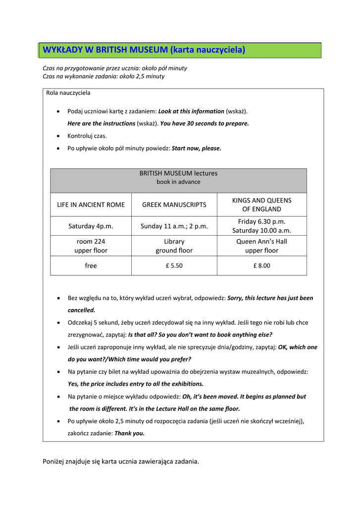 WYKŁADY W BRITISH MUSEUM (karta nauczyciela) Czas na przygotowanie przez ucznia: około pół minuty Czas na wykonanie zadania: około 2,5 minuty Rola nauczyciela Podaj uczniowi kartę z zadaniem: Look at this information (wskaż). Here are the instructions (wskaż). You have 30 seconds to prepare. Kontroluj czas. Po upływie około pół minuty powiedz: Start now, please. BRITISH MUSEUM lectures book in advance LIFE IN ANCIENT ROME GREEK MANUSCRIPTS KINGS AND QUEENS OF ENGLAND Saturday 4p.m. Sunday 11 a.m.; 2 p.m. Friday 6.30 p.m. Saturday 10.00 a.m. room 224 upper floor Library ground floor Queen Ann’s Hall upper floor free £ 5.50 £ 8.00 Bez względu na to, który wykład uczeń wybrał, odpowiedz: Sorry, this lecture has just been cancelled. Odczekaj 5 sekund, żeby uczeń zdecydował się na inny wykład. Jeśli tego nie robi lub chce zrezygnować, zapytaj: Is that all? So you don’t want to book anything else? Jeśli uczeń zaproponuje inny wykład, ale nie sprecyzuje dnia/godziny, zapytaj: OK, which one do you want?/Which time would you prefer? Na pytanie czy bilet na wykład upoważnia do obejrzenia wystaw muzealnych, odpowiedz: Yes, the price includes entry to all the exhibitions. Na pytanie o miejsce wykładu odpowiedz: Oh, it’s been moved. It begins as planned but the room is different. It’s in the Lecture Hall on the same floor. Po upływie około 2,5 minuty od rozpoczęcia zadania (jeśli uczeń nie skończył wcześniej), zakończ zadanie: Thank you. Poniżej znajduje się karta ucznia zawierająca zadania. WYKŁADY W BRITISH MUSEUM (karta ucznia) Masz 30 sekund na przygotowanie się do tego zadania. Chcesz się wybrać z parą znajomych na wykład w British Museum, macie wszyscy czas tylko w najbliższy weekend. Korzystając z informacji podanych poniżej, wybierz wykład i odpowiadający wam termin. BRITISH MUSEUM lectures book in advance LIFE IN ANCIENT ROME GREEK MANUSCRIPTS KINGS AND QUEENS OF ENGLAND Saturday 4 p.m. Sunday 11 a.m.; 2 p.m. Friday 6.30 p.m. Saturday 10.00 a.m. room 224 upper floor Library ground floor Queen Ann’s Hall upper floor free £ 5.50 £ 8.00 Zadanie 1. Zadzwoń do muzeum i dokonaj rezerwacji. Zadanie 2. Dowiedz się, czy bilet na wykład upoważnia również do obejrzenia wystaw muzealnych. Zadanie 3. Upewnij się, że wiesz, gdzie odbywa się wykład. Zadanie rozpoczyna nauczyciel.