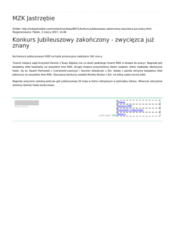 MZK Jastrzębie Źródło: http://mzkjastrzebie.com/mzk/komunikaty/8973,Konkurs-Jubileuszowy-zakonczony-zwyciezca-juz-znany.html Wygenerowano: Piątek, 3 marca 2017, 14:46 Konkurs Jubileuszowy zakończony - zwycięzca już znany Na Konkurs Jubileuszowym MZK na hasło promocyjne nadesłano 342 sms-y. Trzecie miejsce zajął Krzysztof Konicki z Rudy Śląskiej (na co dzień podróżuje liniami MZK w drodze do pracy). Nagrodą jest bezpłatny bilet kwartalny na wszystkie linie MZK. Drugie miejsce przyznaliśmy dwóm osobom, które nadesłały identyczne hasło. Są to: Dawid Pietraszek z Czerwionki-Leszczyn i Szymon Kowalczyk z Żor. Każdy z panów otrzyma bezpłatny bilet półroczny na wszystkie linie MZK. Zwycięzcą konkursu została Monika Wuwer z Żor, na którą czeka roczny bilet. Nagrody wręczone zostaną podczas gali jubileuszowej 20 maja w Domu Zdrojowym w Jastrzębiu-Zdroju. Wówczas odczytane zostaną również hasła konkursowe. Drukuj Generuj PDF Ocena: 5/5 (5) Powiadom znajomego Liczba wejść: 1401 Wstecz