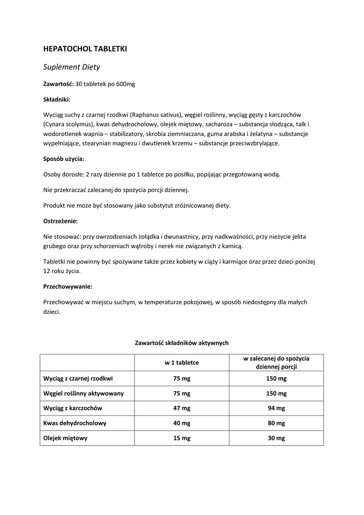 HEPATOCHOL TABLETKI Suplement Diety Zawartośd: 30 tabletek po 600mg Składniki: Wyciąg suchy z czarnej rzodkwi (Raphanus sativus), węgiel roślinny, wyciąg gęsty z karczochów (Cynara scolymus), kwas dehydrocholowy, olejek miętowy, sacharoza – substancja słodząca, talk i wodorotlenek wapnia – stabilizatory, skrobia ziemniaczana, guma arabska i żelatyna – substancje wypełniające, stearynian magnezu i dwutlenek krzemu – substancje przeciwzbrylające. Sposób użycia: Osoby dorosłe: 2 razy dziennie po 1 tabletce po posiłku, popijając przegotowaną wodą. Nie przekraczad zalecanej do spożycia porcji dziennej. Produkt nie może byd stosowany jako substytut zróżnicowanej diety. Ostrzeżenie: Nie stosowad: przy owrzodzeniach żołądka i dwunastnicy, przy nadkwaśności, przy nieżycie jelita grubego oraz przy schorzeniach wątroby i nerek nie związanych z kamicą. Tabletki nie powinny byd spożywane także przez kobiety w ciąży i karmiące oraz przez dzieci poniżej 12 roku życia. Przechowywanie: Przechowywad w miejscu suchym, w temperaturze pokojowej, w sposób niedostępny dla małych dzieci. Zawartośd składników aktywnych w 1 tabletce w zalecanej do spożycia dziennej porcji Wyciąg z czarnej rzodkwi 75 mg 150 mg Węgiel roślinny aktywowany 75 mg 150 mg Wyciąg z karczochów 47 mg 94 mg Kwas dehydrocholowy 40 mg 80 mg Olejek miętowy 15 mg 30 mg