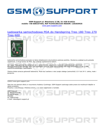 GSM-Support ul. Bitschana 2/38, 31-420 Kraków mobile +48 608107455, NIP PL9451852164 REGON: 120203925 www.gsm-support.com Ładowarka samochodowa PDA do Handspring Treo 180 Treo 270 Treo 600 Ładowarka samochodowa pozwala na łatwe doładowanie akumulatora podczas podróży. Wystarczy podpiąć ją do gniazda zapalniczki, a drugi koniec do PDA, aby uniknąć rozładowania baterii. Już nigdy Twój palmtop nie rozładuje się w samochodzie - idealna na wycieczki samochodowe i podróże! Pomaga podtrzymać energię, która jest niezbędna podczas jazdy samochodem dla osób korzystających np. z GPS zsynchronizowanego z palmtopem. Zielona dioda oznacza gotowość ładowania. Może być zasilana z sieci prądu stałego (samochód) 12 V lub 24 V. Lekka, mała i poręczna. ©2012 www.gsm-support.com Opis ten nie stanowi oferty w rozumieniu Kodeksu Cywilnego. GSM-Support zastrzega sobie prawo do możliwych błędów w opisie produktu. Prosimy o weryfikację z Państwa strony, a w razie wątpliwości o kontakt. GSM-Support ul. Bitschana 2/38 31-420 Kraków POLSKA tel. 608107455 e-mail: [email protected] Powered by TCPDF (www.tcpdf.org)