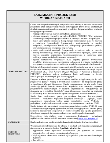 ZARZADZANIE PROJEKTAMI W ORGANIZACJACH CHARAKTERYSTYKA Celem studiów podyplomowych jest przekazanie wiedzy w zakresie zarządzania projektami oraz nabycie umiejętności ułatwiających prowadzenie skutecznych działań menedżerskich podczas realizacji projektów. Program studiów obejmuje następujące zagadnienia: - wiedzę podstawową z zakresu zarządzania projektami, - wiodące standardy i metodyki zarządcze PMBoK, PRINCE2, PCM, wytyczne kompetencji zarządzania projektami IPMA, metodyki zwinne i adaptacyjne, - pakiet umiejętności miękkich (kompetencje behawioralne m.in. w zakresie przywództwa, komunikacji, kreatywności, zorientowania na wyniki, motywacji, rozwiązywania konfliktów, efektywnego prowadzenia spotkań, sprawności działania oraz pracy zespołowej), - pakiet umiejętności twardych (kompetencje techniczne m.in. w zakresie analizy interesariuszy, analizy ryzyka, definiowania wymagań, celów oraz zakresu projektu, organizacji, harmonogramowania i sterowania jego realizacją, zarządzania budżetem oraz zmianami), - zajęcia kontekstowe obejmujące m.in. aspekty prawne prowadzenia projektów, innowacyjność, nowoczesne technologie i systemy produkcyjne oraz praktyczne spojrzenie na realizację projektów w przemyśle lub biznesie. Nabyta wiedza zostanie rozszerzona o umiejętność posługiwania się wybranymi narzędziami informatycznymi na zaawansowanym poziomie (Microsoft Project Professional 2013 oraz P2ware Project Manager 7 Personal z dodatkiem PRINCE2). Wybrane zajęcia praktyczne będą realizowane w formie interaktywnych zespołowych gier symulacyjnych. Program studiów pozwala kierować ofertę studiów podyplomowych do osób pragnących posiąść wiedzę i kwalifikacje niezbędne do rozpoczęcia pracy w charakterze Project Managera. Studia przeznaczone są dla osób, które zamierzają pełnić funkcje kierowników projektów oraz członków zespołów projektowych realizowanych w różnych organizacjach. Przygotowują do ubiegania się o certyfikat Certified Project Management Associate na poziomie D afiliowany przez International Project Management Association (IPMA). Studia będą realizowane przez pracowników Instytutu Innowacyjności Procesów i Produktów Wydziału Inżynierii Produkcji i Logistyki, część przedmiotów prowadzona będzie przez specjalistów spoza Wydziału – praktyków z wieloletnim doświadczeniem zawodowym oraz członków IPMA. Studia kończą się warsztatami przygotowującymi do egzaminu IPMA D wraz z wewnętrznym (próbnym) egzaminem pre-certyfikacyjnym oraz obroną pracy końcowej realizowanej zespołowo w formie projektu pod opieką promotora. Absolwent otrzymuje świadectwo ukończenia studiów podyplomowych. Szczegółowy opis studiów wraz z programem kształcenia i sylwetkami wykładowców można znaleźć na stronie internetowej www.zpo.po.opole.pl. WYMAGANIA Dyplom ukończenia studiów (studia licencjackie/inżynierskie/magisterskie). WARUNKI REKRUTACJI Warunkiem zakwalifikowania do udziału w studiach jest złożenie następujących dokumentów w terminie do dnia 7 października 2016 r. - wypełniona karta zgłoszenia uczestnictwa (do pobrania na stronie po.opole.pl rekrutacja studia podyplomowe), - odpis dyplomu ukończenia studiów wyższych lub poświadczona kserokopia dyplomu, - dwa zdjęcia. Warunkiem uruchomienia każdej edycji studiów jest rekrutacja minimum 16 kandydatów. Limit przyjęć wynosi 32 osoby na cykl studiów. Listy rankingowe kandydatów sporządza się na podstawie kolejności zgłoszeń. CYKL KSZTAŁCENIA Studia realizowane są cyklicznie w ramach dwusemestralnego toku kształcenia (od października do czerwca lub od marca do lutego) i obejmują łącznie 200 godzin zajęć dydaktycznych (wykładowych, ćwiczeniowych i praktycznych). Program studiów zawiera 18 przedmiotów, w tym warsztaty przygotowujące do egzaminu IPMA D wraz z wewnętrznym (próbnym) egzaminem precertyfikacyjnym. DATA ROZPOCZĘCIA Nabór na studia będzie uruchamiany cyklicznie co semestr. W roku akademickim 2016/2017 planuje się rozpoczęcie studiów w październiku 2016 r. oraz marcu 2017 r. TERMINY ZAJĘĆ Zajęcia dydaktyczne będą realizowane w blokach tematycznych zgodnie z przyjętym harmonogramem: w piątki od godz. 16:00 do 19:15 i w soboty od godz. 9:00 do 15:45 (średnio dwa razy w miesiącu). Terminy zjazdów zostaną podane słuchaczom do wiadomości w październiku 2016 r. OPŁATA SEMESTRALNA 1800 zł/semestr KIEROWNIK STUDIÓW Dr inż. Iwona Łapuńka KONTAKT www.zpo.po.opole.pl (uruchomienie strony internetowej – sierpień 2016 r.) tel.: +48 602 573 139, + 48 600 681 018 e-mail: [email protected] DODATKOWE INFORMACJE DLA SŁUCHACZY Komplet dokumentów należy złożyć w terminie do dnia 7 października 2016 r. w Centrum Obsługi Studenta Politechniki Opolskiej w Dziale Dokumentacji Przebiegu Studiów WI, pok. 101, p. I przy ul. Mikołajczyka 16 w godzinach od 8:00 do 15:00 lub przesłać listem poleconym na adres: Centrum Obsługi Studenta Politechniki Opolskiej Dział Dokumentacji Przebiegu Studiów WI ul. Mikołajczyka 16 45-271 Opole, z dopiskiem Studia podyplomowe WIPiL.
