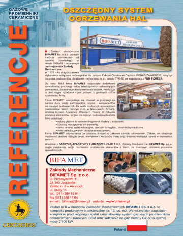 REFERENCJE GAZOWE PROMIENNIKI CERAMICZNE OSZCZĘDNY SYSTEM OGRZEWANIA HAL Zakłady Mechaniczne BIFAMET Sp. z o.o. przejęły tradycje produkcyjne od zakładu powstałego w latach 1966-68 i nazwanego Jędrzejowskie Zakłady Mechaniczne. W 1976 roku dotychczasowy wykonawca wyłącznie podzespołów dla potrzeb Fabryki Obrabiarek Ciężkich PONAR-ZAWIERCIE, dołączył do grona producentów obrabiarek - wykonując m. in. tokarki TPK-80 we współpracy z FUM PORĘBA. Od roku 1983 firma BIFAMET rozpoczęła dodatkowo samodzielną produkcję osłon teleskopowych osłaniających prowadnice, dla różnego asortymentu obrabiarek. Produkcja ta jest ciągle rozwijana i jest jednym z głównych celów działalności firmy. Firma BIFAMET specjalizuje się również w produkcji na bardzo dużą skalę podzespołów, części i komponentów do maszyn budowlanych dla wielu czołowych europejskich producentów takich maszyn m.in. w Niemczech, Szwecji, Wielkiej Brytanii, Szwajcarii, Włoszech, Francji. W zakresie produkcji elementów i części do maszyn budowlanych oferta firmy obejmuje : • bębny gładkie do walców drogowych i bębny z ubijakami, • korpusy maszyn oraz ich elementy, • ramy, jarzma, wałki wibracyjne, czerpaki i chwytaki, zbiorniki hydrauliczne, • inne części spawane i obrabiane maszynowo. Firma BIFAMET współpracuje ze znanymi firmami w zakresie obróbki skrawaniem. Zakres ten obejmuje możliwość obróbki różnych detali, elementów i korpusów małej oraz średniej wielkości, nawet w niewielkich seriach. BIFA MET Wspólnie z FABRYKĄ APARATURY I URZĄDZEŃ FAMET S.A. Zakłady Mechaniczne BIFAMET Sp. zo.o. ciągle zwiększają swoje możliwości produkcyjne elementów z blach, ze znacznym udziałem procesów spawalniczych. Zakłady Mechaniczne BIFAMET Sp. z o.o. ul. Przemysłowa 11, 28-300 Jędrzejów Zakład nr II w Annopolu, ul. Skały 15 tel. (041) 386 18 61 fax (041) 386 18 64 e-mail : [email protected] website : www.bifamet.pl Zakład nr II w Annopolu Zakładów Mechanicznych BIFAMET Sp. z o.o to kompleks produkcyjny o powierzchni ok. 13 tyś. m2. We wszystkich częściach kompleksu produkcyjnego został zainstalowany system gazowych promienników ceramicznych i rurowych SBM oraz kotłownia na gaz ziemny GZ-50 o łącznej mocy 2’106 kW. Poland BIFA MET Zakłady Mechaniczne BIFAMET Sp. z o.o. ul. Przemysłowa 11, 28-300 Jędrzejów Zakład nr II w Annopolu, ul. Skały 15 tel. (041) 386 18 61 fax (041) 386 18 64 e-mail : [email protected] www.bifamet.pl Dane techniczne dla 1 nawy hali produkcyjnej : 2 448 m2 Powierzchnia całkowita : 102 m Długość nawy : 24 m Szerokość nawy : na wysokości 6m Suwnica : Temperatura komfortu : + 16° C przy – 16° C Konstrukcja nośna betonowa Konstrukcja hali : OPIS INSTALACJI 8m SYSTEMU 7m PROMIENNIKÓW : 24 m Projekt instalacji promienników dla kompleksu produkcyjnego obejmuje: • 61 szt. promienników ceramicznych B64-2SX (każdy o mocy 27 kW) • 16 szt. promienników ceramicznych B32 SX (każdy o mocy 13,5 kW) • 4 szt. promienników rurowych TSU 33 (każdy o mocy 30 kW) Cały system podzielono na 15 niezależnych stref grzewczych. Podział na strefy umożliwia niezależne sterowanie temperaturą i ogrzewanie wybranych powierzchni do zadanej temperatury. Dostawca gazu Polskie Górnictwo Naftowe i Gazownictwo SA Oddział Handlowy Gazownia Tarnowska, ul. Wita Stwosza 7, 33-100 Tarnów Tel. : (0-14) 632 38 00 • Fax. : (0-14) 632 38 11 www.pgnig.pl Dostawca i dystrybutor promiennników CENTAURUS Sp. zo.o. www.centaurus.com.pl ul. Jaśkowa Dolina 8/5, 80-252 Gdańsk Tel. : (058) 762 96 40, 762 96 41 • Fax. : (058) 762 96 42 e-mail: [email protected] Producent promienników SBM International 3 Cottages de la Norge 21490 Clenay, FRANCE Tel : (+33) 3 80 76 74 84 • Fax : (+33) 3 80 76 74 89 e-mail : [email protected] www.sbm-international.net Copyright © 10/2008 • SBM Publi-production 25022649 • All rights reserved REFERENCJE GAZOWE PROMIENNIKI CERAMICZNE