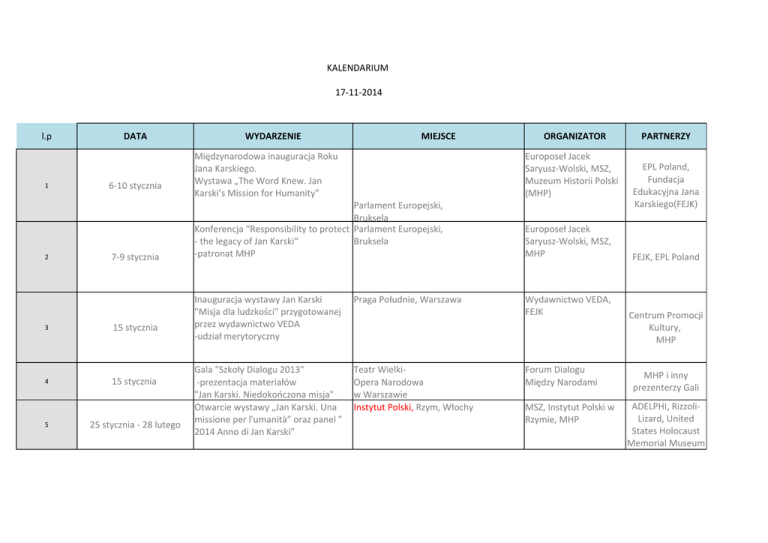 KALENDARIUM 17-11-2014 l.p 1 2 DATA 6-10 stycznia 7-9 stycznia 3 15 stycznia 4 15 stycznia 5 25 stycznia - 28 lutego WYDARZENIE MIEJSCE ORGANIZATOR Międzynarodowa inauguracja Roku Jana Karskiego. Wystawa „The Word Knew. Jan Karski’s Mission for Humanity" Europoseł Jacek Saryusz-Wolski, MSZ, Muzeum Historii Polski (MHP) Parlament Europejski, Bruksela Konferencja “Responsibility to protect Parlament Europejski, - the legacy of Jan Karski“ Bruksela -patronat MHP Europoseł Jacek Saryusz-Wolski, MSZ, MHP Inauguracja wystawy Jan Karski "Misja dla ludzkości" przygotowanej przez wydawnictwo VEDA -udział merytoryczny Praga Południe, Warszawa Gala "Szkoły Dialogu 2013" -prezentacja materiałów "Jan Karski. Niedokończona misja" Otwarcie wystawy „Jan Karski. Una missione per l'umanità” oraz panel ” 2014 Anno di Jan Karski” Teatr WielkiOpera Narodowa w Warszawie Instytut Polski, Rzym, Włochy Wydawnictwo VEDA, FEJK Forum Dialogu Między Narodami MSZ, Instytut Polski w Rzymie, MHP PARTNERZY EPL Poland, Fundacja Edukacyjna Jana Karskiego(FEJK) FEJK, EPL Poland Centrum Promocji Kultury, MHP MHP i inny prezenterzy Gali ADELPHI, RizzoliLizard, United States Holocaust Memorial Museum 6 27 stycznia - 13 lutego 7 29 stycznia 8 9 10 7 lutego 20 lutego 21-23 lutego 11 28 lutego-15 marca 12 1-31 marca 13 6 marca Otwarcie wystawy “LE MONDE SAVAIT – La mission de Jan Karski pour l’Humanité” Siedziba UNESCO, Paryż Projekcja filmu Martina Smitha o Janie Centralna Synagoga w Londynie Karskim “Messenger from Poland” Gościnny wykład Profesora Luchi Bernardiniego o Janie Karskim -dostarczenie materiałów merytorycznych Promocja książki "Fotobiografia Jan Karski" -udział w panelu dyskusyjnym o Janie Karskim Projekt "Pamięć dla Przyszłości" "Jan Karski- Sprawiedliwy wśród Narodów Świata" -udział merytoryczny w projekcie -wykład otwierający Centrum Polonicum UW, Warszawa Otwarcie wystawy "Jan Karski. Człowiek wolności" Centrum Synagoga, Zamość Wystawa o Janie Karskim w oparciu o materiały MHP i własne MSZ, Instytut Polski w Paryżu, Ambasada RP w Paryżu, Stałe Przedstawicielstwo RP przy UNESCO, MHP MSZ, Ambasada RP w Londynie Centrum Polonicum UW MHP Muzeum Historii Żydów Polskich (MHŻP), Wydawnictwo VEDA, Warszawa FEJK Sulejówek, ośrodek ORE Ośrodek Rozwoju Edukacji, MHP, Stowarzyszenie "Dzieci Holocaustu", MHŻP, Żydowski Instytut Żydowski (ŻIH) Fundacja Ochrony Dziedzictwa Żydowskiego(FODŻ), MHP PBW w Zielonej Górze, MHP Pedagogiczna Biblioteka Wojewódzka(PBW) im. Marii Grzegorzewskiej w Zielonej Górze Obchody Europejskiego Dnia Pamięci Dom Spotkań z Historią(DSH), Warszawa DSH o Sprawiedliwych Konferencja prasowa: upamiętnienie Jana Karskiego Warsztaty edukacyjne dla nauczycieli i uczniów -udział merytoryczny MHP, MHŻP MHP MHP 14 6 marca 15 7-9 marca 16 10-21 marca 17 15 marca 18 19 16-30 marca 26 marca Udział w otwarciu wystawy "Z narażeniem życia -Polacy ratujący Żydów podczas Zagłady" oraz prezentacja pamiątek "Sprawiedliwych wśród Narodów Świata" VII Kongres Polskich Stowarzyszeń Studenckich/Polish Oxford Union Panel dyskusyjny „Why should we study Poland” - dostarczenie materiałów merytorycznych Muzeum Historii Żydów Polskich, Warszawa MHŻP, DSH MHP Budynek Oxford U., Wielka Brytania FEJK, Ambasada RP w Londynie MHP Otwarcie wystawy „ La mission de Jan Liceum Montaigne, Paryż Karski pour l’Humanité” Warsztaty. Pakiet edukacyjny "Karski i MHP, Warszawa jego czasy" Instytut Polski w Paryżu, MHP MHP Otwarcie wystawy "Jan Karski. Człowiek wolności" MBP im. A. Próchnika, MHP Czytelnia dla Dorosłych Miejska Biblioteka Publiczna(MPB), Piotrków Trybunalski Panel poświęcony Janowi Karskiemu Budynek Stiftung Denkmal Berlin, i Witoldowi Pileckiemu z udziałem T. Niemcy Snydera i G. Gnaucka - udział merytoryczny MSZ, Instytut Polski w Berlinie, Fundacja Pomordowanych Żydów Europy, MHP Panel o Janie Karski na festiwalu Kino Sao Jorge, Lizbona, Portugalia filmów i kultury żydowskiej w Lizbonie 20 21 22 27-30 marca 29-30 marca 2 kwietnia 2-21 kwietnia 23 Ambasada RP w Lizbonie, Lisbon Jewish Film and Cultural Festival, VEDA, FEJK Targi Kielce- Spotkanie miłośników Kielce historii, rekonstrukcji historycznych, militariów - prezentacja materiałów o Janie Karskim Targi Kielce Nadanie sztandaru szkole Gimnazjum Miejski Dom Kultury(MDK),Ruda Śląska nr 14. im. Prof.. Jana Karskiego Spotkanie szkół z Rudy Śląskiej, Kielc, Łodzi MDK Otwarcie wystawy „Jan Karski. Una missione per l'umanità” MSZ, Konsulat RP w Mediolanie. Stowarzyszenie Polaków w Udine Polonik, Instytut Polski w Rzymie, MHP Galeria Tina Moddoti, Udine,Włochy MHP MHP MHP 24 7-30 kwietnia 25 7 kwietnia - 17 kwietnia 26 8 kwietnia 27 9 kwietnia 28 10 kwietnia 29 10 kwietnia 30 10-11 kwietnia 31 14 kwietnia 32 15 kwietnia Otwarcie wystawy "Jan Karski. Człowiek wolności" Muzeum Historii Miasta Zduńska Wola(MHM) MHM Zduńska Wola, MHP Otwarcie wystawy „La mission de Jan Karski pour l’Humanité” Seminarium : "Jak Karski - humanity's hero - the Polish Secret Agent, Wartime Emissary and the First Witness of the Holocaust projekcja filmów o Janie Karskim Warsztaty. Pakiet edukacyjny "Jan Karski i jego czasy" Pokazy filmowe "Emisariusze" "Wysłannik z Polski" oraz fragmenty wywiadu C. Lanzmanna z Karskim Koncert dedykowany Janowi Karskiemu podczas Wielkanocnego Festiwalu Ludviga van Beethovena Panel o Janie Karskim, projekcja filmów - udział i oprawa graficzna Uniwersytet Grenoble Instytut Polski w Paryżu (IP), MHP Ambasada RP w Hadze, sekcja polska Slawistyki Uniwersytetu Amsterdamskiego, MHP Inauguracja wznowienia "Tajnego Państwa" Konferencja prasowa -patronat MHP Gra miejska „Karski. Misja 1942 r." Kraków/Warszawa Uniwersytet Amsterdamski Warszawa MHP Warszawa BUW, MHP Filharmonia Narodowa FEJK, Stowarzyszenie im. Ludwiga van Beethovena "Polonik" MSZ, MHP Biblioteka Joppi, Udine, Włochy Warszawa Wydawnictwo ZNAK, 