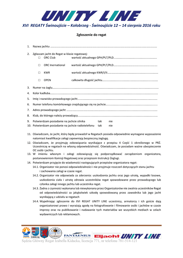 XVI REGATY Świnoujście – Kołobrzeg - Świnoujście 12 – 14 sierpnia 2016 roku Zgłoszenie do regat 1. Nazwa jachtu ………………………………………………………………………………………………………………….………………… 2. Zgłaszam jacht do Regat w klasie regatowej: □ ORC Club wartość aktualnego GPH/PLT/PLD........................................................ □ ORC Inernational wartość aktualnego GPH/PLT/PLD…………………………………………….………. □ KWR wartość aktualnego KWR/I/II…………….................................................... □ OPEN całkowita długość jachtu........................................................................ 3. Numer na żaglu......................................................................................................................................... 4. Kolor kadłuba........................................................................................................................................... 5. Imię i nazwisko prowadzącego jacht....................................................................................................... 6. Numer telefonu komórkowego znajdującego się na jachcie................................................................... 7. Adres prowadzącego jacht ……………………………………………....................................................................... 8. Klub, do którego należy prowadzący....................................................................................................... 9. Potwierdzam posiadanie na jachcie silnika 10. Potwierdzam posiadanie na jachcie radiotelefonu tak tak nie nie 11. Oświadczam, że jacht, który będę prowadził w Regatach posiada odpowiednie wymagane wyposażenie natomiast kwalifikacje załogi zapewniają bezpieczną żeglugę. 12. Oświadczam, że przyjmuję zobowiązania wynikające z przepisu 4 Część 1 określonego w PRŻ. Uczestniczę w regatach na własną odpowiedzialność. Oświadczam, że posiadam ważne ubezpieczenie OC osób i jachtu. 13. W imieniu własnym i załogi zobowiązuję się podporządkować zarządzeniom organizatora, postanowieniom Komisji Regatowej oraz przepisom Instrukcji Żeglugi. 14. Potwierdzam przyjęcie do wiadomości następujących przepisów organizatora regat: 14.1. Organizator nie ponosi odpowiedzialności i nie przyjmuje roszczeń dotyczących stanu jachtu i zachowania załogi w czasie regat. 14.2. Organizator nie odpowiada za zderzenia: uszkodzenia jachtu oraz jego utratę, wypadki losowe, uszkodzenia ciała i utratę zdrowia uczestników regat spowodowane przez prowadzącego lub członka załogi innego jachtu lub uczestnika regat. 14.3. Żadna z czynności wykonana lub niewykonana przez Organizatorów nie zwalnia uczestników Regat od odpowiedzialności za jakąkolwiek szkodę spowodowaną przez zawodnika lub jego jacht wynikającą z udziału w regatach 14.4. Wypełniając zgłoszenie do XVI REGAT UNITY LINE uczestnicy, armatorzy i ich goście dają organizatorowi prawo i wyrażają zgodę na fotografowanie i filmowanie osób i jachtów w czasie imprezy oraz na publikowanie i nadawanie tych materiałów we wszystkich mediach w celach wydawniczych lub reklamowych. Sędzia Główny Regat Izabella Kidacka, licencja 771, nr telefonu 781-514-121 XVI REGATY Świnoujście – Kołobrzeg - Świnoujście 12 – 14 sierpnia 2016 roku 15. Dane organizacyjne 15.1. Roku budowy i typ jachtu……………………………………………………………............................................……… 15.2 Długość całkowita…………………………………...............................................................................…………… 15.3. Szerokość………………………………………………………………………………………….…………………………….……...…….. 15.4. Zanurzenie………………...………………………..…………………………………………..…………………..………...……………. 15.5. Bandera……………………………..………………………………………………………………….………..………………….……...… 16. Właściciel jachtu 16.1. Imię i nazwisko …….............……………………………………………………………….……………...........…….…………… 16.2. Adres i numer telefonu….....……………………………………………………………..……………...…..………………..…… 16.3. Adres email proszę podawać tylko wtedy, gdy właściciel adresu wyraża zgodę na dołączenie adresu do listy mailingowej XVI Regat UNITY LINE....……………………………………………………...…..………………..…… 17. Lista załogi L.p. 1 2 3 4 5 6 7 8 9 10 Imię i nazwisko .................................................. Miejscowość i data numer telefonu …………………………………….….................... Czytelny podpis prowadzącego Jacht Załączniki: 1.Świadectwo pomiarowe ORC lub KWR 2. Potwierdzenie opłaty wpisowego Sędzia Główny Regat Izabella Kidacka, licencja 771, nr telefonu 781-514-121