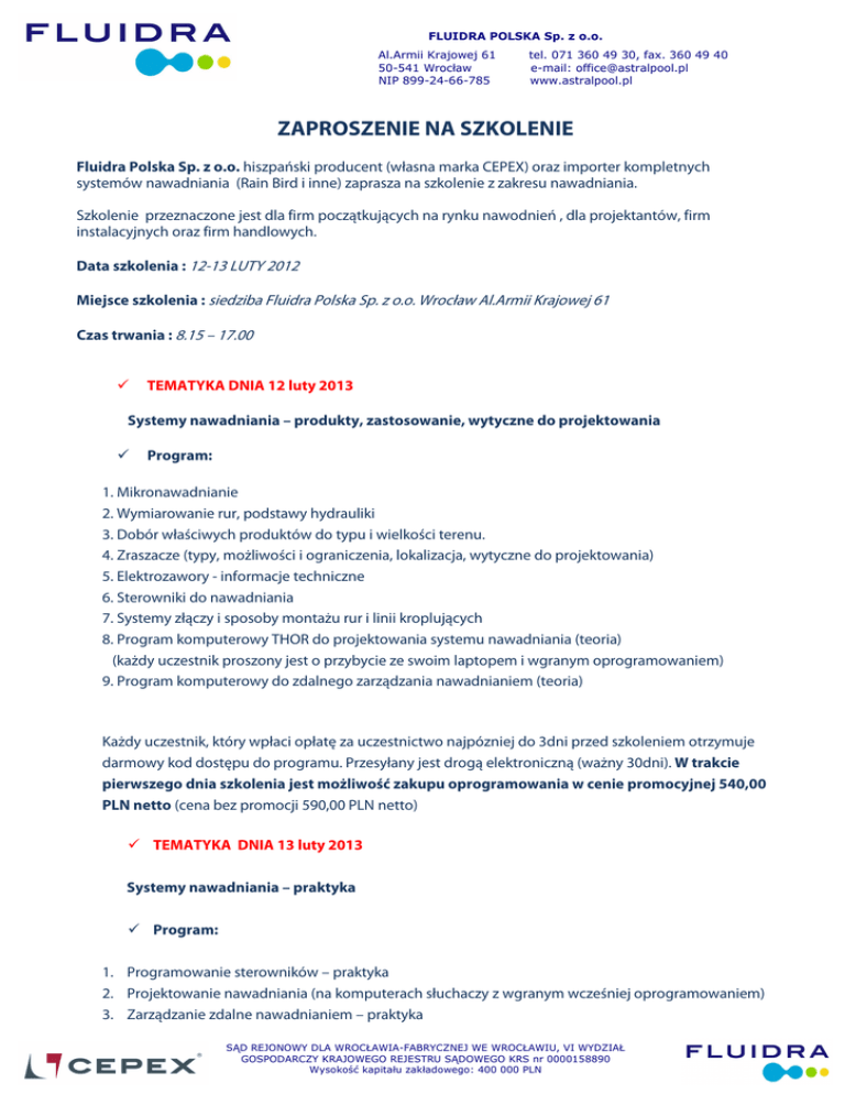FLUIDRA POLSKA Sp. z o.o. Al.Armii Krajowej 61 50-541 Wrocław NIP 899-24-66-785 tel. 071 360 49 30, fax. 360 49 40 e-mail: [email protected] www.astralpool.pl ZAPROSZENIE NA SZKOLENIE Fluidra Polska Sp. z o.o. hiszpański producent (własna marka CEPEX) oraz importer kompletnych systemów nawadniania (Rain Bird i inne) zaprasza na szkolenie z zakresu nawadniania. Szkolenie przeznaczone jest dla firm początkujących na rynku nawodnień , dla projektantów, firm instalacyjnych oraz firm handlowych. Data szkolenia : 12-13 LUTY 2012 Miejsce szkolenia : siedziba Fluidra Polska Sp. z o.o. Wrocław Al.Armii Krajowej 61 Czas trwania : 8.15 – 17.00 TEMATYKA DNIA 12 luty 2013 Systemy nawadniania – produkty, zastosowanie, wytyczne do projektowania Program: 1. Mikronawadnianie 2. Wymiarowanie rur, podstawy hydrauliki 3. Dobór właściwych produktów do typu i wielkości terenu. 4. Zraszacze (typy, możliwości i ograniczenia, lokalizacja, wytyczne do projektowania) 5. Elektrozawory - informacje techniczne 6. Sterowniki do nawadniania 7. Systemy złączy i sposoby montażu rur i linii kroplujących 8. Program komputerowy THOR do projektowania systemu nawadniania (teoria) (każdy uczestnik proszony jest o przybycie ze swoim laptopem i wgranym oprogramowaniem) 9. Program komputerowy do zdalnego zarządzania nawadnianiem (teoria) Każdy uczestnik, który wpłaci opłatę za uczestnictwo najpózniej do 3dni przed szkoleniem otrzymuje darmowy kod dostępu do programu. Przesyłany jest drogą elektroniczną (ważny 30dni). W trakcie pierwszego dnia szkolenia jest możliwość zakupu oprogramowania w cenie promocyjnej 540,00 PLN netto (cena bez promocji 590,00 PLN netto) TEMATYKA DNIA 13 luty 2013 Systemy nawadniania – praktyka Program: 1. Programowanie sterowników – praktyka 2. Projektowanie nawadniania (na komputerach słuchaczy z wgranym wcześniej oprogramowaniem) 3. Zarządzanie zdalne nawadnianiem – praktyka SĄD REJONOWY DLA WROCŁAWIA-FABRYCZNEJ WE WROCŁAWIU, VI WYDZIAŁ GOSPODARCZY KRAJOWEGO REJESTRU SĄDOWEGO KRS nr 0000158890 Wysokość kapitału zakładowego: 400 000 PLN FLUIDRA POLSKA Sp. z o.o. Al.Armii Krajowej 61 50-541 Wrocław NIP 899-24-66-785 tel. 071 360 49 30, fax. 360 49 40 e-mail: [email protected] www.astralpool.pl Uczestnicy drugiego dnia szkolenia są uprawnieni do zakupu programu w wyjątkowej cenie 470,00 PLN netto + licencja na każde kolejne stanowisko jedynie 50,00 PLN netto (cena detaliczna: 150,00 PLN netto). Informacje organizacyjne : 1.Szkolenie jest płatne: > 100,00 PLN netto / 1 osoba dzień pierwszy (12 luty) > 150,00 PLN netto / 1 osoba dzień drugi (13 luty) 2. Opłata zawiera : materiały informacyjne, obiad i przerwy kawowe, 3. Ilość miejsc ograniczona, liczy się kolejność zgłoszeń, 4. Opłaty należy przesyłać na konto firmy Fluidra Polska Sp. z o.o., najpóźniej 5 dni przed szkoleniem, 5. Uczestnicy szkolenia otrzymają na koniec fakturę za usługę szkoleniową i certyfikat o ukończeniu szkolenia, 6. W przypadku dokonania wpłaty tytułem szkolenia nie ma możliwości rezygnacji, wpłacone pieniądze nie podlegają zwrotowi. 7. Wypełniony formularz zgłoszeniowy prosimy przesłać faxem pod numer 071 360 49 40 lub pocztą elektroniczną na adres: [email protected] 8. W wypadku zbyt małego lub zbyt dużego zainteresowania, termin szkolenia i miejsce może ulec zmianie. Uczestnicy zostaną o tym fakcie poinformowani najpóźniej na 5 dni przed planowanym terminem szkolenia. Podajemy nasze numery kont bankowych do wpłat: RAIFFEISEN BANK POLSKA S.A o/ŚWIEBODZICE 61 1750 1309 0000 0000 0286 2735 PEKAO S.A o/WROCŁAW 65 1240 6801 1111 0000 5630 3434 BZ WBK S.A XII o/WROCŁAW 91 1090 2486 0000 0001 0380 5768 Z wyrazami szacunku Zespół FLUIDRA Polska Sp. z o.o. SĄD REJONOWY DLA WROCŁAWIA-FABRYCZNEJ WE WROCŁAWIU, VI WYDZIAŁ GOSPODARCZY KRAJOWEGO REJESTRU SĄDOWEGO KRS nr 0000158890 Wysokość kapitału zakładowego: 400 000 PLN