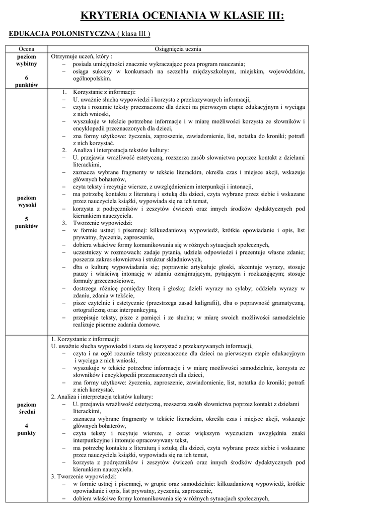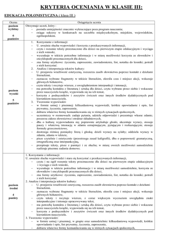 KRYTERIA OCENIANIA W KLASIE III: EDUKACJA POLONISTYCZNA ( klasa III ) Ocena poziom wybitny 6 punktów Osiągnięcia ucznia Otrzymuje uczeń, który : posiada umiejętności znacznie wykraczające poza program nauczania; osiąga sukcesy w konkursach na szczeblu międzyszkolnym, miejskim, wojewódzkim, ogólnopolskim. 1. poziom wysoki 5 punktów poziom średni 4 punkty Korzystanie z informacji: U. uważnie słucha wypowiedzi i korzysta z przekazywanych informacji, czyta i rozumie teksty przeznaczone dla dzieci na pierwszym etapie edukacyjnym i wyciąga z nich wnioski, wyszukuje w tekście potrzebne informacje i w miarę możliwości korzysta ze słowników i encyklopedii przeznaczonych dla dzieci, zna formy użytkowe: życzenia, zaproszenie, zawiadomienie, list, notatka do kroniki; potrafi z nich korzystać. 2. Analiza i interpretacja tekstów kultury: U. przejawia wrażliwość estetyczną, rozszerza zasób słownictwa poprzez kontakt z dziełami literackimi, zaznacza wybrane fragmenty w tekście literackim, określa czas i miejsce akcji, wskazuje głównych bohaterów, czyta teksty i recytuje wiersze, z uwzględnieniem interpunkcji i intonacji, ma potrzebę kontaktu z literaturą i sztuką dla dzieci, czyta wybrane przez siebie i wskazane przez nauczyciela książki, wypowiada się na ich temat, korzysta z podręczników i zeszytów ćwiczeń oraz innych środków dydaktycznych pod kierunkiem nauczyciela. 3. Tworzenie wypowiedzi: w formie ustnej i pisemnej: kilkuzdaniową wypowiedź, krótkie opowiadanie i opis, list prywatny, życzenia, zaproszenie, dobiera właściwe formy komunikowania się w różnych sytuacjach społecznych, uczestniczy w rozmowach: zadaje pytania, udziela odpowiedzi i prezentuje własne zdanie; poszerza zakres słownictwa i struktur składniowych, dba o kulturę wypowiadania się; poprawnie artykułuje głoski, akcentuje wyrazy, stosuje pauzy i właściwą intonację w zdaniu oznajmującym, pytającym i rozkazującym; stosuje formuły grzecznościowe, dostrzega różnicę pomiędzy literą i głoską; dzieli wyrazy na sylaby; oddziela wyrazy w zdaniu, zdania w tekście, pisze czytelnie i estetycznie (przestrzega zasad kaligrafii), dba o poprawność gramatyczną, ortograficzną oraz interpunkcyjną, przepisuje teksty, pisze z pamięci i ze słuchu; w miarę swoich możliwości samodzielnie realizuje pisemne zadania domowe. 1. Korzystanie z informacji: U. uważnie słucha wypowiedzi i stara się korzystać z przekazywanych informacji, czyta i na ogół rozumie teksty przeznaczone dla dzieci na pierwszym etapie edukacyjnym i wyciąga z nich wnioski, wyszukuje w tekście potrzebne informacje i w miarę możliwości samodzielnie, korzysta ze słowników i encyklopedii przeznaczonych dla dzieci, zna formy użytkowe: życzenia, zaproszenie, zawiadomienie, list, notatka do kroniki; potrafi z nich korzystać. 2. Analiza i interpretacja tekstów kultury: U. przejawia wrażliwość estetyczną, rozszerza zasób słownictwa poprzez kontakt z dziełami literackimi, zaznacza wybrane fragmenty w tekście literackim, określa czas i miejsce akcji, wskazuje głównych bohaterów, czyta teksty i recytuje wiersze, z coraz większym wyczuciem uwzględnia znaki interpunkcyjne i intonuje opracowywany tekst, ma potrzebę kontaktu z literaturą i sztuką dla dzieci, czyta wybrane przez siebie i wskazane przez nauczyciela książki, wypowiada się na ich temat, korzysta z podręczników i zeszytów ćwiczeń oraz innych środków dydaktycznych pod kierunkiem nauczyciela. 3. Tworzenie wypowiedzi: w formie ustnej i pisemnej, w grupie oraz samodzielnie: kilkuzdaniową wypowiedź, krótkie opowiadanie i opis, list prywatny, życzenia, zaproszenie, dobiera właściwe formy komunikowania się w różnych sytuacjach społecznych, poziom zadawalający 3 punkty poziom niski 2 punkty często uczestniczy w rozmowach: zadaje pytania, udziela odpowiedzi i prezentuje własne zdanie; poszerza zakres słownictwa i struktur składniowych, stara się dbać o kulturę wypowiadania się; na ogół poprawnie artykułuje głoski, akcentuje wyrazy, stosuje pauzy i właściwą intonację w zdaniu oznajmującym, pytającym i rozkazującym; zazwyczaj stosuje formuły grzecznościowe, dostrzega różnicę pomiędzy literą i głoską; na ogół poprawnie dzieli wyrazy na sylaby; oddziela wyrazy w zdaniu, zdania w tekście, pisze czytelnie i stara się pisać estetycznie (przestrzega zasad kaligrafii), zazwyczaj dba o poprawność gramatyczną, ortograficzną oraz interpunkcyjną, przepisuje teksty, pisze z pamięci i ze słuchu popełniając nieliczne błędy różnego rodzaju; w miarę swoich możliwości samodzielnie realizuje pisemne zadania domowe. 1. Korzystanie z informacji: U. czasami wyłącza się podczas wypowiedzi nauczyciela i dzieci; ma wtedy problem z wykorzystaniem przekazanych informacji, zazwyczaj czyta, ale nie zawsze w pełni rozumie teksty przeznaczone dla dzieci na pierwszym etapie edukacyjnym; czasem ma kłopot z wyciągnięciem właściwych wniosków, na ogół wskazuje w tekście potrzebne informacje czasem potrzebuje podpowiedzi i w miarę możliwości, nieraz z pomocą, korzysta ze słowników i encyklopedii przeznaczonych dla dzieci, zna formy użytkowe: życzenia, zaproszenie, zawiadomienie, list, notatka do kroniki; często potrafi z nich korzystać. 2. Analiza i interpretacja tekstów kultury: U. przejawia pewną wrażliwość estetyczną, stara się, choć z różnym skutkiem rozszerzać zasób słownictwa poprzez kontakt z dziełami literackimi, czasem potrzebuje wskazówek, by zaznaczyć wybrane fragmenty w tekście literackim, na ogół określa czas i miejsce akcji, oraz wymienia głównych bohaterów, teksty czyta z błędami, stara się recytować wiersze, nie zawsze uwzględniając znaki interpunkcyjne i właściwie intonując, ma potrzebę kontaktu z literaturą i sztuką dla dzieci, zazwyczaj czyta tylko wskazane przez nauczyciela książki, podejmuje próby wypowiedzi na ich