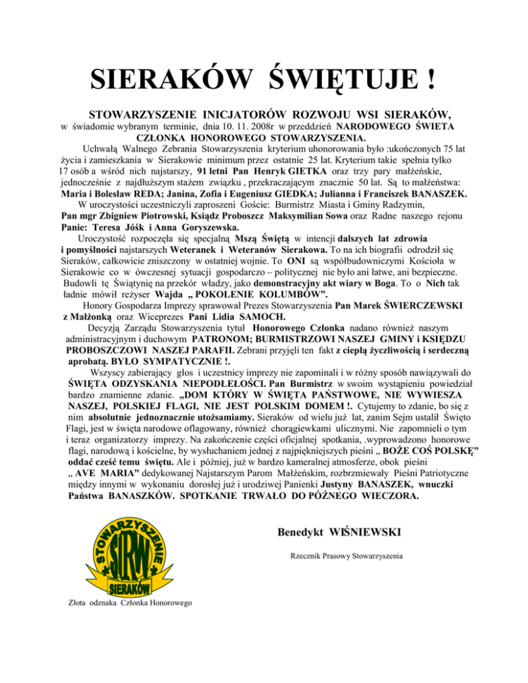 SIERAKÓW ŚWIĘTUJE ! STOWARZYSZENIE INICJATORÓW ROZWOJU WSI SIERAKÓW, w świadomie wybranym terminie, dnia 10. 11. 2008r w przeddzień NARODOWEGO ŚWIETA CZŁONKA HONOROWEGO STOWARZYSZENIA. Uchwałą Walnego Zebrania Stowarzyszenia kryterium uhonorowania było :ukończonych 75 lat życia i zamieszkania w Sierakowie minimum przez ostatnie 25 lat. Kryterium takie spełnia tylko 17 osób a wśród nich najstarszy, 91 letni Pan Henryk GIETKA oraz trzy pary małżeńskie, jednocześnie z najdłuższym stażem związku , przekraczającym znacznie 50 lat. Są to małżeństwa: Maria i Bolesław REDA; Janina, Zofia i Eugeniusz GIEDKA; Julianna i Franciszek BANASZEK. W uroczystości uczestniczyli zaproszeni Goście: Burmistrz Miasta i Gminy Radzymin, Pan mgr Zbigniew Piotrowski, Ksiądz Proboszcz Maksymilian Sowa oraz Radne naszego rejonu Panie: Teresa Jóśk i Anna Goryszewska. Uroczystość rozpoczęła się specjalną Mszą Świętą w intencji dalszych lat zdrowia i pomyślności najstarszych Weteranek i Weteranów Sierakowa. To na ich biografii odrodził się Sieraków, całkowicie zniszczony w ostatniej wojnie. To ONI są współbudowniczymi Kościoła w Sierakowie co w ówczesnej sytuacji gospodarczo – politycznej nie było ani łatwe, ani bezpieczne. Budowli tę Świątynię na przekór władzy, jako demonstracyjny akt wiary w Boga. To o Nich tak ładnie mówił reżyser Wajda „ POKOLENIE KOLUMBÓW”. Honory Gospodarza Imprezy sprawował Prezes Stowarzyszenia Pan Marek ŚWIERCZEWSKI z Małżonką oraz Wiceprezes Pani Lidia SAMOCH. Decyzją Zarządu Stowarzyszenia tytuł Honorowego Członka nadano również naszym administracyjnym i duchowym PATRONOM; BURMISTRZOWI NASZEJ GMINY i KSIĘDZU PROBOSZCZOWI NASZEJ PARAFII. Zebrani przyjęli ten fakt z ciepłą życzliwością i serdeczną aprobatą. BYŁO SYMPATYCZNIE !. Wszyscy zabierający głos i uczestnicy imprezy nie zapominali i w różny sposób nawiązywali do ŚWIĘTA ODZYSKANIA NIEPODŁEŁOŚCI. Pan Burmistrz w swoim wystąpieniu powiedział bardzo znamienne zdanie. „DOM KTÓRY W ŚWIĘTA PAŃSTWOWE, NIE WYWIESZA NASZEJ, POLSKIEJ FLAGI, NIE JEST POLSKIM DOMEM !. Cytujemy to zdanie, bo się z nim absolutnie jednoznacznie utożsamiamy. Sieraków od wielu już lat, zanim Sejm ustalił Święto Flagi, jest w święta narodowe oflagowany, również chorągiewkami ulicznymi. Nie zapomnieli o tym i teraz organizatorzy imprezy. Na zakończenie części oficjalnej spotkania, .wyprowadzono honorowe flagi, narodową i kościelne, by wysłuchaniem jednej z najpiękniejszych pieśni „ BOŻE COŚ POLSKĘ” oddać cześć temu świętu. Ale i później, już w bardzo kameralnej atmosferze, obok pieśni „ AVE MARIA” dedykowanej Najstarszym Parom Małżeńskim, rozbrzmiewały Pieśni Patriotyczne między innymi w wykonaniu dorosłej już i urodziwej Panienki Justyny BANASZEK, wnuczki Państwa BANASZKÓW. SPOTKANIE TRWAŁO DO PÓŹNEGO WIECZORA. Benedykt WIŚNIEWSKI Rzecznik Prasowy Stowarzyszenia Złota odznaka Członka Honorowego