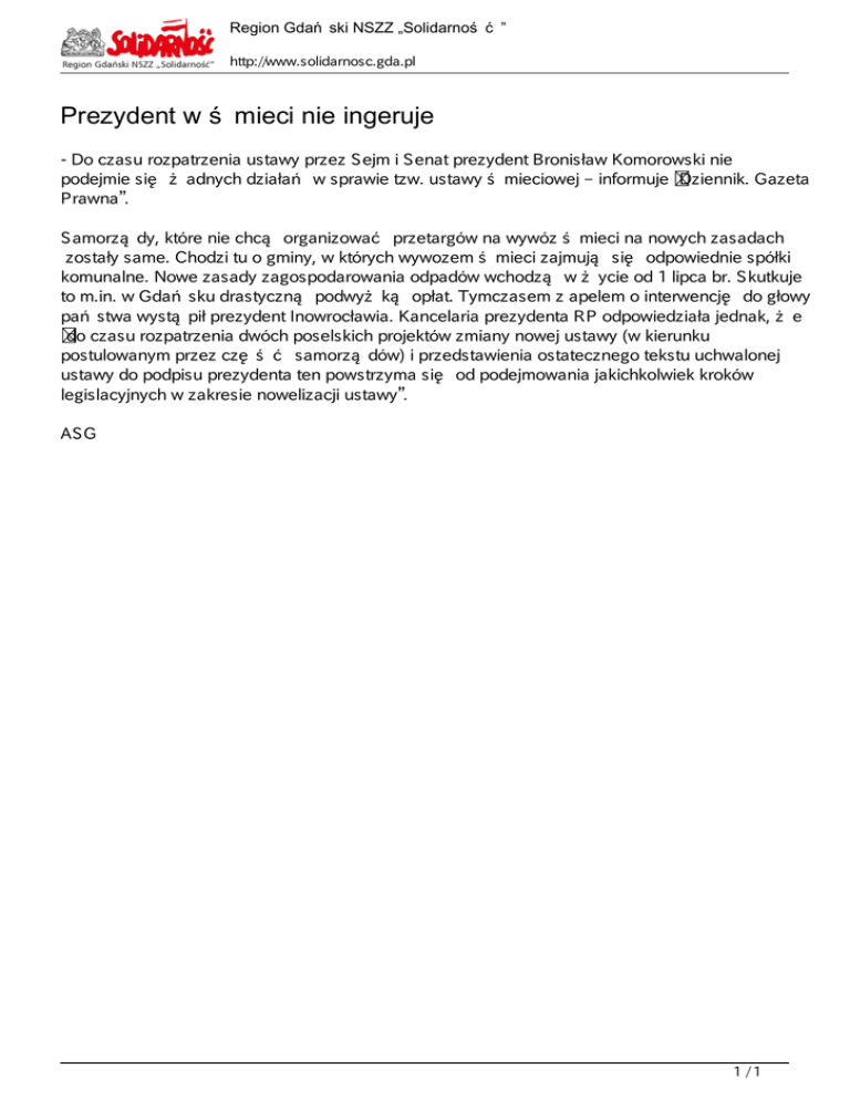 Region Gda ski NSZZ „Solidarno http://www.solidarnosc.gda.pl Prezydent w mieci nie ingeruje - Do czasu rozpatrzenia ustawy przez Sejm i Senat prezydent Bronisław Komorowski nie podejmie si adnych działa w sprawie tzw. ustawy mieciowej ‒ informuje „Dziennik. Gazeta Prawna . Samorz dy, które nie chc organizowa przetargów na wywóz mieci na nowych zasadach zostały same. Chodzi tu o gminy, w których wywozem mieci zajmuj si odpowiednie spółki komunalne. Nowe zasady zagospodarowania odpadów wchodz w ycie od 1 lipca br. Skutkuje to m.in. w Gda sku drastyczn podwy k opłat. Tymczasem z apelem o interwencj do głowy pa stwa wyst pił prezydent Inowrocławia. Kancelaria prezydenta RP odpowiedziała jednak, e „do czasu rozpatrzenia dwóch poselskich projektów zmiany nowej ustawy (w kierunku postulowanym przez cz samorz dów) i przedstawienia ostatecznego tekstu uchwalonej ustawy do podpisu prezydenta ten powstrzyma si od podejmowania jakichkolwiek kroków legislacyjnych w zakresie nowelizacji ustawy . ASG 1/1 Powered by TCPDF (www.tcpdf.org)